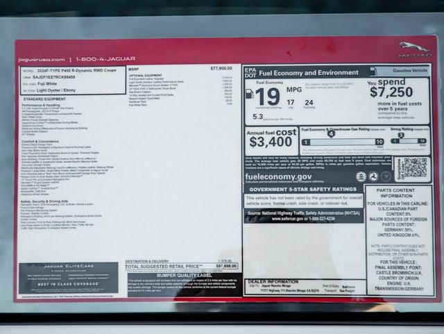 This 2024 Jaguar F-TYPE P450 R-Dynamic is far more than just a car; it is the embodiment of Jaguars commitment to exhilarating performance, timeless design, and luxurious refinement. Available at Jaguar Rancho Mirage, this vehicle offers an invitation to experience the thrill of a true luxury sports car that pushes the boundaries of excitement and elegance.
