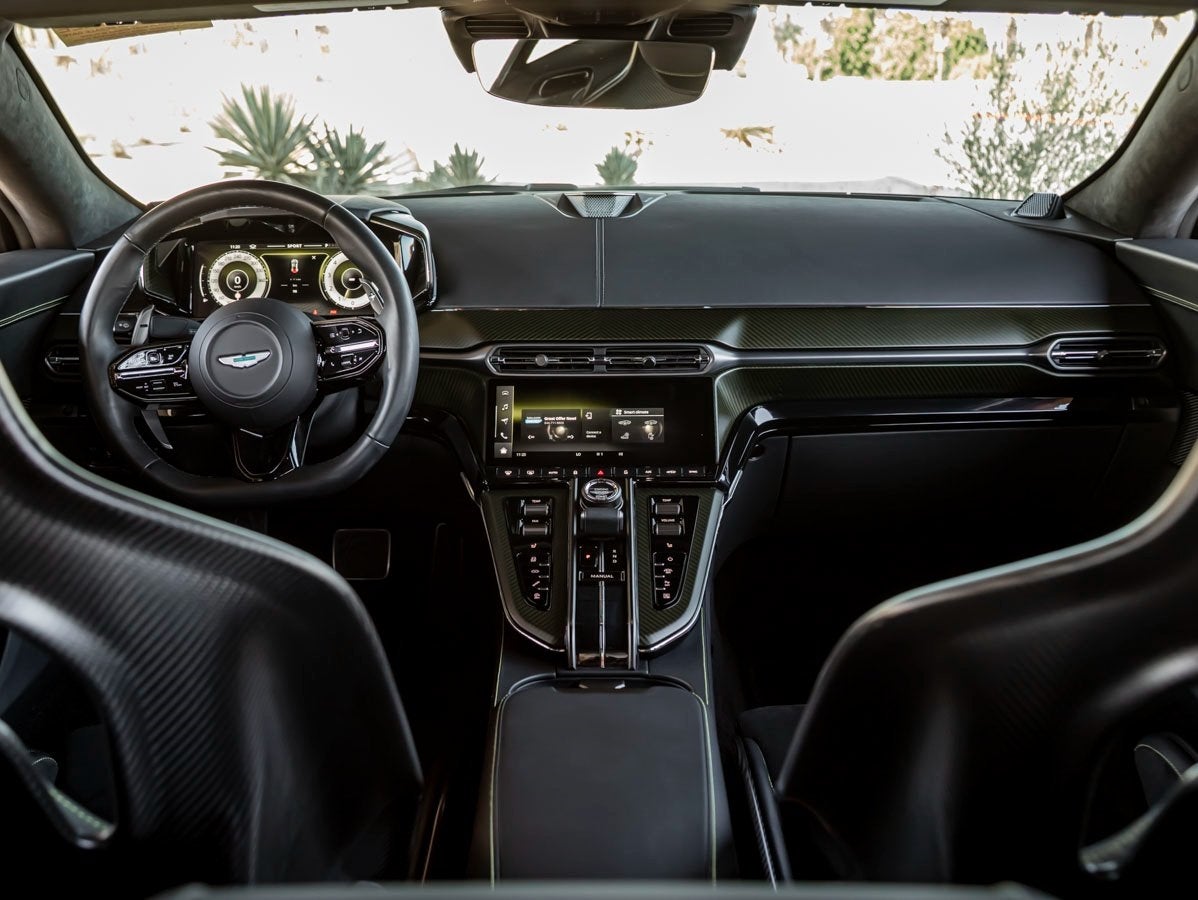 Step inside to a cabin meticulously appointed in Onyx Semi-Aniline Leather, elevated by the refined textures of Contemporary Alcantara and matching contemporary leather and carpet tones. The Leather Headlining envelops the interior in tailored luxury, while Headrest Embroidery featuring the Aston Martin Wings serves as a proud reminder of the brands legacy.