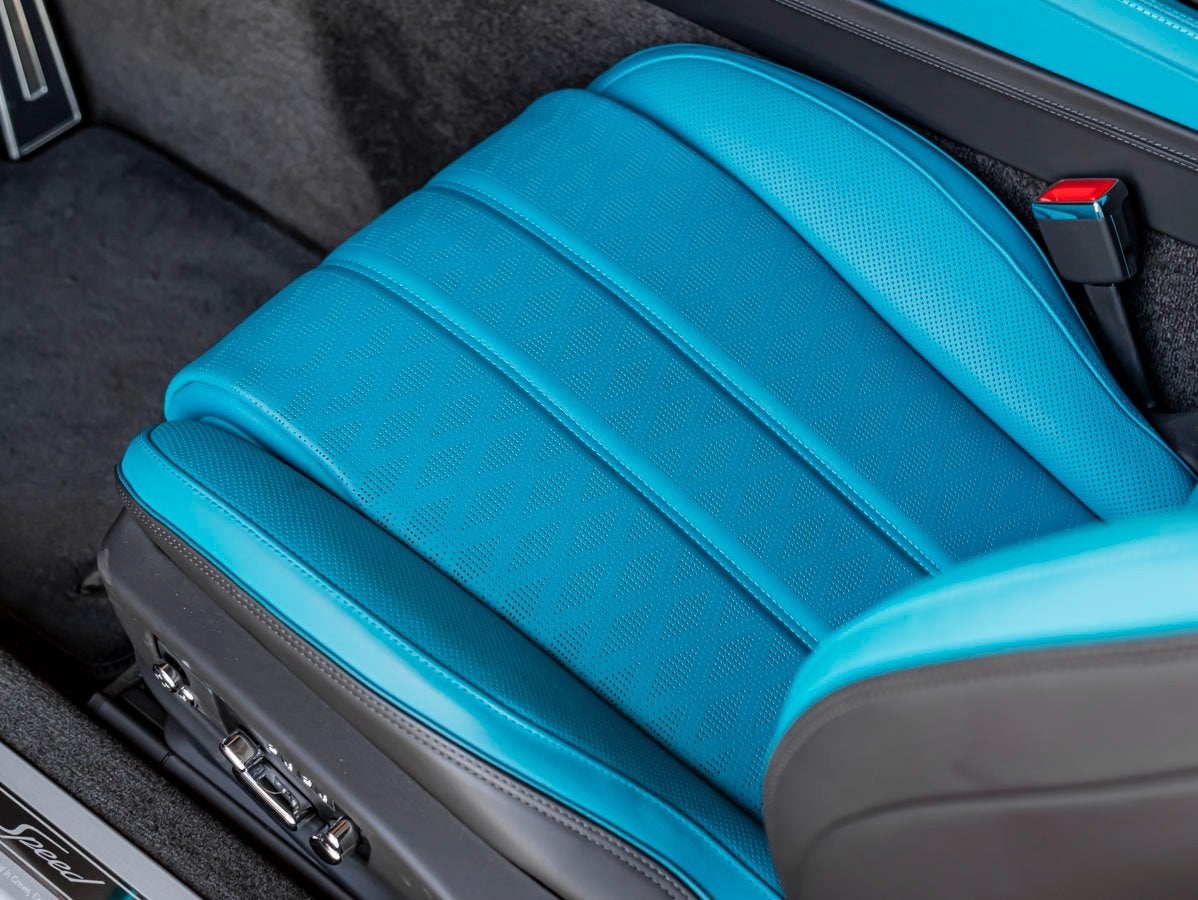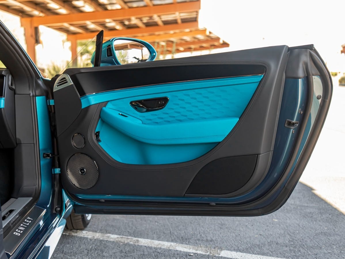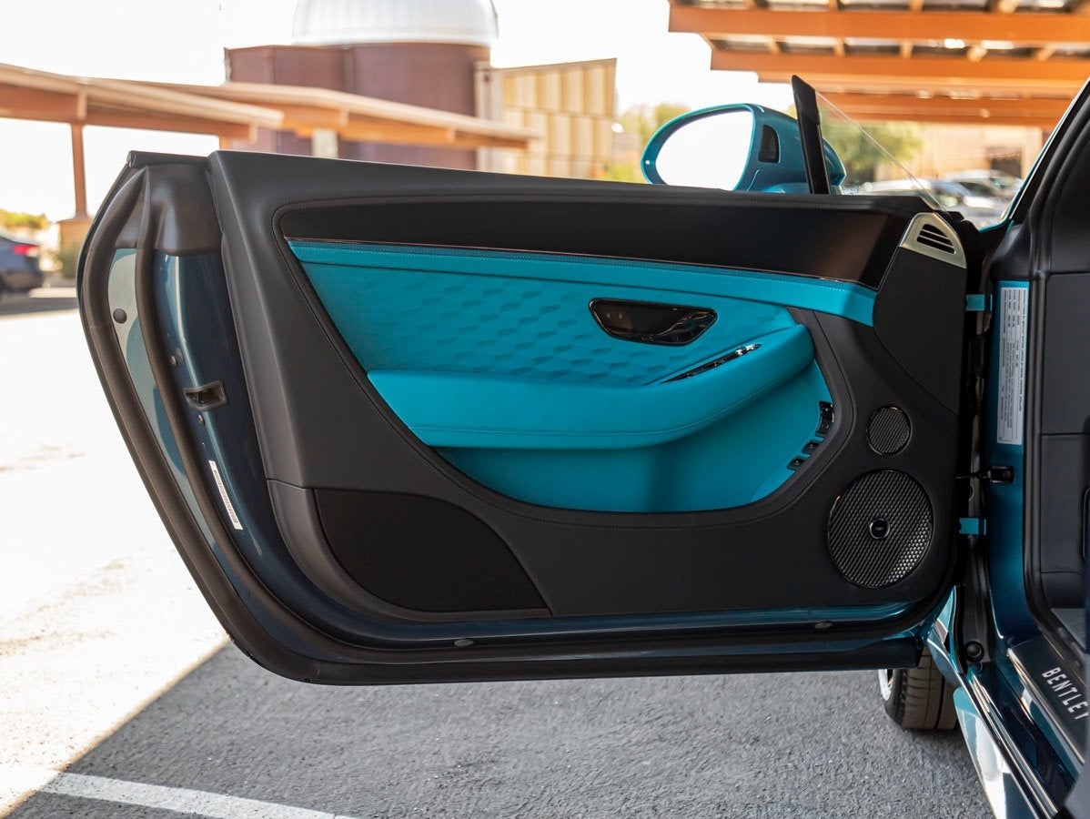 Inside, the cabin showcases the finest Bentley craftsmanship. The flowing Topaz Blue to Windsor Blue interior is elevated by the Indented Hide Headlining, Leather Specification, and plush Deep Pile Overmats - Front. The Dark Chrome Interior Specification adds a modern touch, while the Bentley Rotating Display offers a seamless blend of tradition and technology. The Front Seat Comfort Specification ensures ultimate relaxation, and the Naim for Bentley audio system delivers concert-level sound throughout the cabin.