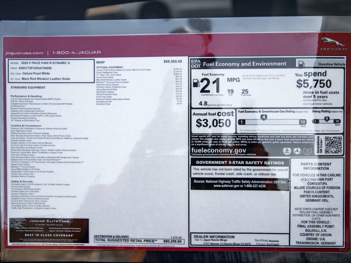 The 2025 Jaguar F-PACE P400 R-Dynamic S makes a bold statement with its sleek design and commanding presence. Featuring striking 21 Style 5105 Gloss Black Wheels, Gloss Black Roof Rails, and Red Brake Calipers, this SUV radiates a dynamic and sporty aesthetic. The addition of Front Fog Lamps and the Reduced Section Steel Spare Wheel enhances both practicality and safety, while the Ostuni Pearl White finish ensures that it stands out in any setting.