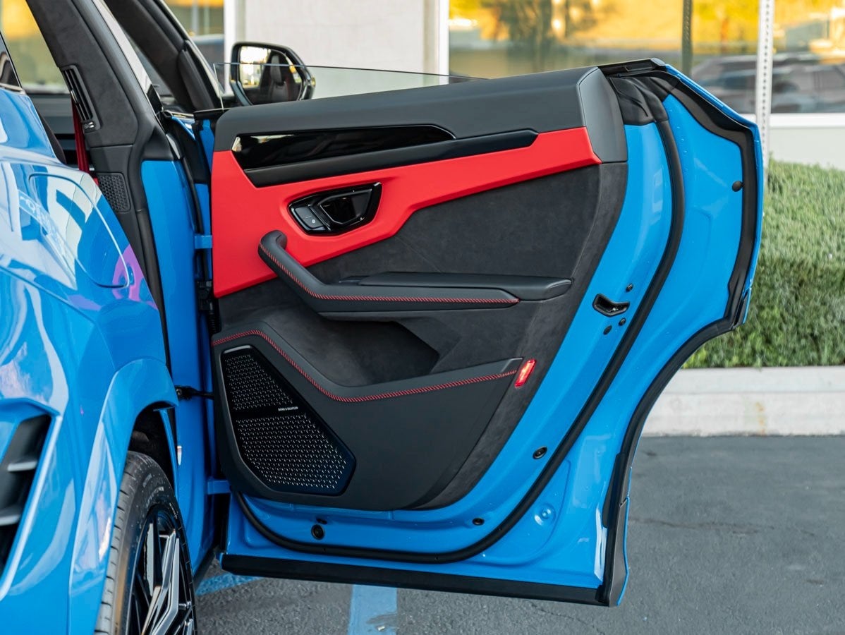Inside, the Nero Ade cabin features Bicolor Leather with Contrast Stitching, Rosso Alala Seat Belts, Cross Stitching, and an Embroidered Lamborghini Shield. The Interior Dark Package and Black Anodized Trim lend a stealthy, performance-focused vibe. Comfort meets style with Full Electric Front Seats, Floor Mats with Leather Piping, and Seats in Leather with Performante Design. The Sport Steering Wheel in Corsa Tex, Panoramic Roof, and Ambient Light Package elevate the driving environment.