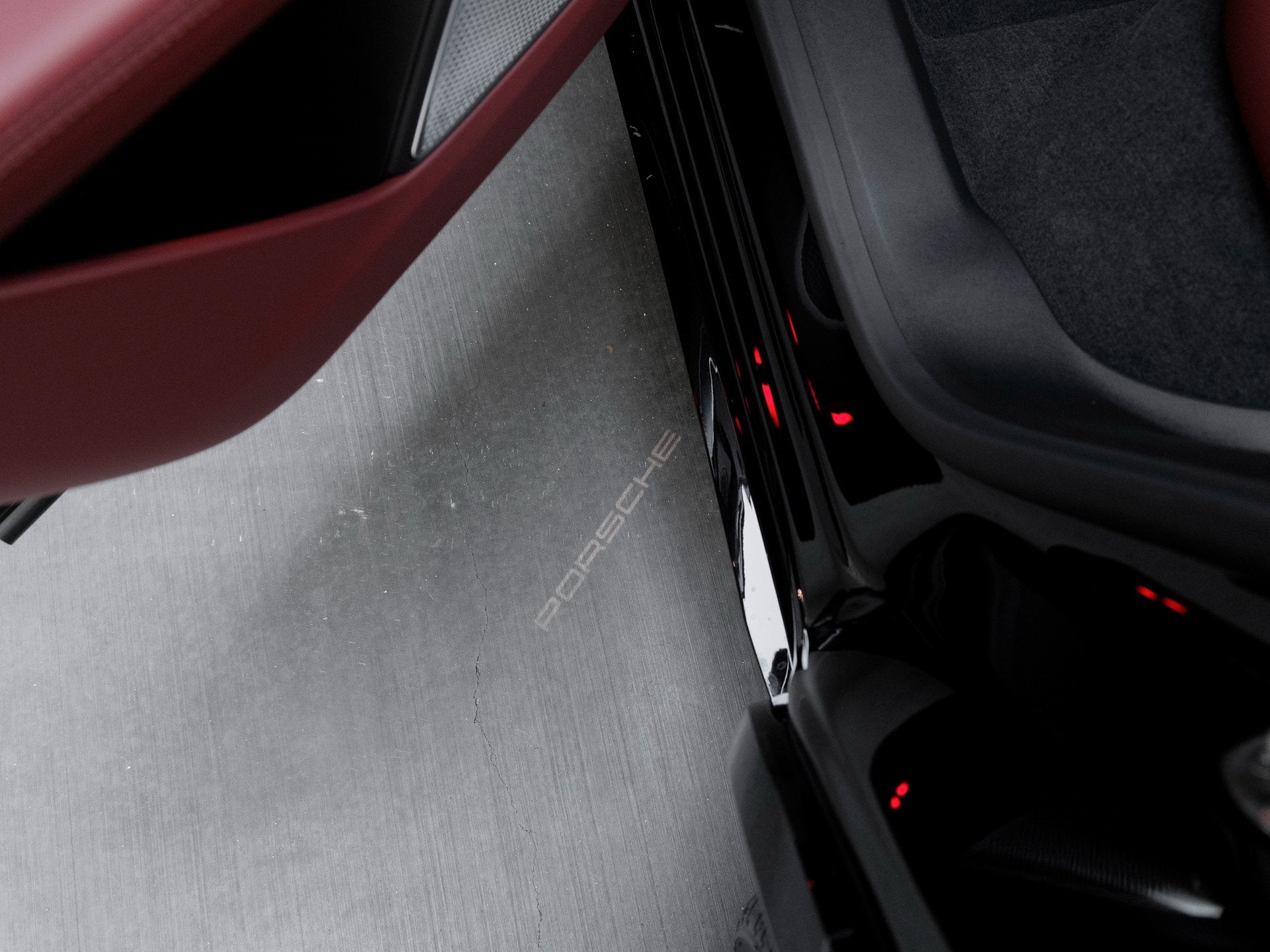 Step into the Black/Bordeaux Red cabin, where luxury meets innovation. The Heated GT Sport Steering Wheel in Leather with Carbon Fiber Inlays and PORSCHE Logo on Front Seats, Illuminated make a bold visual statement, while the Porsche Crest on Headrests (Front and Rear) adds a bespoke touch. Cutting-edge features include the Passenger Display, Augmented Reality Head-Up Display, and Burmester High-End Surround Sound System, creating an immersive and intuitive driving experience.