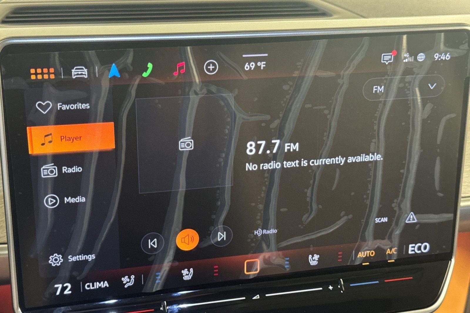 - Radio: Discover Pro Max w/Touchscreen Navigation -inc: 12.9 inch touchscreen multi-function center display w/backlit sliders, FM/HD Radio, WMA/MP3/FLAC media player w/voice control, Harman Kardon premium sound system w/13 speakers, subwoofer and amplifier, Bluetooth® connectivity (for compatible devices), SiriusXM w/360L (w/3-month free trial subscription; must accept SiriusXM terms), App-Connect smartphone integration (w/Apple CarPlay, Android Auto and MirrorLink) via USB, wireless App-Connect smartphone integration (for compatible devices) w/multi-phone pairing capability, capability for in-vehicle 4G LTE enabled Wi-Fi (cellular data plan required; includes limited trial), capability for VW Car-Net services (capabilities for certain services vary; requires enrollment or subscription) and Qi wireless inductive charger (for compatible mobile phones and accessories) in front row