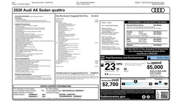 This 2026 Audi A6 3.0 quattro seamlessly combines executive luxury, performance, and innovation into one refined sedan. Now available at Audi Rancho Mirage, its ready to elevate every drive.