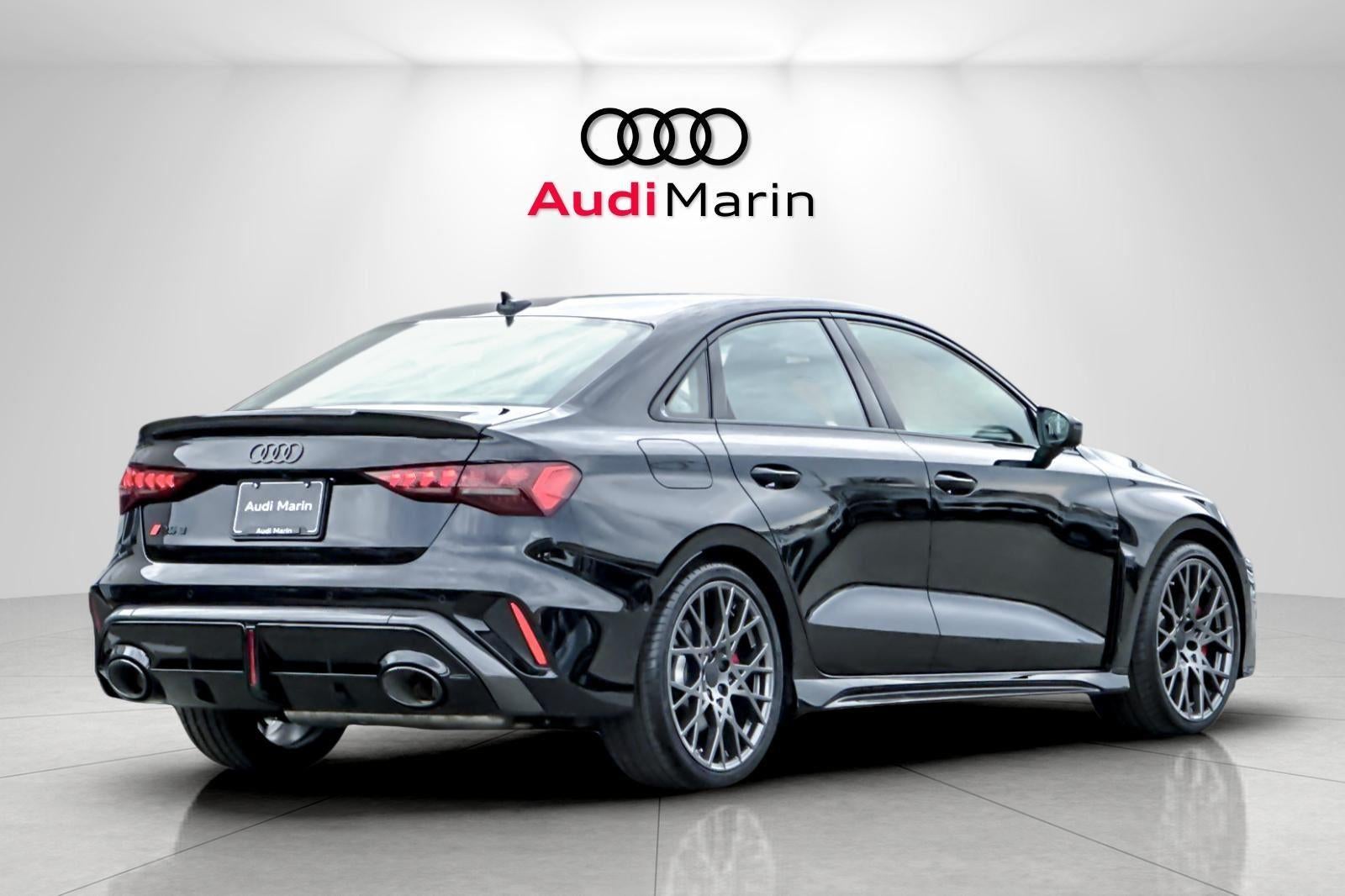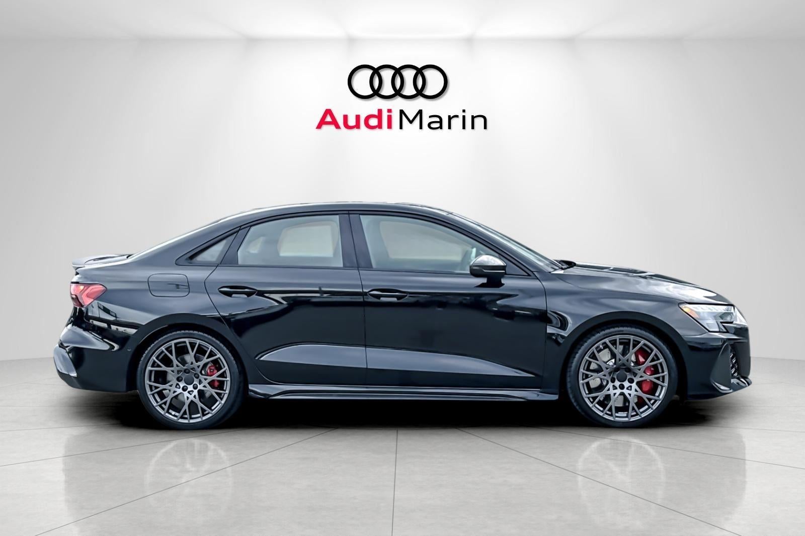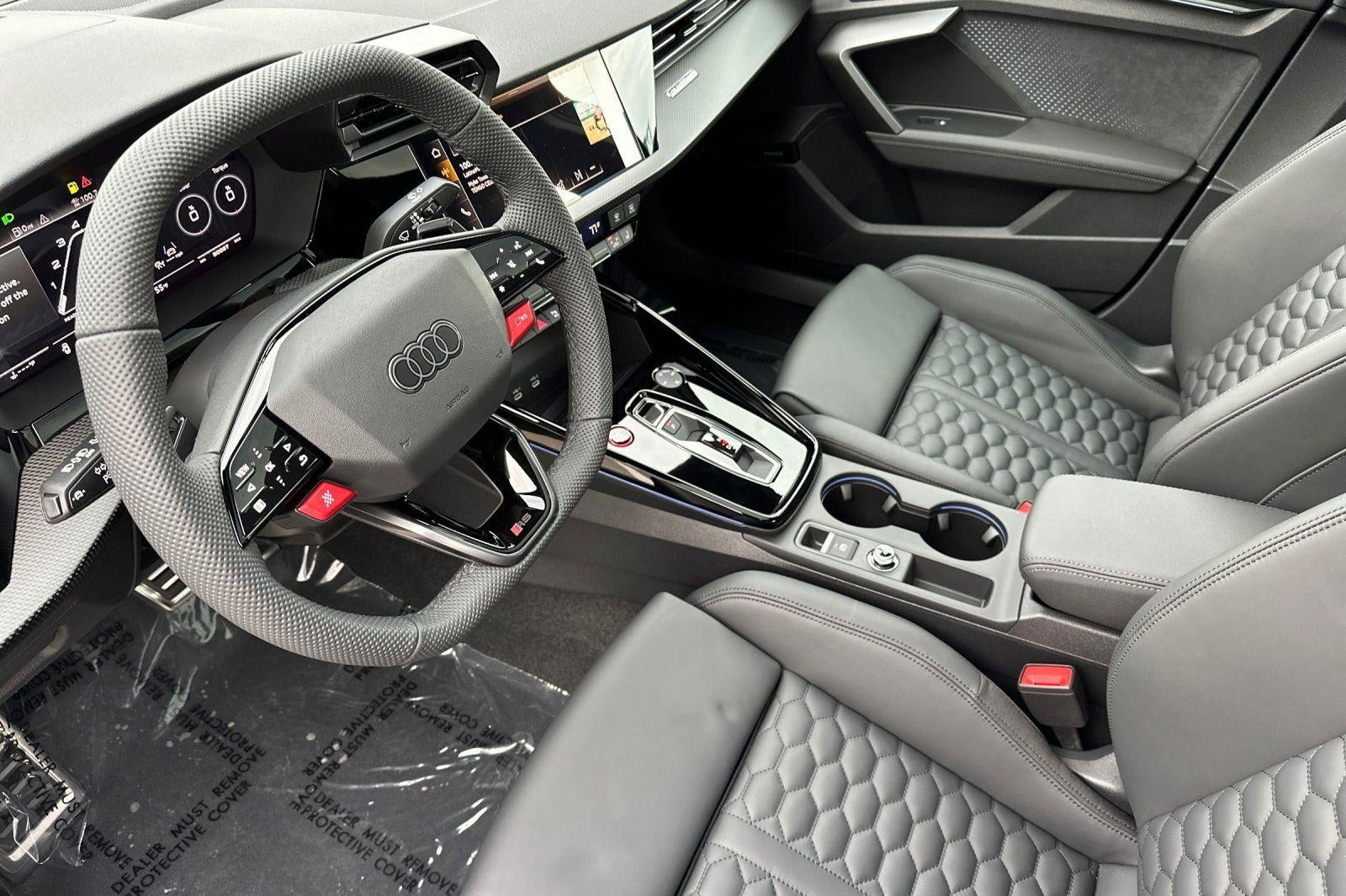 This New 2026 Audi RS 3 quattro, is mythos black metallic in color with a black with super black stitching interior. Stock Number TA901037. You can connect with us by calling 415-460-4100.