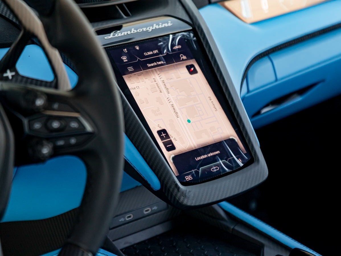 - Radio: Lamborghini Sound System -inc: 12.3" full TFT cockpit w/four different graphics, multimedia system w/8.4" TFT display, 9.1" passenger touchscreen, 2 woofers on doors, 2 tweeters on dashboard, USB interface, navigation system, Bluetooth®, connected services, Apple CarPlay and Android Auto
