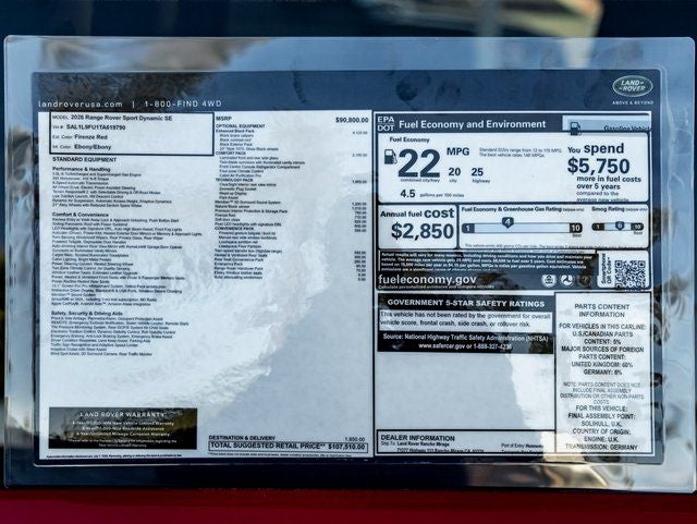 The bold styling of the 2026 Range Rover Sport Dynamic SE is amplified by the Enhanced Black Pack, adding stealthy visual accents that contrast beautifully with its vivid exterior. Precision-crafted details such as Soft Door Close and the refined Natural Black Veneer interior trim elevate its sense of quiet luxury. For ultimate convenience and everyday readiness, it comes equipped with the Range Rover Handover Pack, Premium Interior Protection and Storage Pack, and Rear Seat Convenience Pack, providing comfort and versatility for every drive.