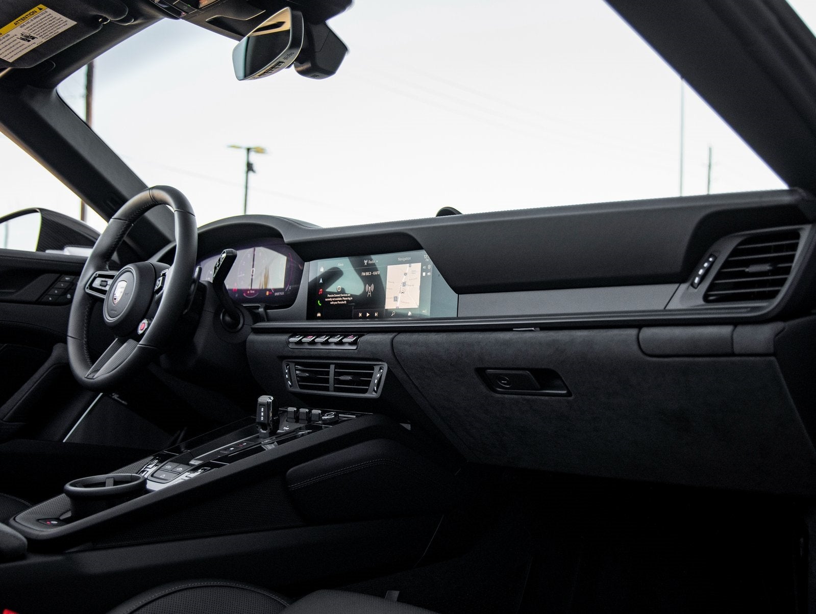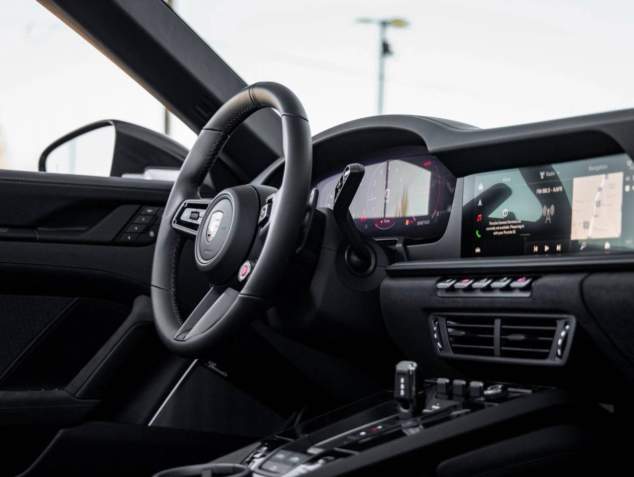 Inside, a Leather/Race-Tex Interior in Black with Seat Centers in Leather surrounds you in race-inspired luxury. Standout features include Interior Trim Inlays in Matte Carbon Fiber, Adaptive Sport Seats Plus (18-way), Seat Belts in Guards Red, and a Heated GT Sport Steering Wheel in Leather with Trim in Matte Carbon Fiber. Details like the Race-Tex Sun Visors, Porsche Crest on Headrests, and Center Console Lid with Porsche Crest reinforce the premium ambiance.