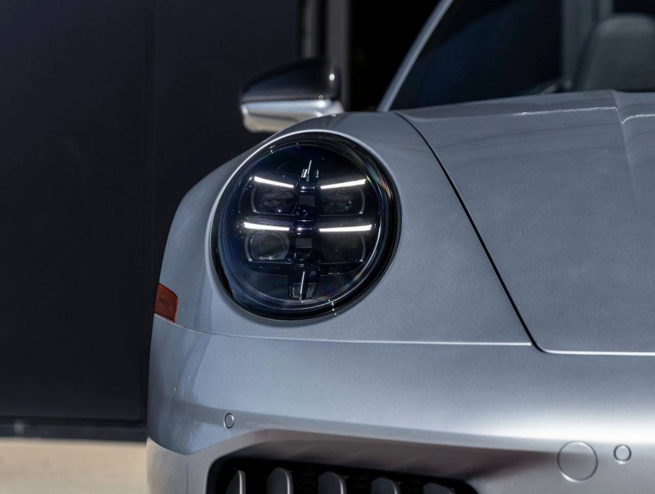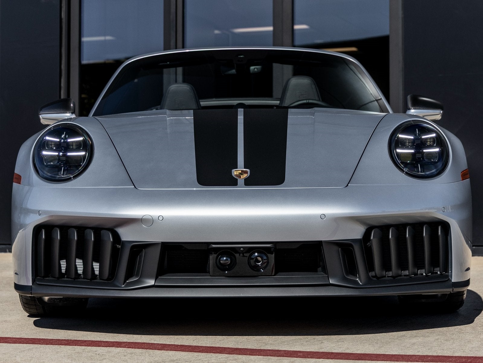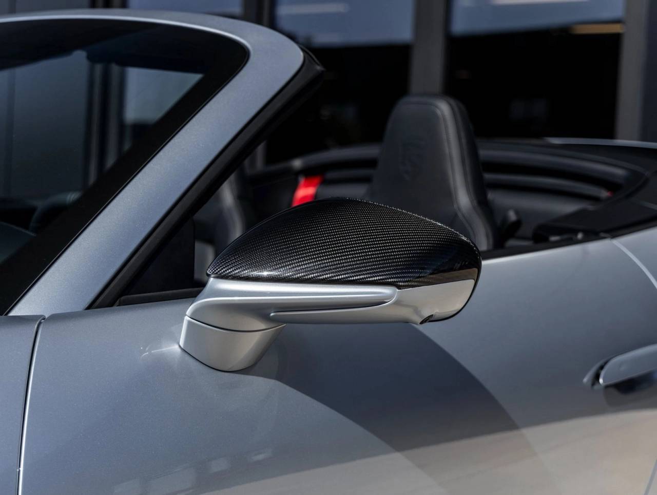 The 911 Carrera GTS Cabriolet impresses with its 20/21 RS Spyder Wheels, HD-Matrix Design LED Headlights in Black, and Double Stripe Decal on the Front Trunk Lid that complements the Black Cabriolet Roof with Grey Double Stripes. The Exterior Mirror Upper Trims in Carbon Fiber and Engine Compartment Cover in Titanium Grey further elevate its sporty design.