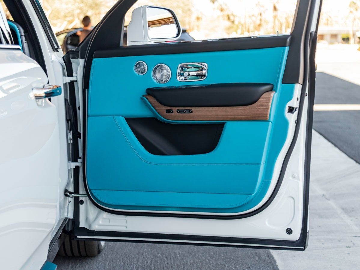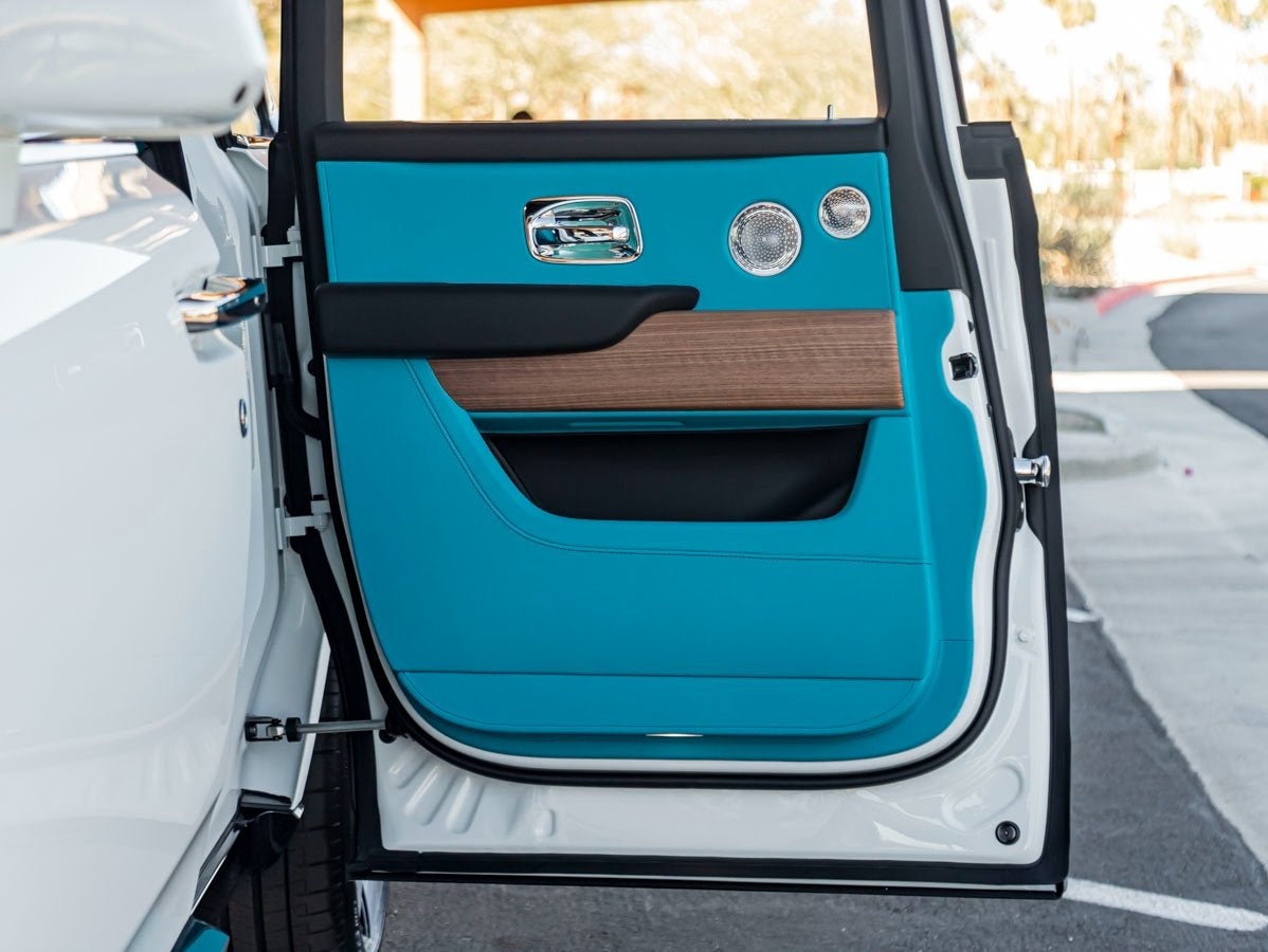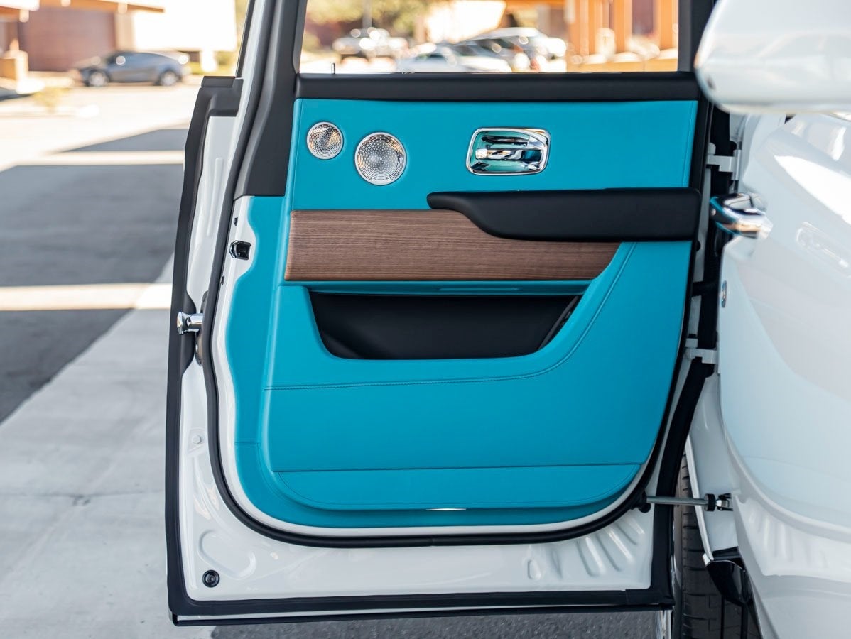 Step inside to discover a bespoke sanctuary finished in Turchese with Black accents. Appointed with Coloured Seat Piping in Grace White, Coloured Stitching in Black, and a Leather Extended Headliner, every inch is tailored to perfection. The cabin is enriched by Open Pore Royal Walnut Veneer, a Shooting Star Headliner, and the exclusive Illuminated Treadplate Cullinan. Rear passengers enjoy the ultimate indulgence with the Rear Theatre Configuration, Picnic Tables, and plush Lambswool Footmats, while the Rolls-Royce Bespoke Audio offers an immersive listening experience.