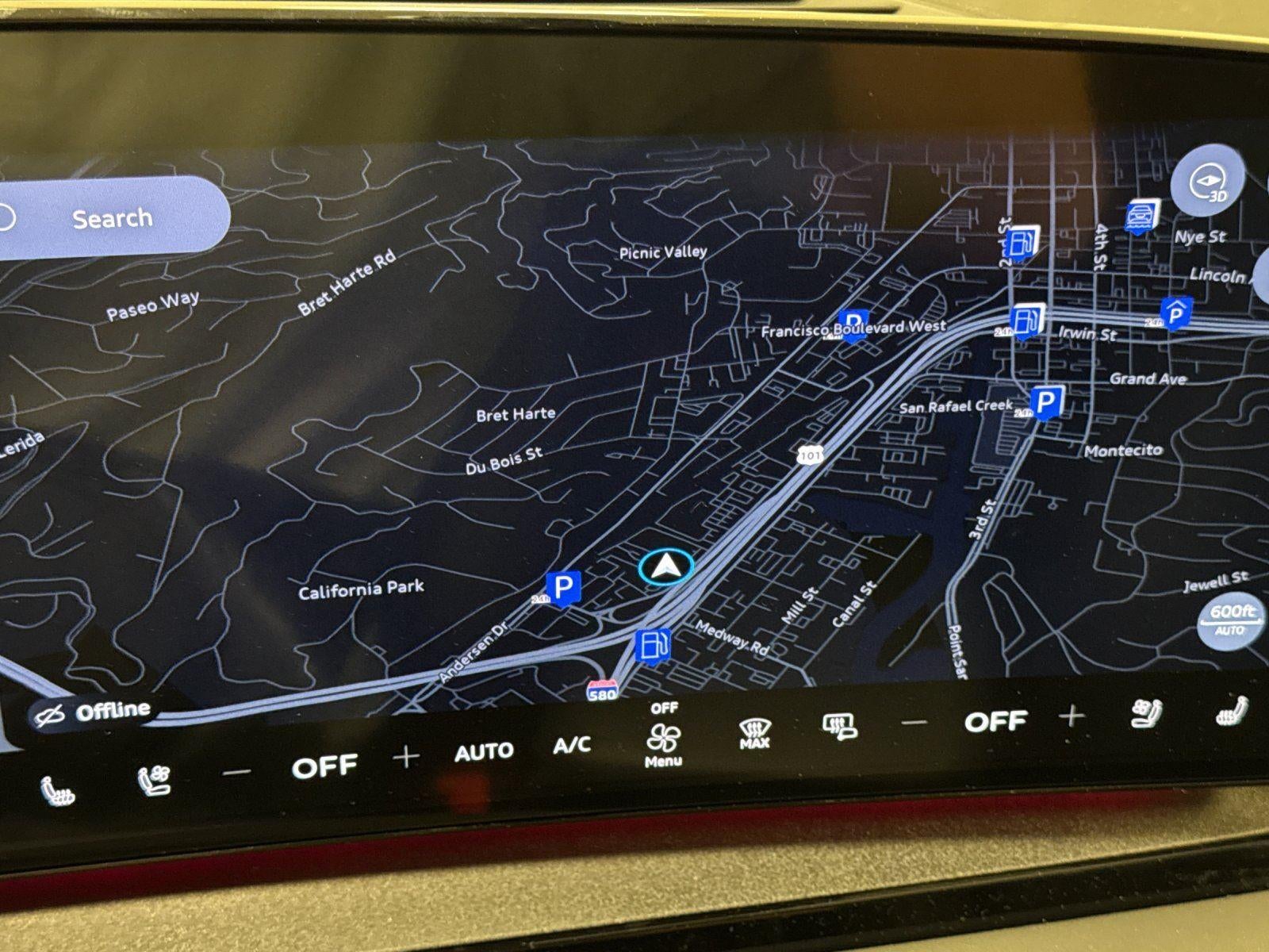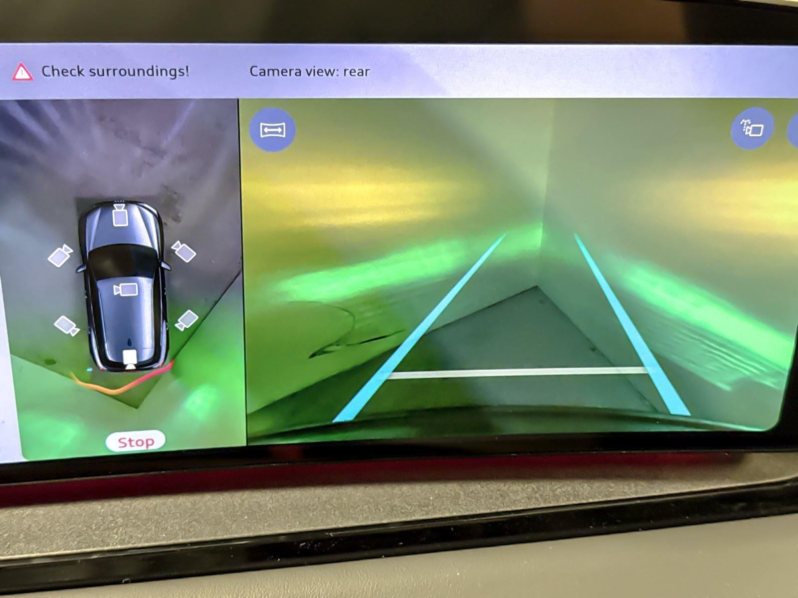 - The vehicle is equipped with a camera that displays an image of the area behind the vehicle on an interior display.