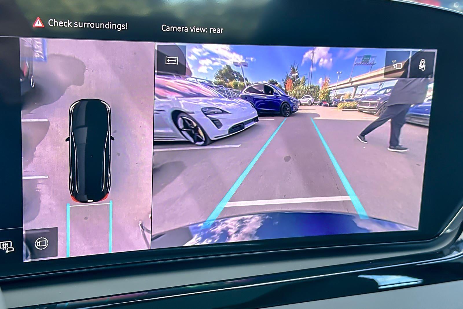 - The vehicle is equipped with a camera that displays an image of the area behind the vehicle on an interior display.