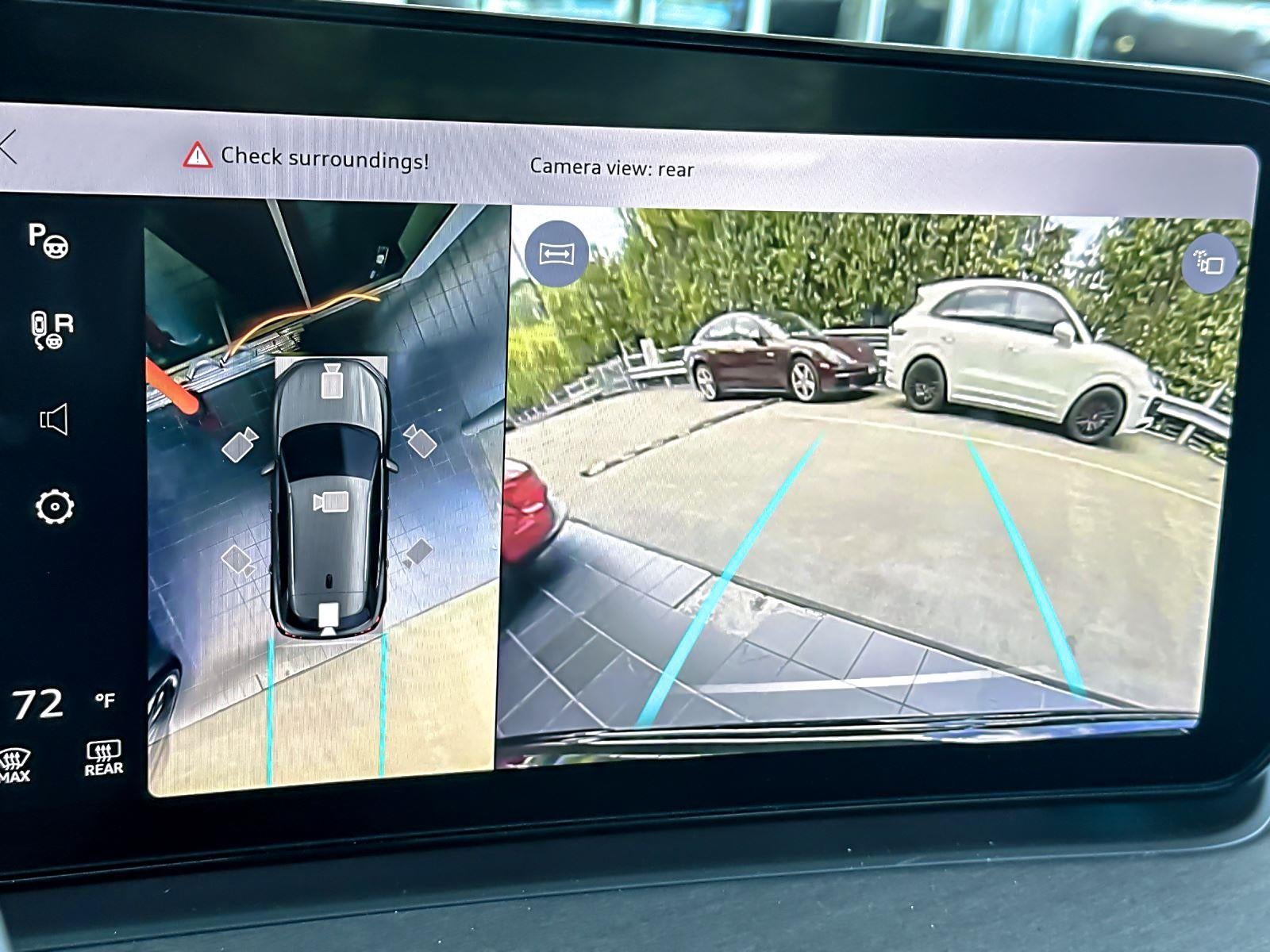 - The vehicle is equipped with a camera that displays an image of the area behind the vehicle on an interior display.