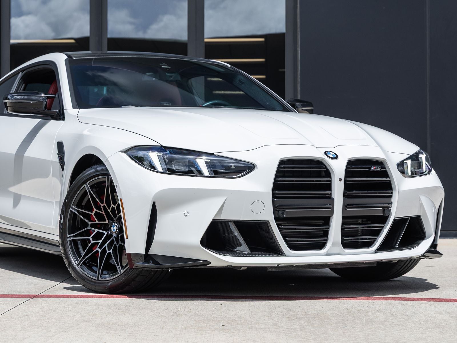 The M4 Competition Coupe stands as a bold expression of aggressive styling and track-ready capability, its Alpine White exterior accentuating its sculpted lines and aerodynamic presence. Adorned with 19/20-inch M Dual-Spoke Bi-Color Wheels and a striking M Carbon Roof, it delivers both lightweight performance and unmistakable design. Shadowline Exterior Trim and Full LED Headlights with Laserlight Taillights further enhance its commanding and modern aesthetic.