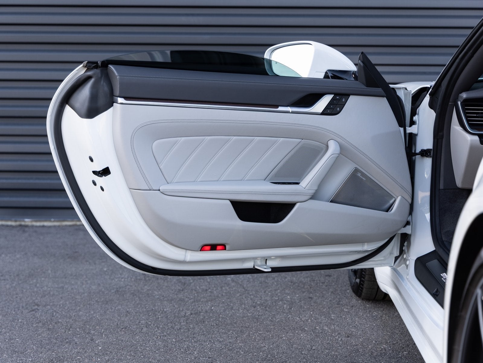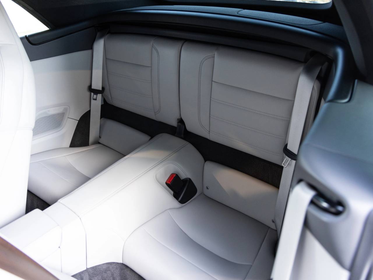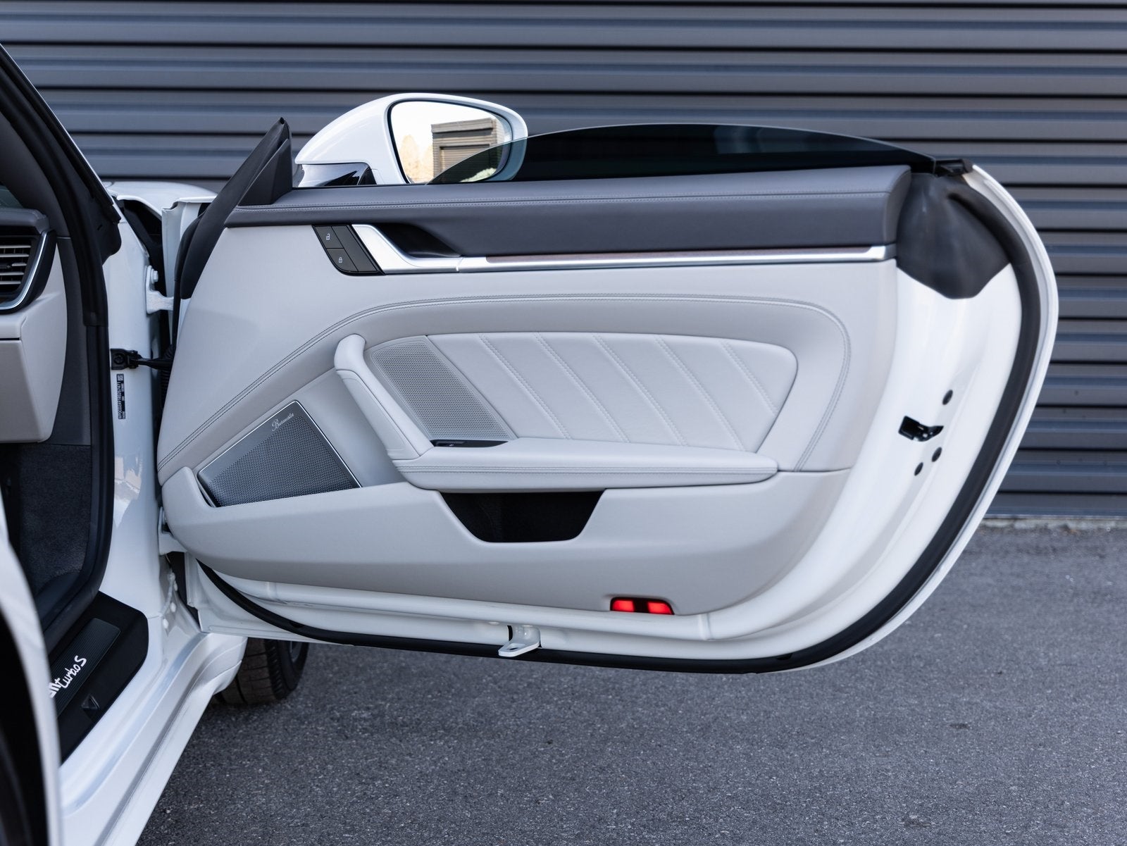 Inside, the cabin showcases bespoke craftsmanship with the Deviated Stitching Interior Package in Slate Grey, extending across the dashboard, door panels, and center console. Additional highlights include Personalized Air Vent Surrounds and Slats in Leather, Interior Trim Inlays in Paldao, and Sport Seats Plus Backrest Shells in Leather with Paldao Inlay. Comfort and driver focus are enhanced by Ventilated Front Seats, Heated GT Sport Steering Wheel, Central Tachometer and Sport Chrono Stopwatch Dial in White, Seat Belts in Chalk, and immersive audio from the Burmester High End Surround Sound System. Assistance features include Lane Change Assist and Surround View.