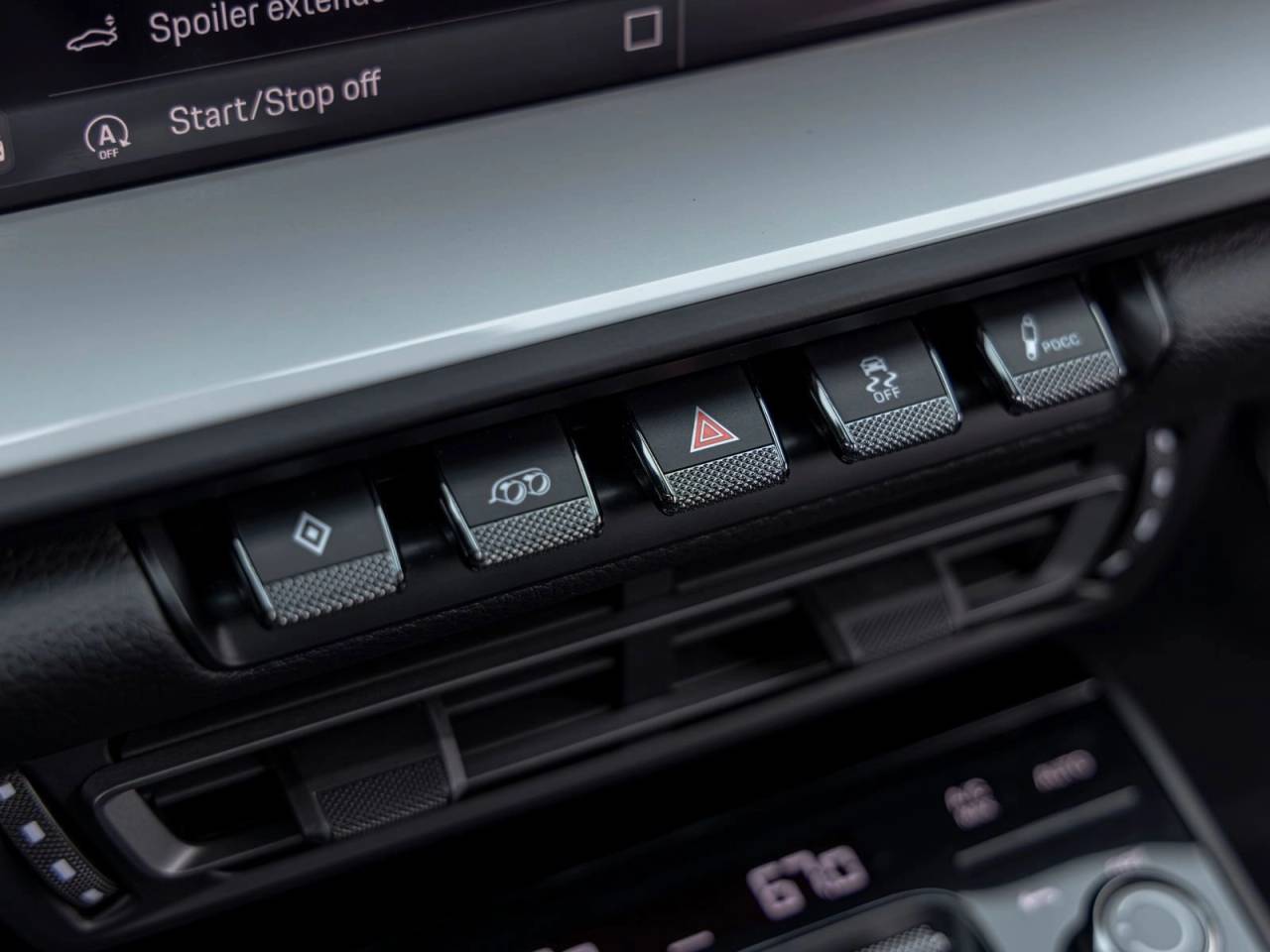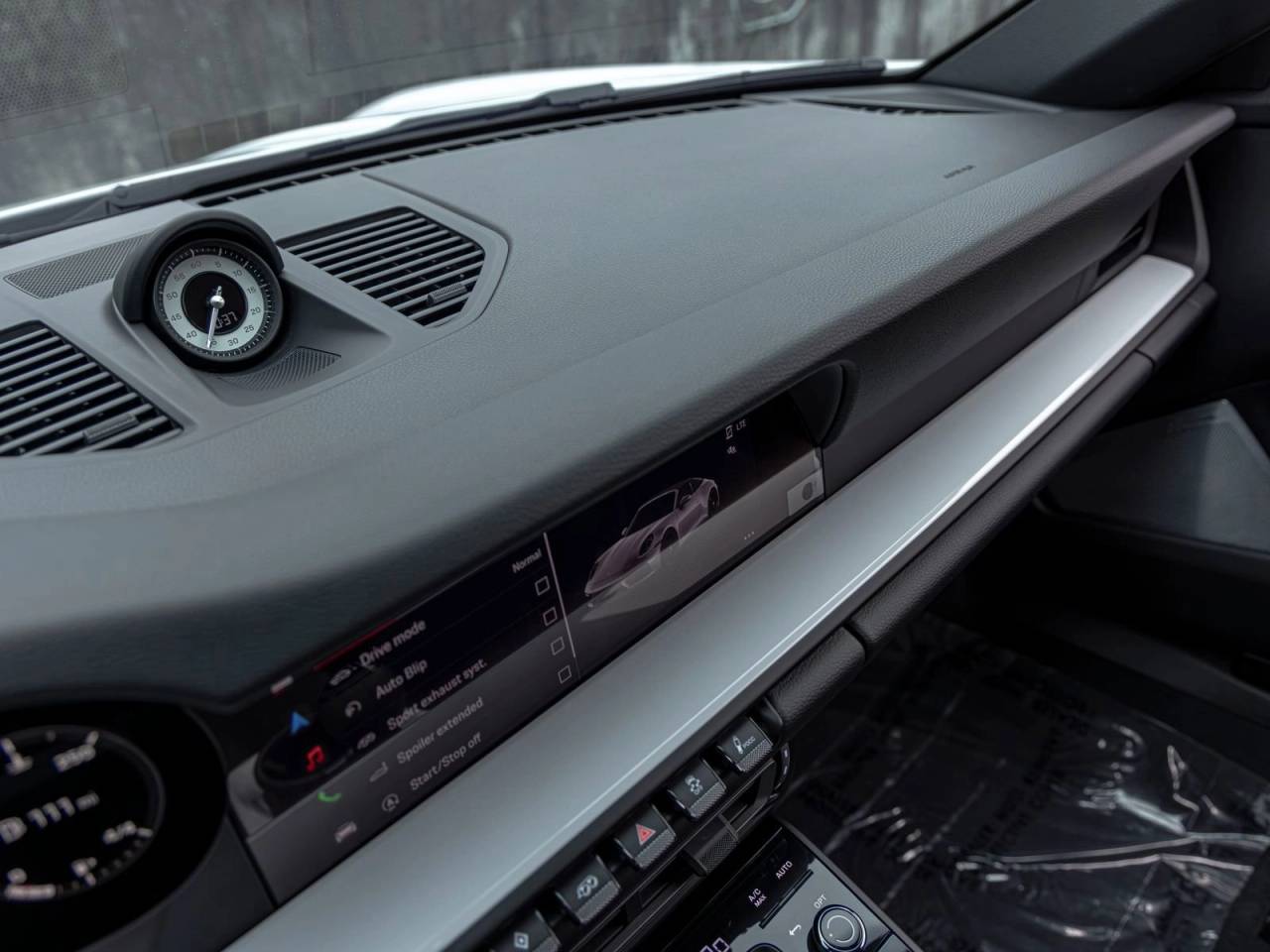 Inside, the cabin is both sporty and refined, featuring Race-Tex upholstery, interior trim inlays painted in the exterior color, and carefully selected white instrumentation including the central tachometer and Sport Chrono stopwatch dial. Ambient lighting and the ionizer contribute to a comfortable and modern interior environment.