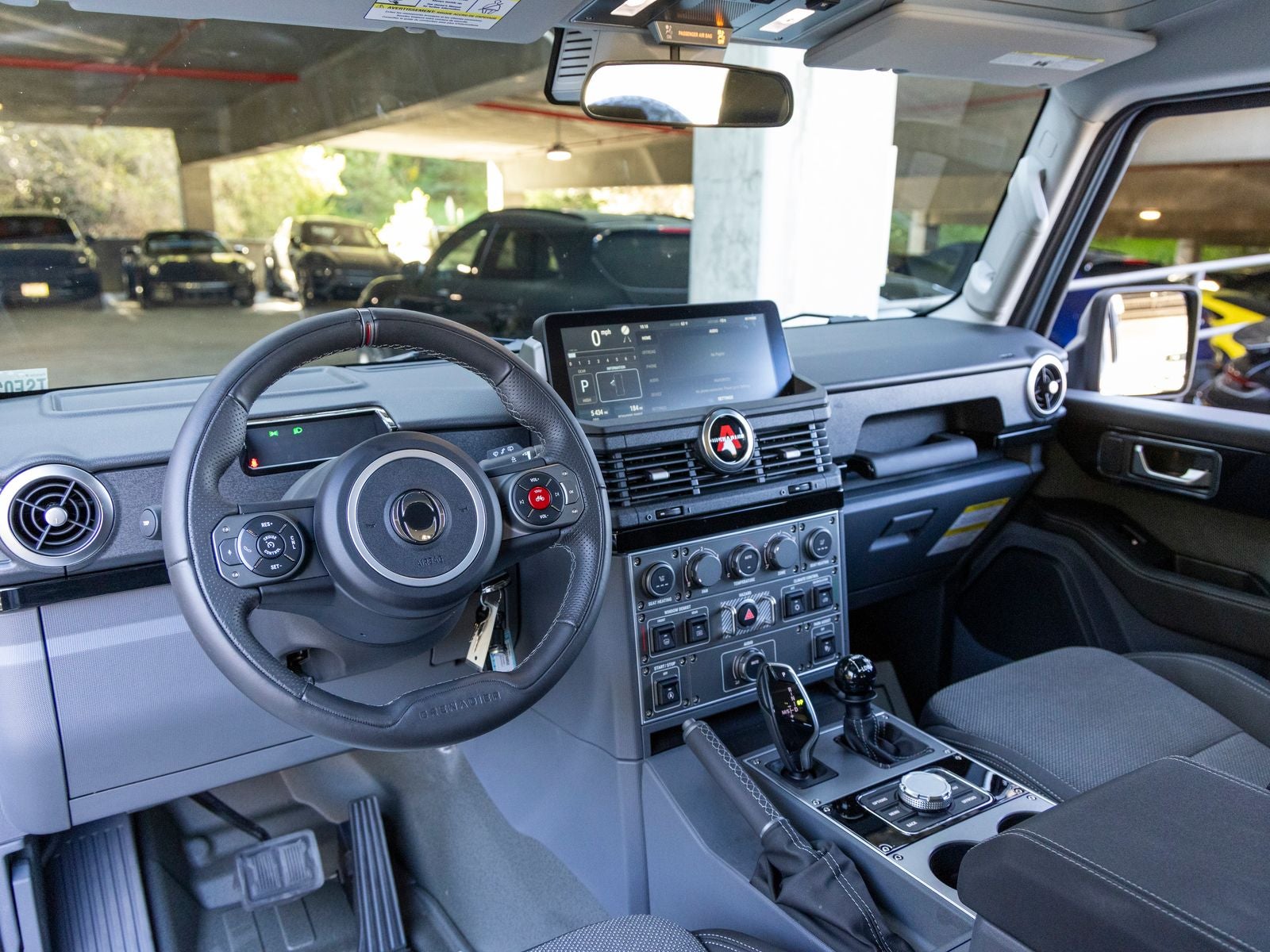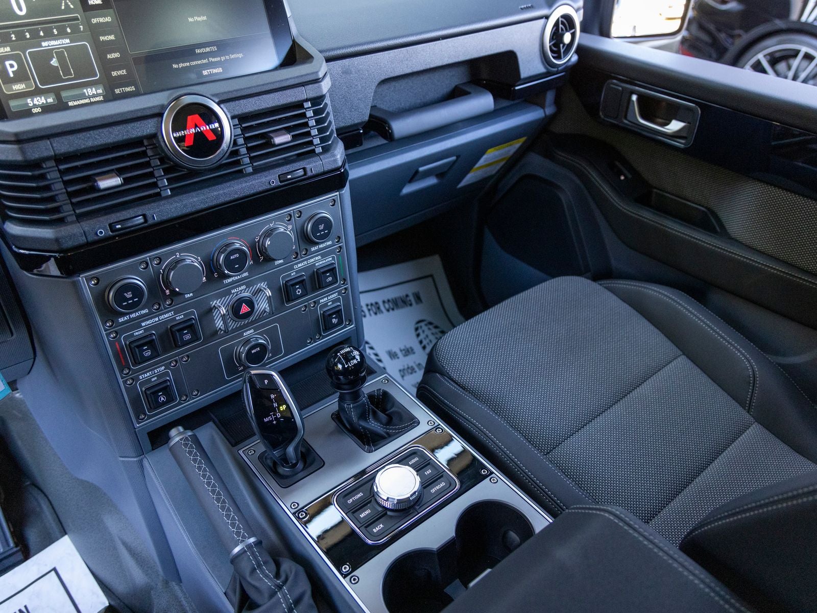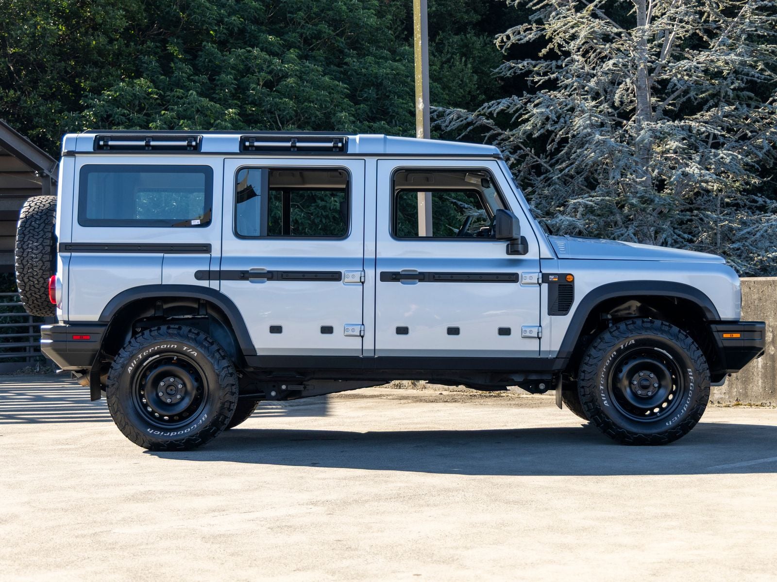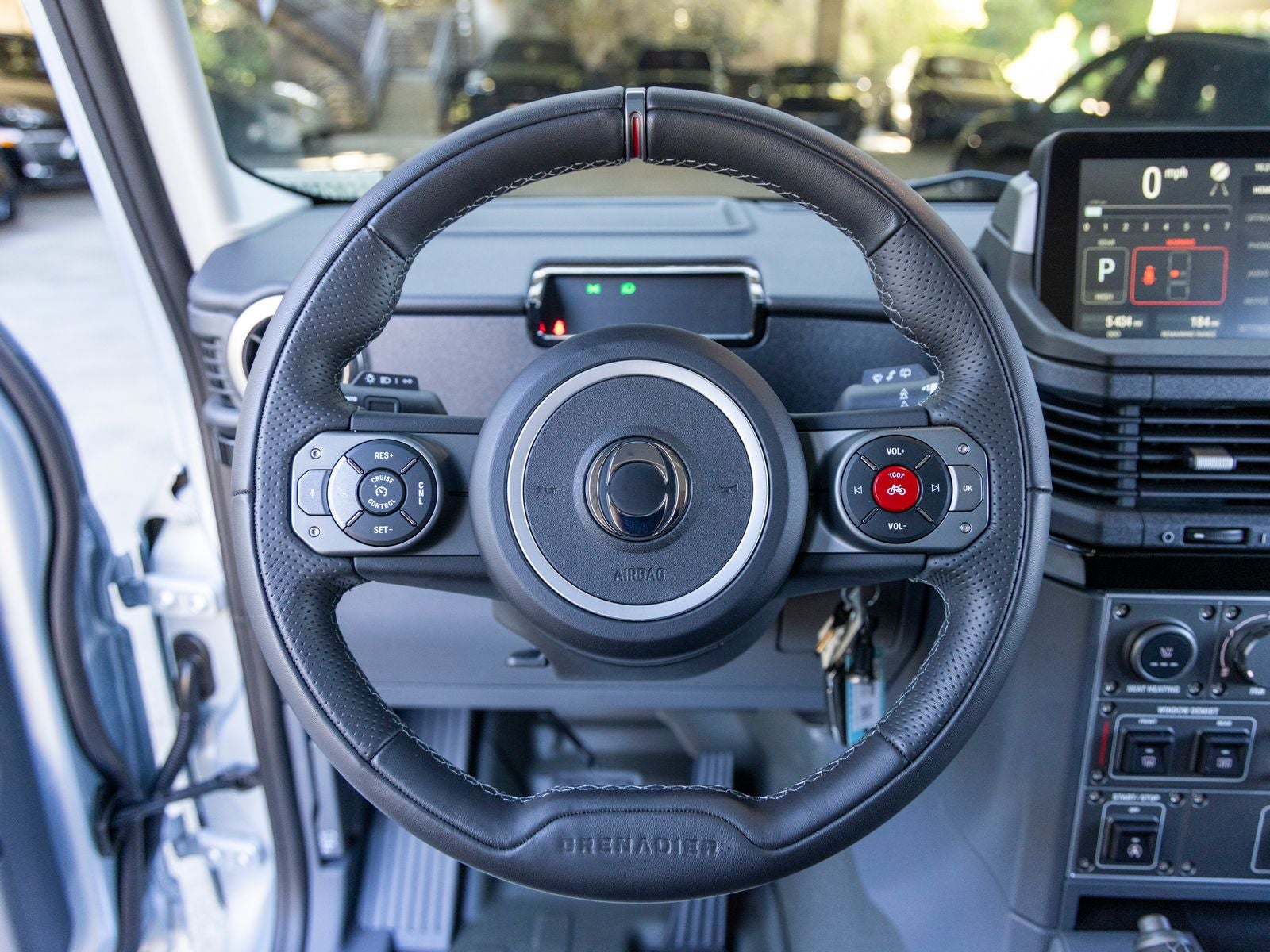 On the exterior, the Grenadiers unmistakable design is both functional and bold. Fully galvanized steel panels, black exterior accents, and protective cladding emphasize durability, while features like LED lighting, automatic high beams, heated mirrors, and a split swing-out rear cargo door enhance usability. A full-size spare tire and steel spare wheel underscore its readiness for off-road excursions.
