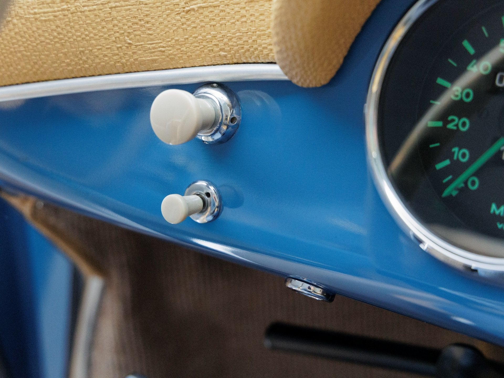 Step inside and the Accella Bast/Cream Leatherette interior greets you, evoking a sense of nostalgia and classic craftsmanship. The Tan convertible top provides a refined contrast, while the period-correct Speedometer in miles keeps the original character intact, offering a driving experience that is as pure as it is memorable.