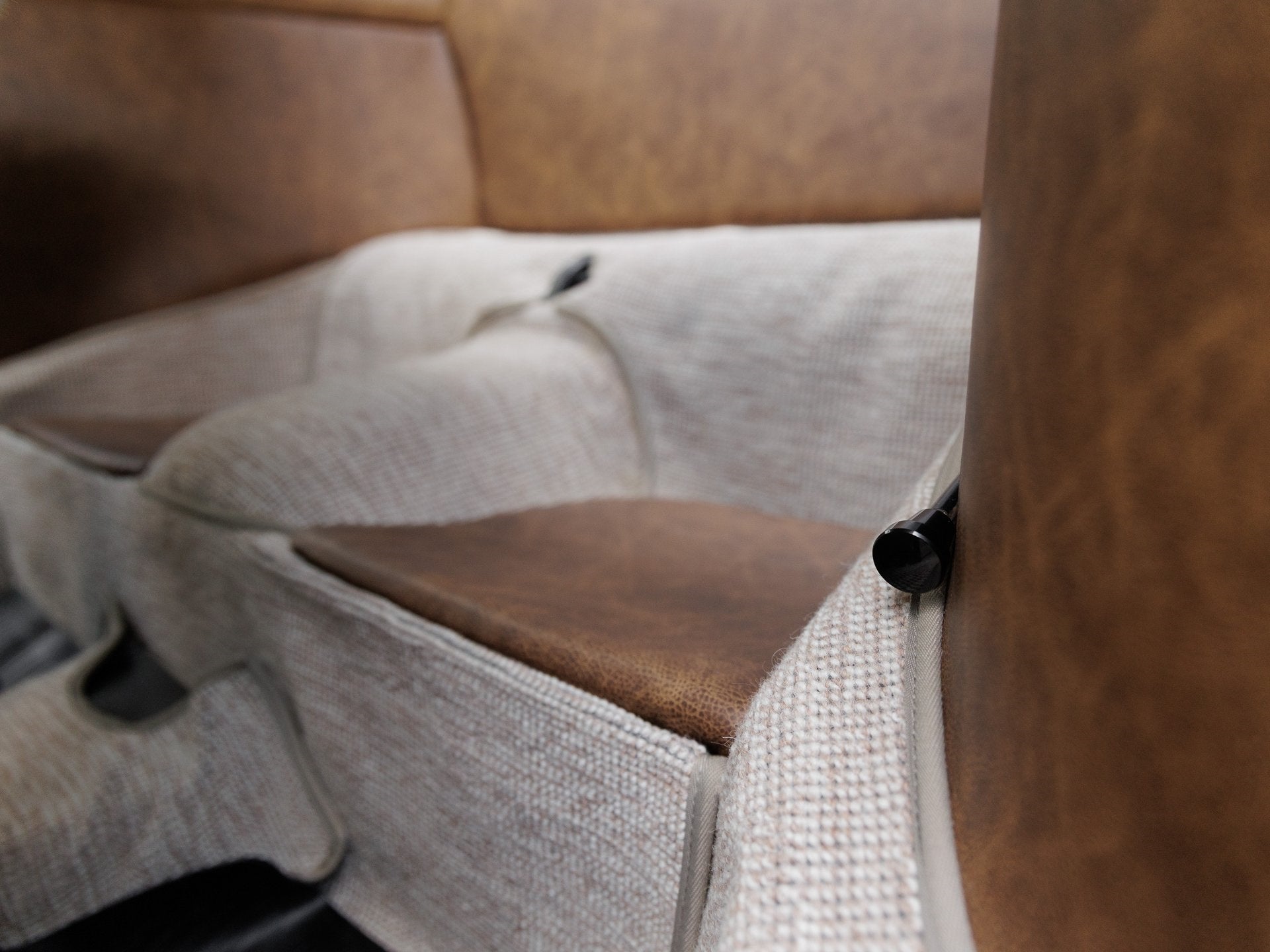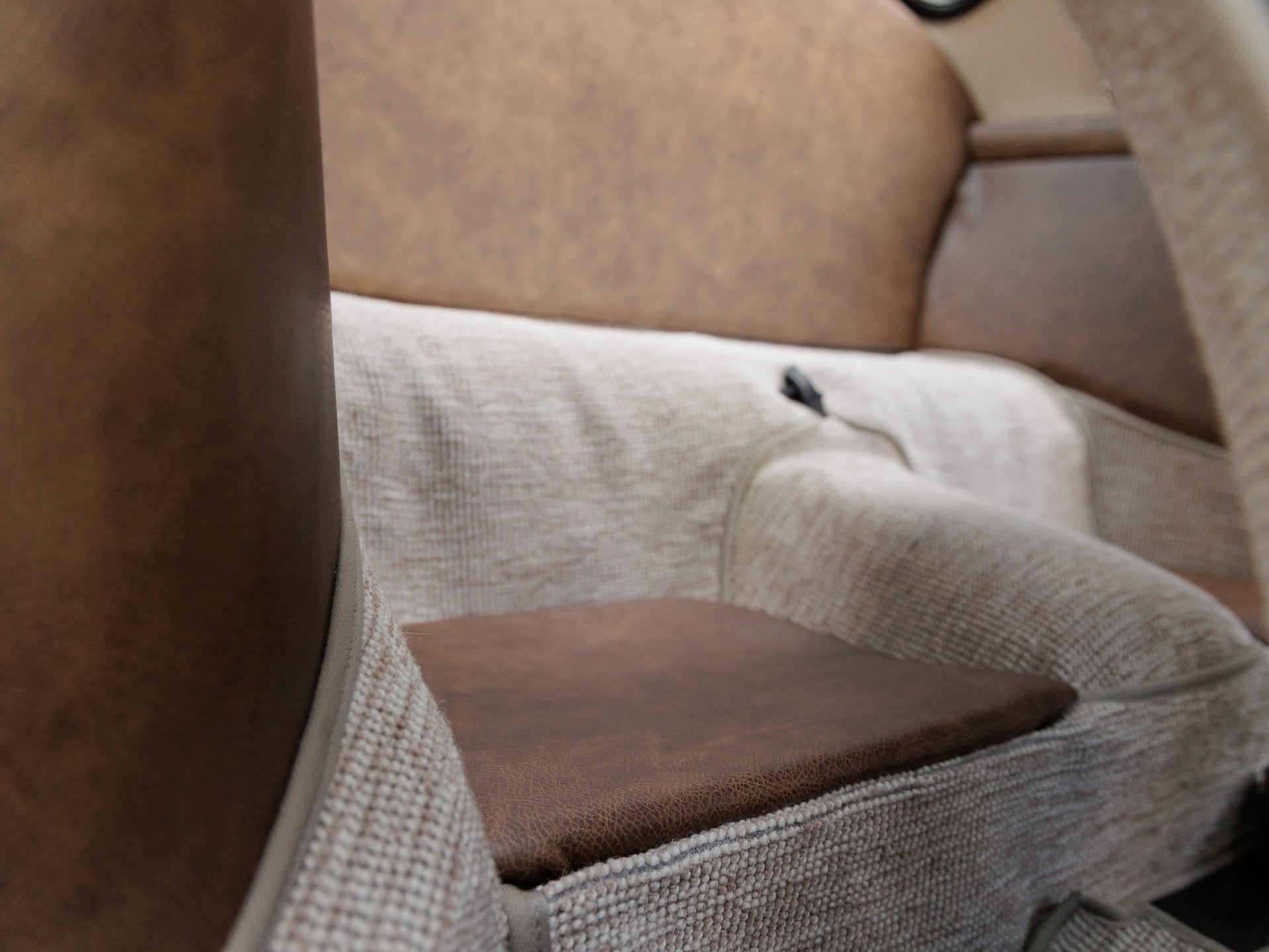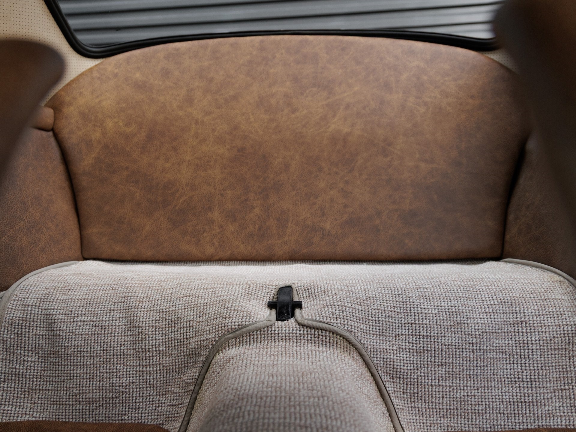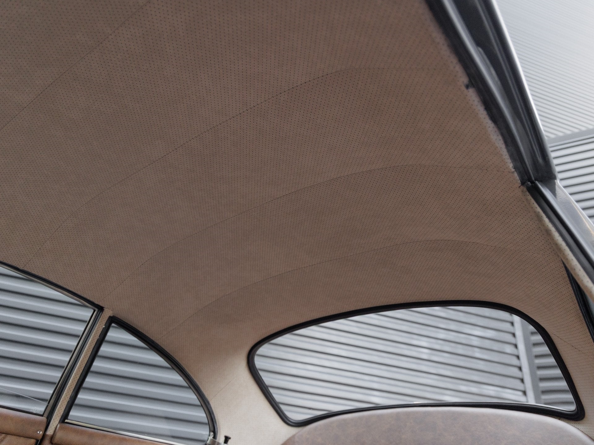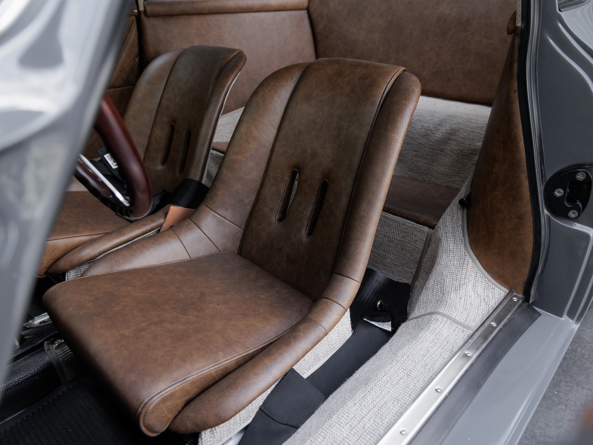 Step inside and the handcrafted interior envelops you in a blend of performance and elegance. Speedster seats, custom door panels with 930-style pleating, a re-covered dashboard, and a perforated suede biscuit-colored headliner highlight the cabins artisanal quality. The square weave oatmeal carpeting is complemented by dark brown distressed leather throughout, creating a tailored yet timeless interior experience.