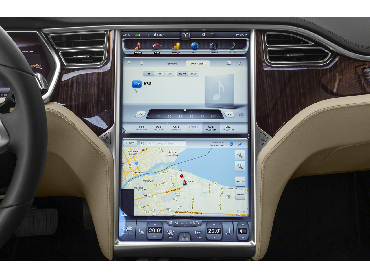 - Radio: AM/FM/HD/USB w/17" Touchscreen Controls -inc: 200 watt, 7 speaker stereo system, online radio, on-demand internet radio, Bluetooth and Bluetooth-enabled, voice controlled handsfree phone system, The Model S 17" touchscreen controls most of the car's functions, Opening the all glass panoramic roof, customizing the automatic climate control, and changing the radio station all happen w/a swipe or a touch, The touchscreen, digital instrument cluster, and steering wheel controls seamlessly integrate media, navigation, communications, cabin controls and vehicle data