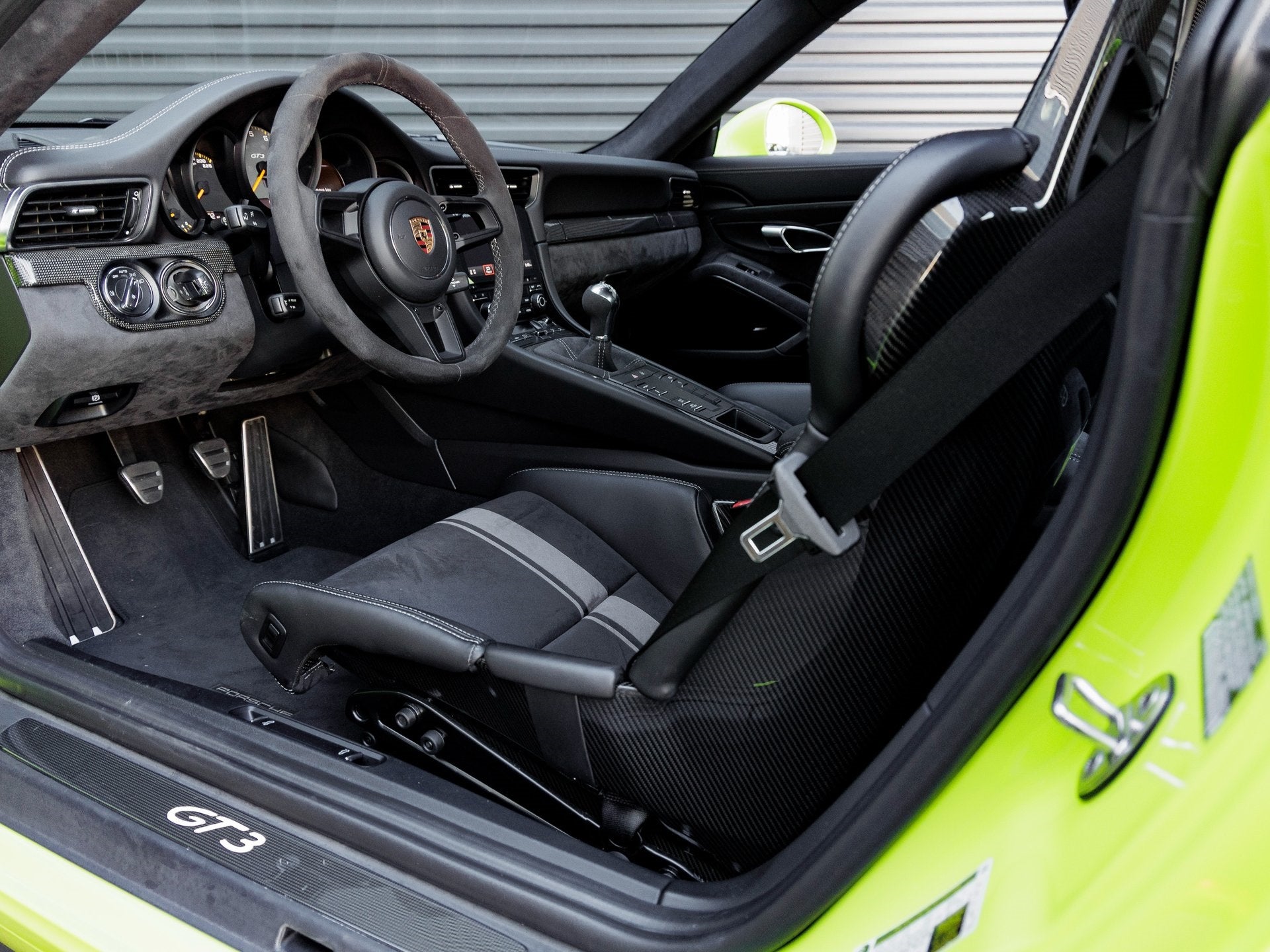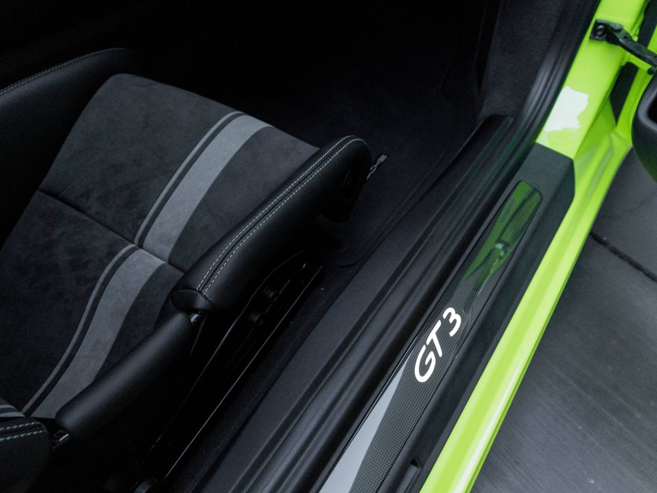 Step inside and the Black interior with Platinum Grey stitching greets you, exuding an air of bespoke luxury that only Porsche can deliver. Full Bucket Seats provide an immersive driving experience, while the Interior Trim in Carbon Fiber in combination with the Leather Interior and Illuminated Carbon Fiber Door Sill Guards speak to the GT3s crafted sophistication. The Vehicle Keys Painted and One Key Pouch in Leather underscore the attention to detail present in every aspect of this cars design.