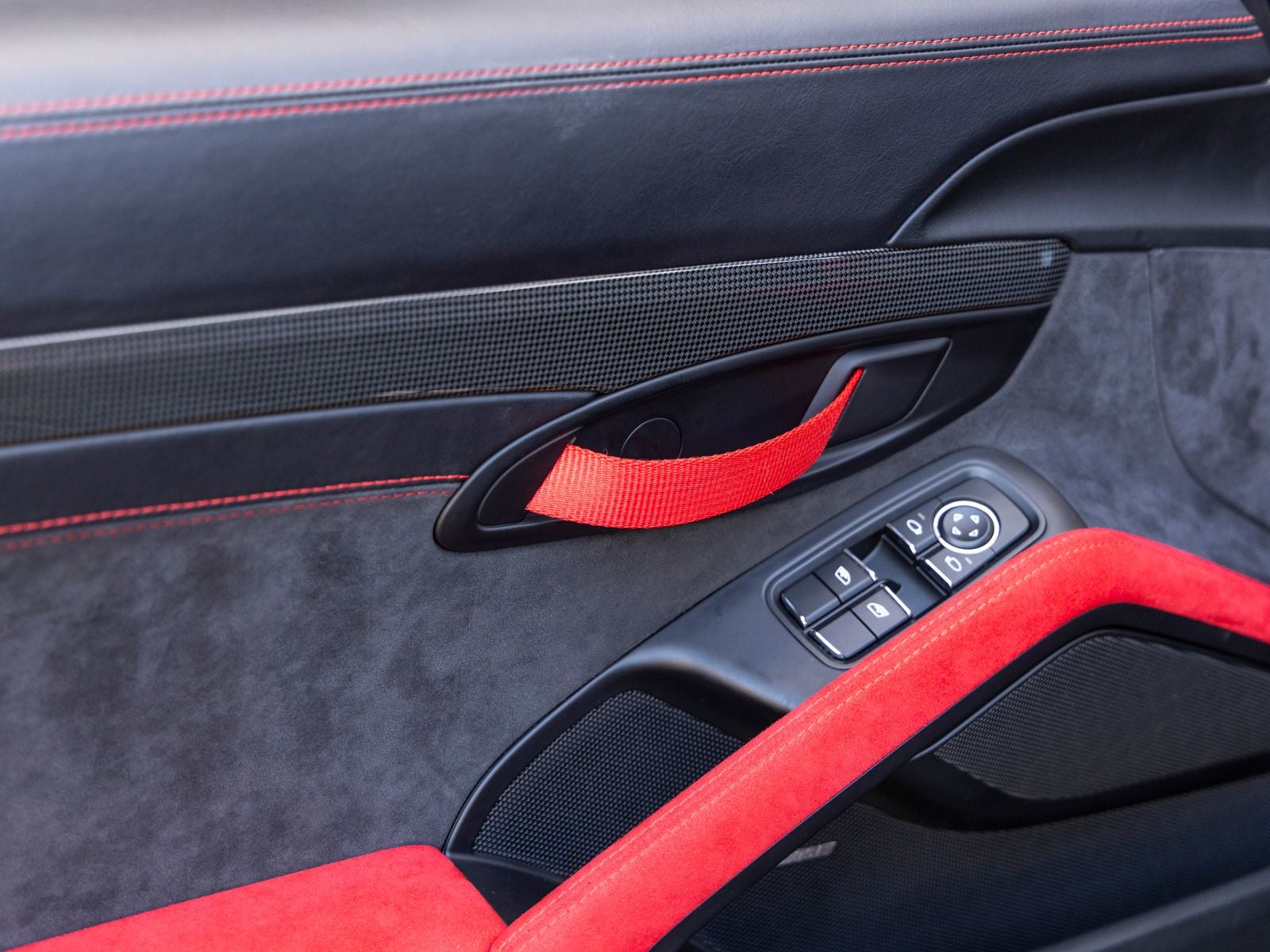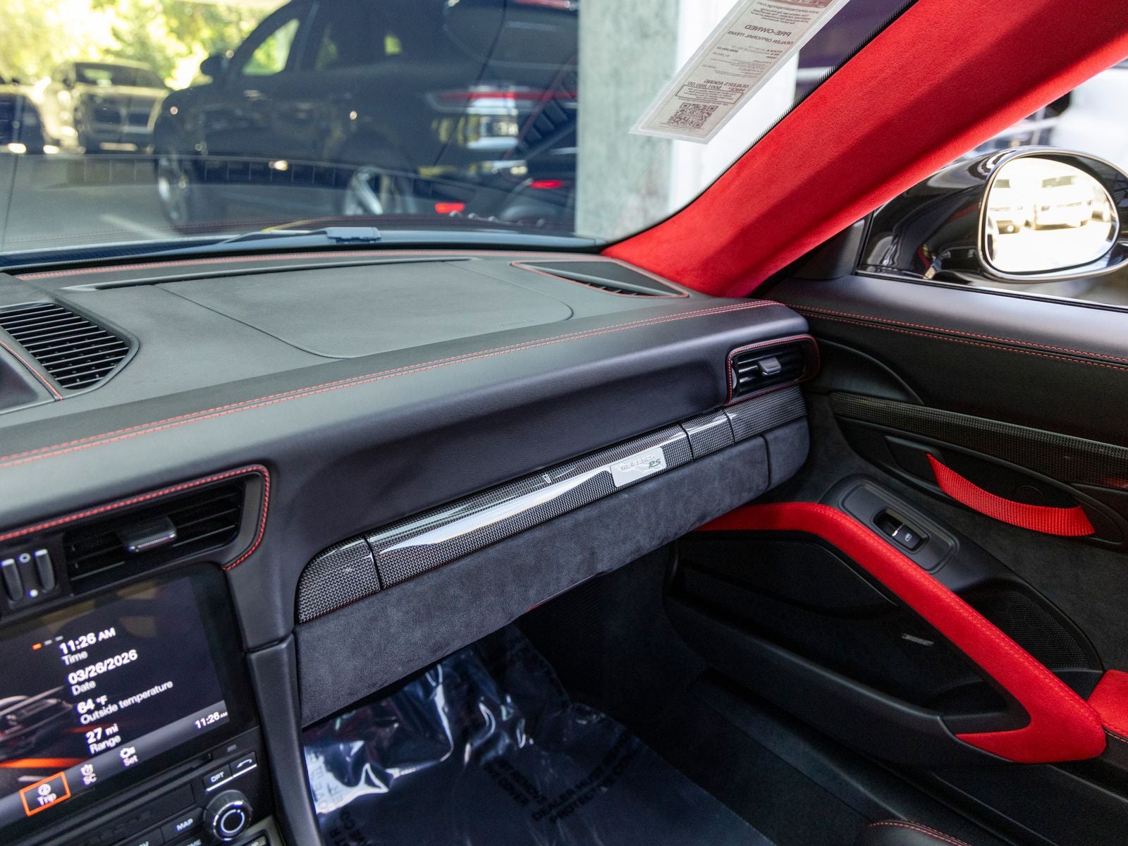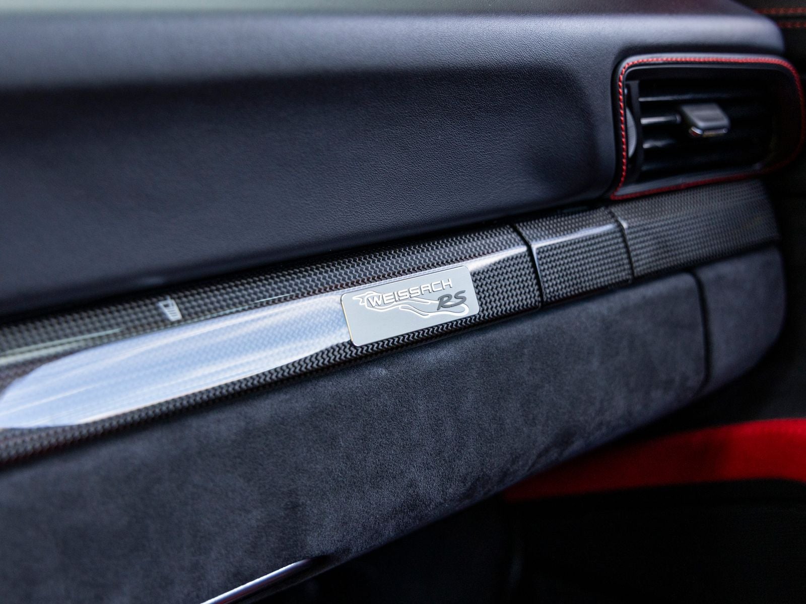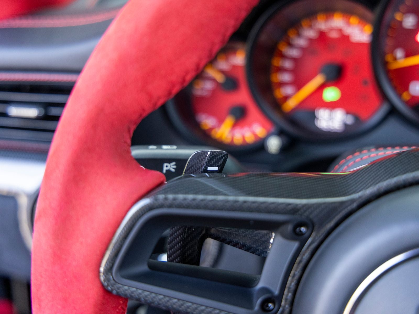 Inside, the cabin is meticulously specified with premium materials and bold accents. Guards Red instrument dials and matching Sport Chrono stopwatch dial create a vivid contrast against the dark interior, while extensive leather and Alcantara appointments including the dashboard, door trims, steering column casing, and storage compartment lid deliver a refined yet performance-oriented environment. Carbon fiber illuminated door sill guards and aluminum pedals and footrest further emphasize the cars racing pedigree.
