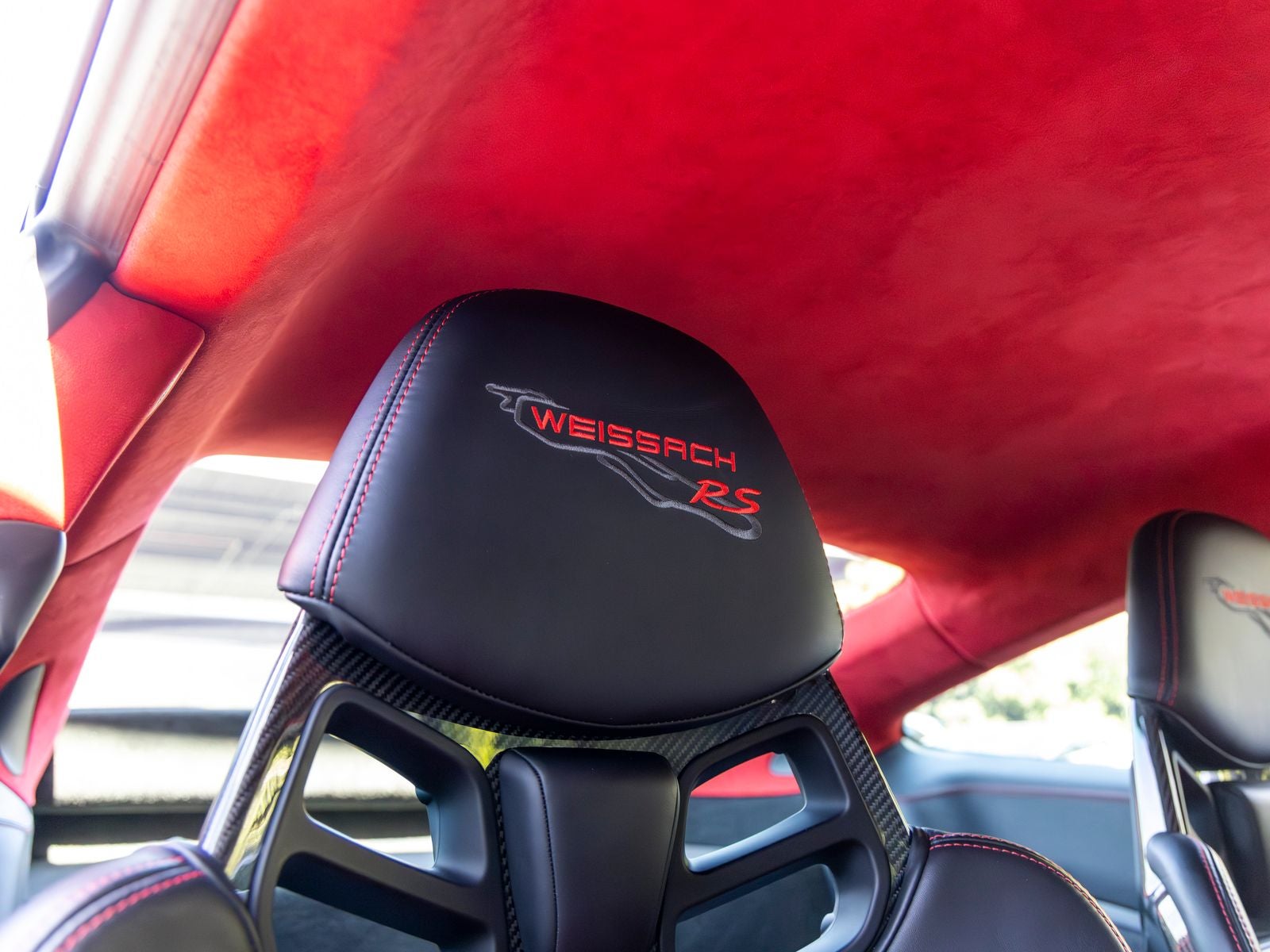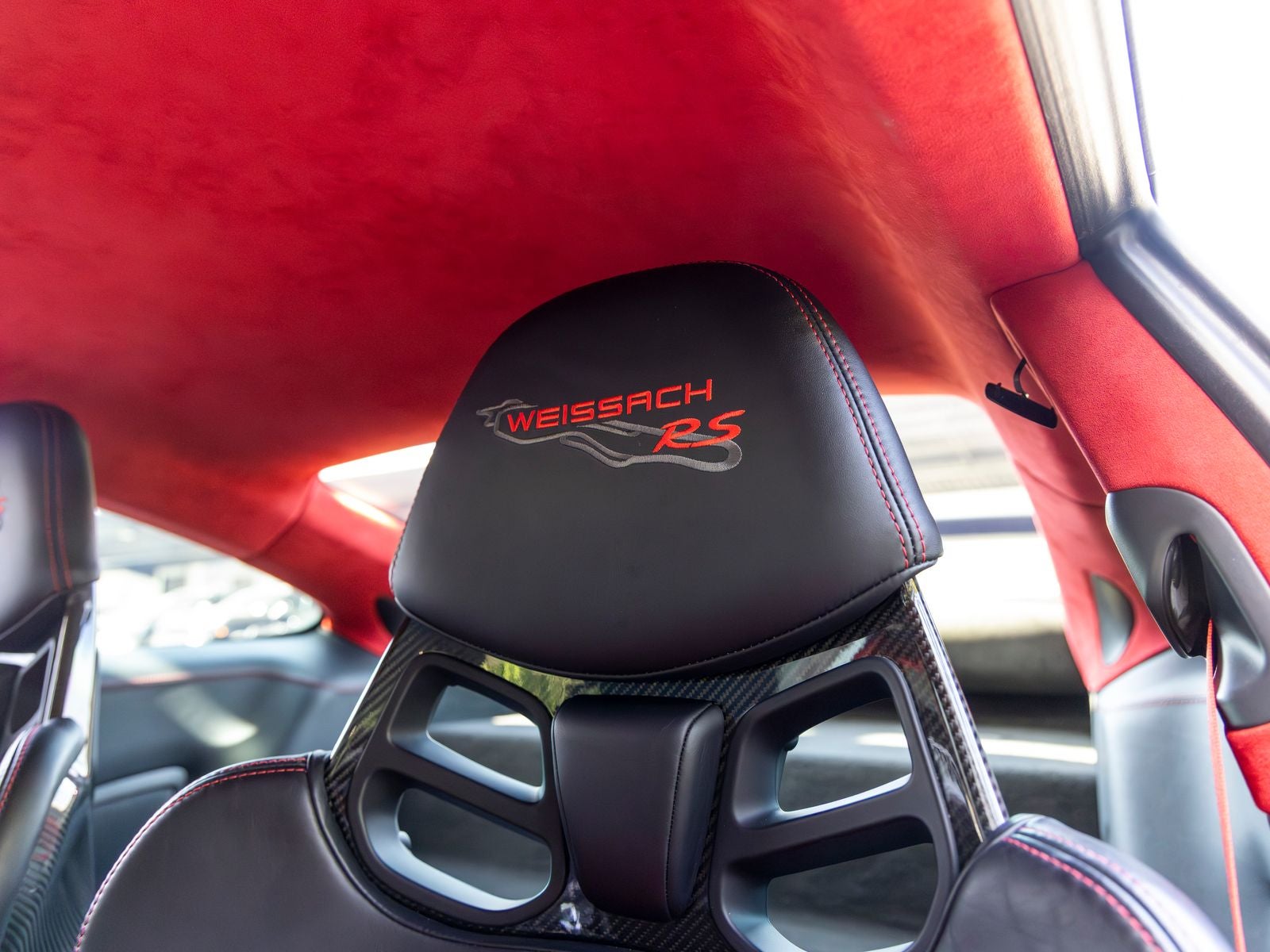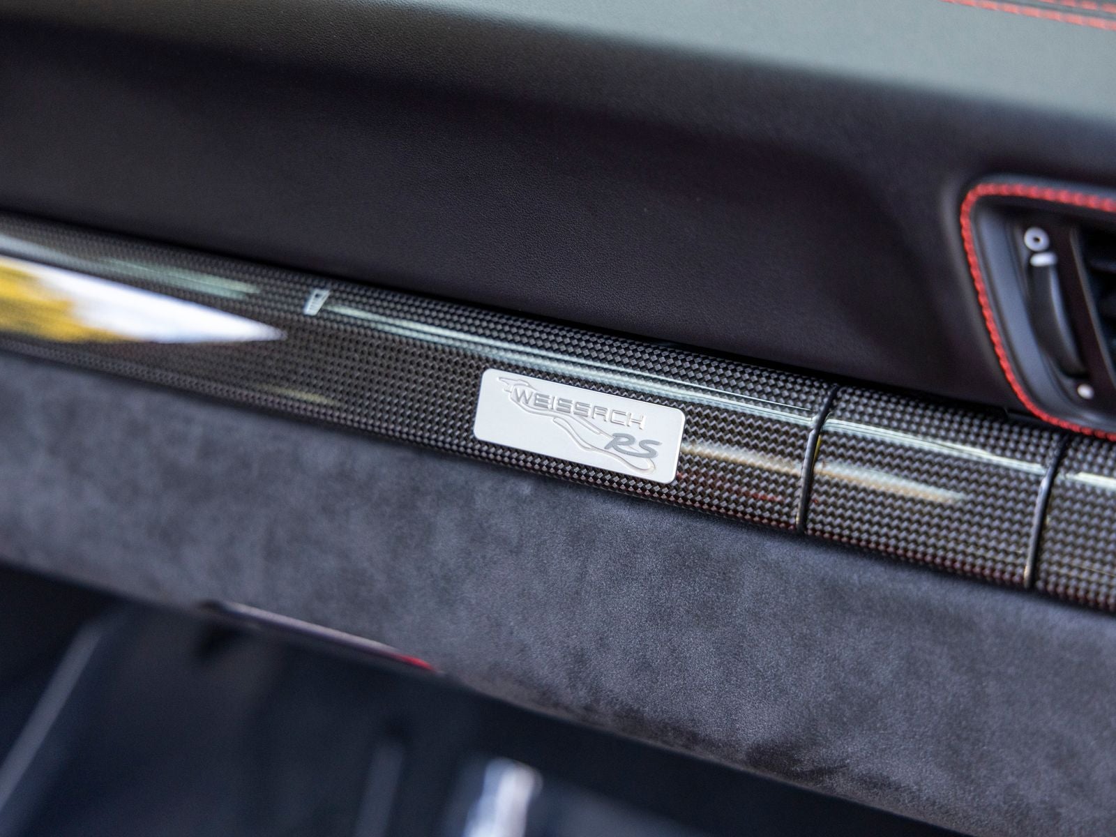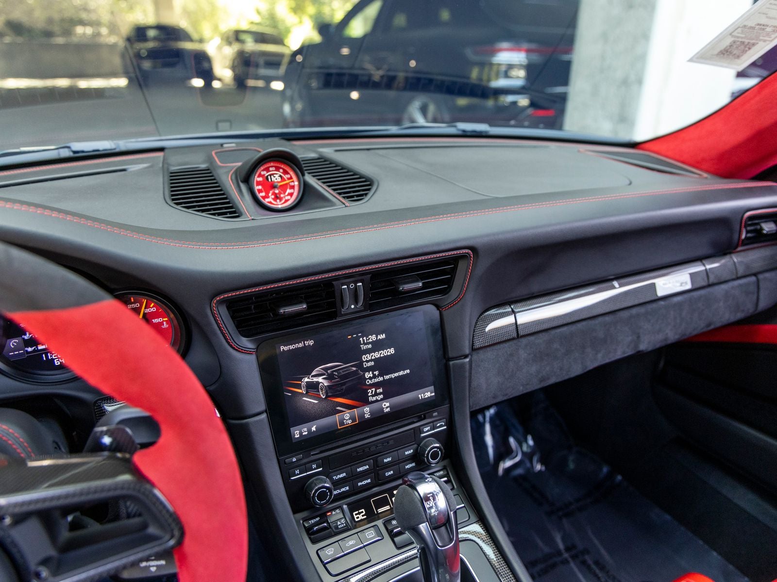 Inside, the cabin is meticulously specified with premium materials and bold accents. Guards Red instrument dials and matching Sport Chrono stopwatch dial create a vivid contrast against the dark interior, while extensive leather and Alcantara appointments including the dashboard, door trims, steering column casing, and storage compartment lid deliver a refined yet performance-oriented environment. Carbon fiber illuminated door sill guards and aluminum pedals and footrest further emphasize the cars racing pedigree.