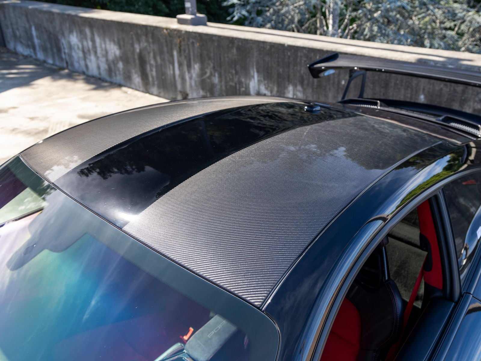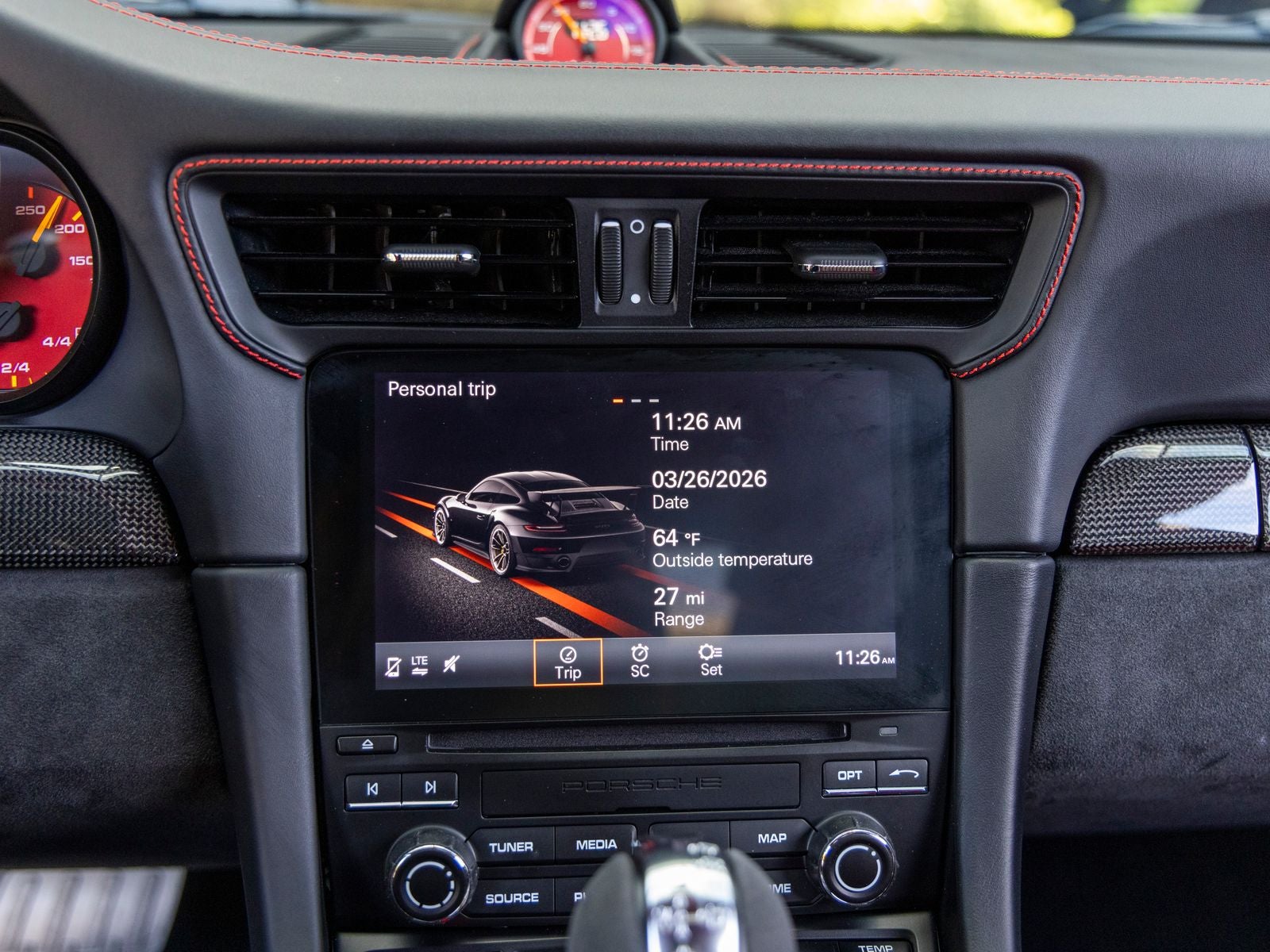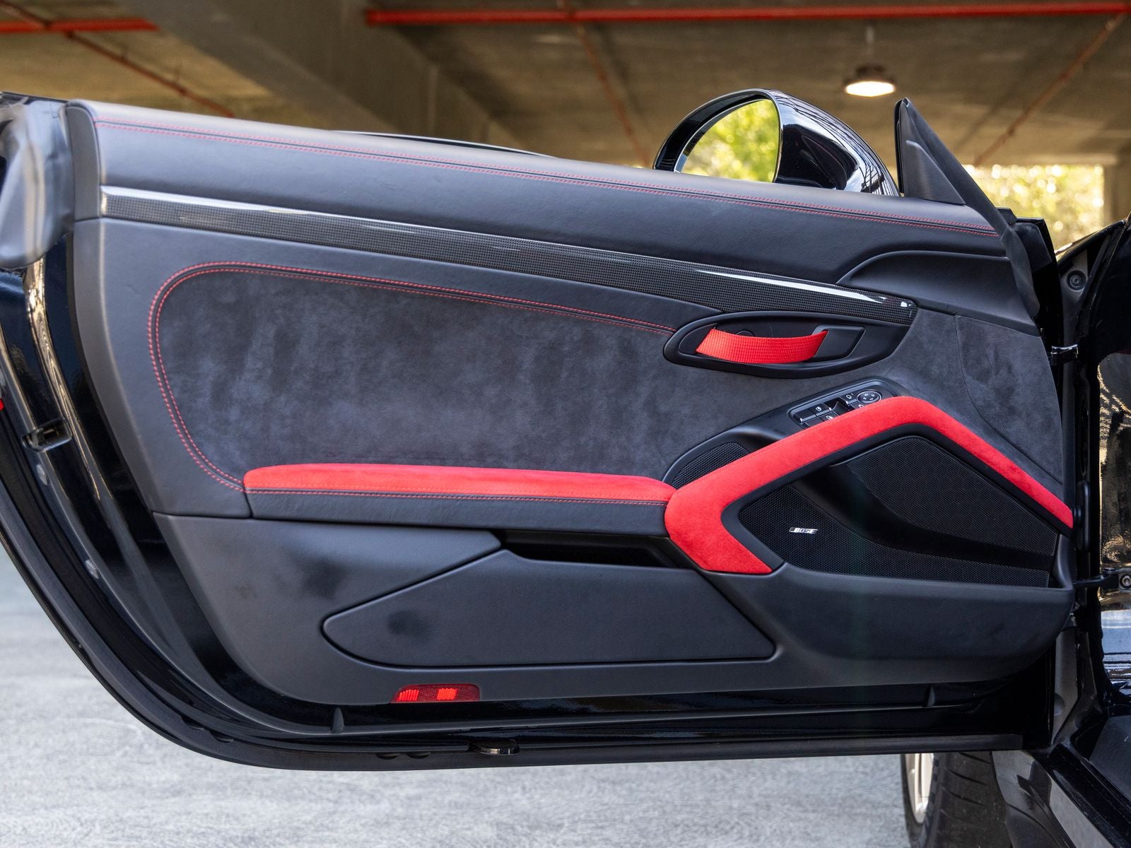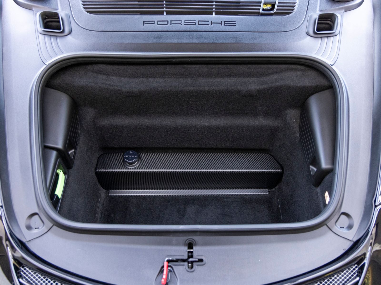 Inside, the cabin is meticulously specified with premium materials and bold accents. Guards Red instrument dials and matching Sport Chrono stopwatch dial create a vivid contrast against the dark interior, while extensive leather and Alcantara appointments including the dashboard, door trims, steering column casing, and storage compartment lid deliver a refined yet performance-oriented environment. Carbon fiber illuminated door sill guards and aluminum pedals and footrest further emphasize the cars racing pedigree.