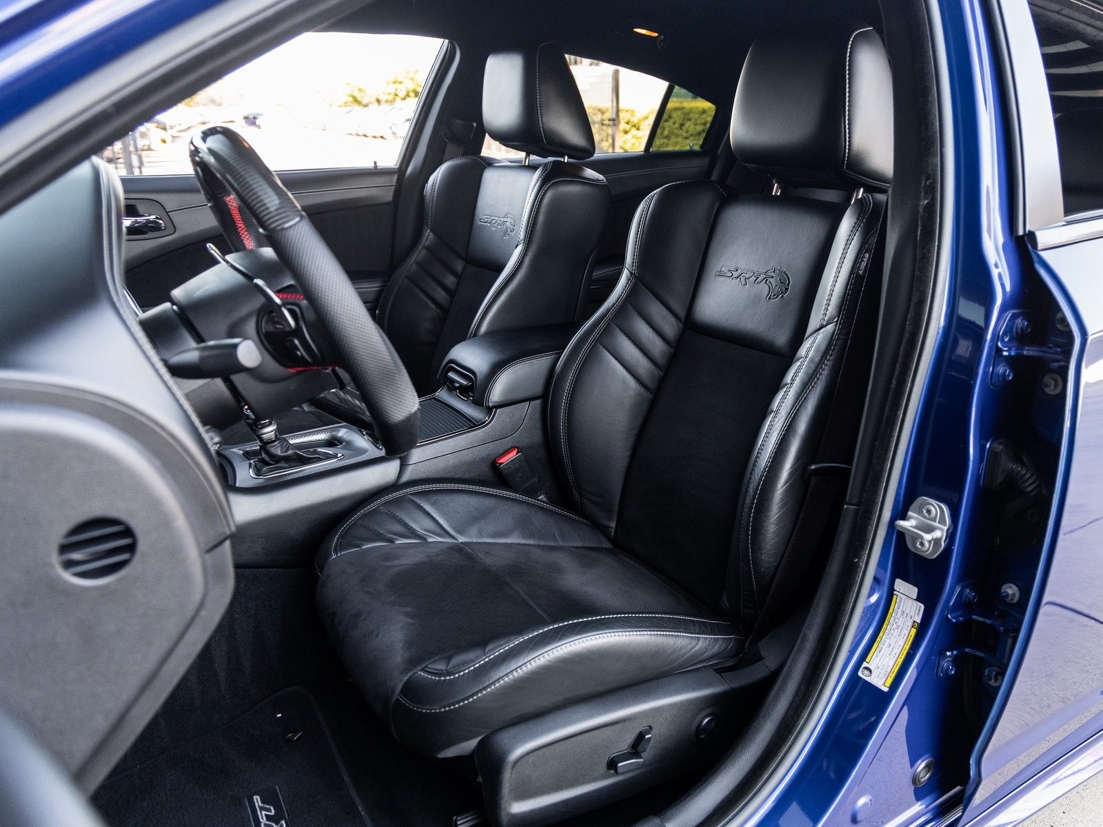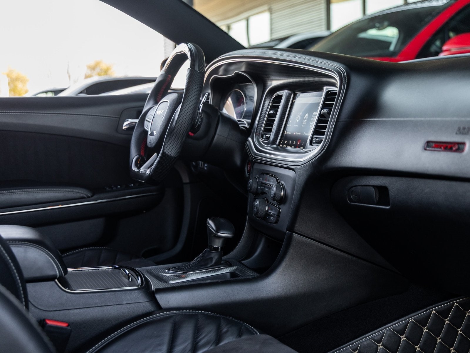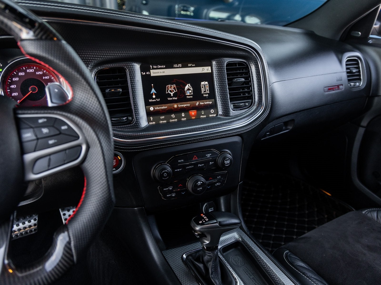 Step inside and the Black Alcantara / Laguna interior surrounds you with comfort and purpose-built luxury. Heated and ventilated front seats, heated second-row seats, and a premium-stitched dash panel elevate daily driving, while SRT Hellcat interior badging and dark engine-turned aluminum accents reinforce its performance-driven character. The Alcantara-wrapped steering wheel, suede door trim panels, and memory settings for the driver seat and mirrors ensure both control and convenience at every turn.