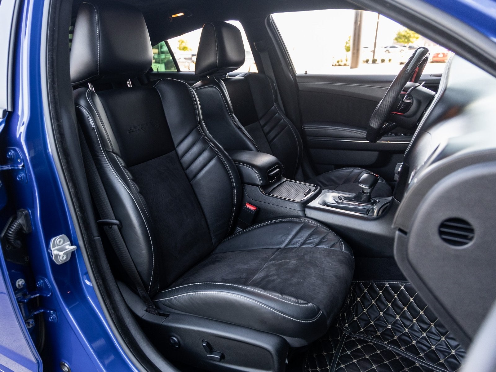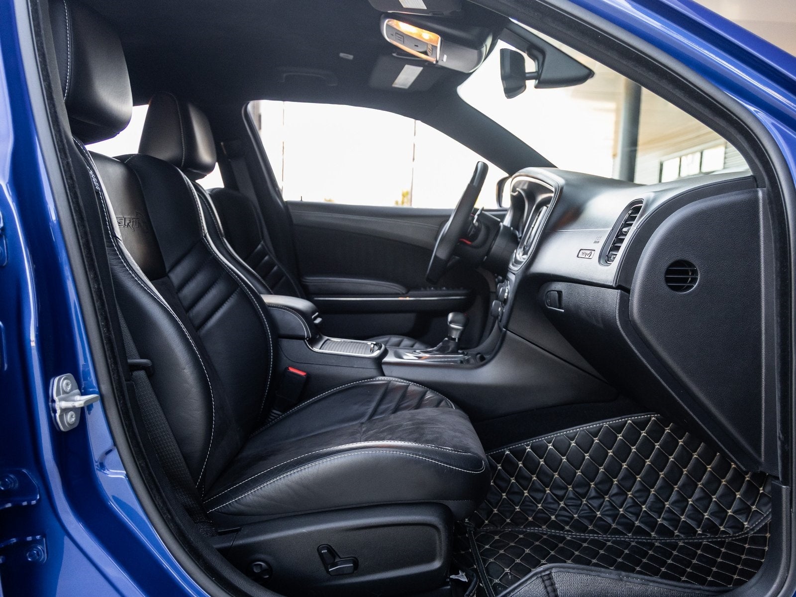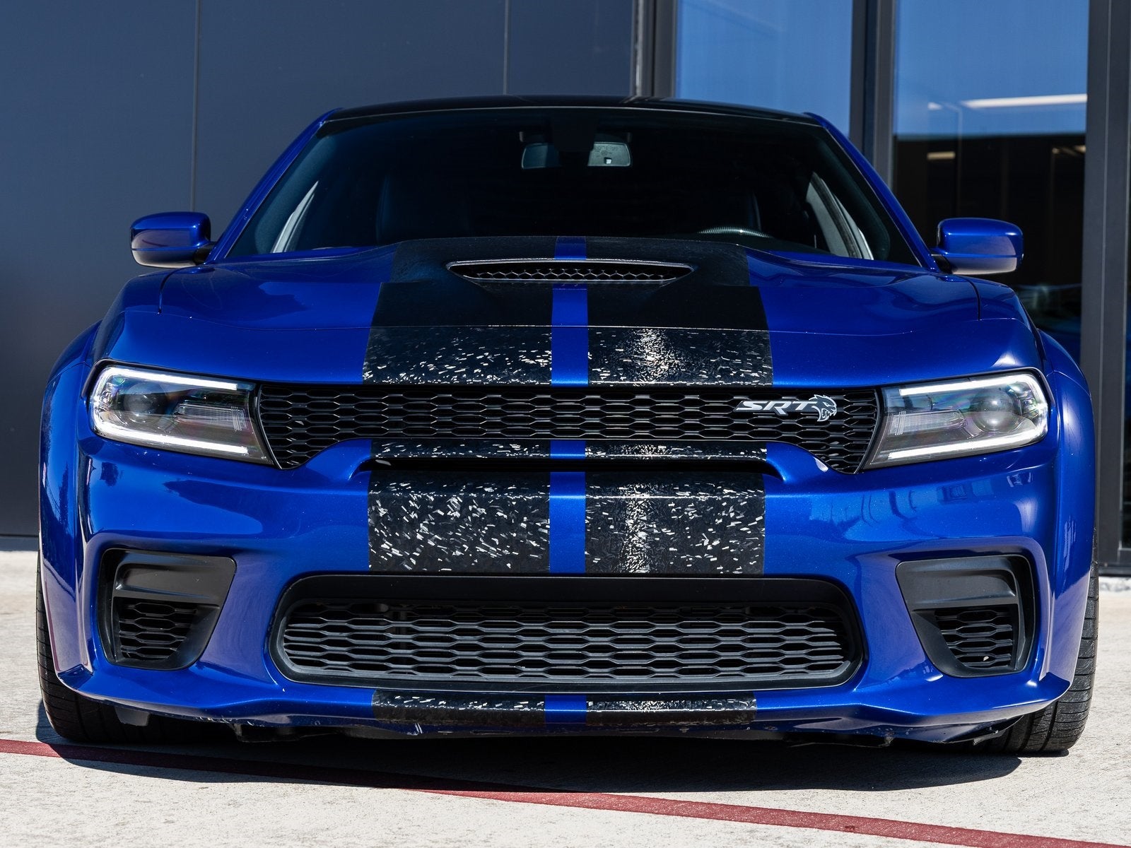 The Charger SRT Hellcat Widebody commands attention with its aggressive stance and unmistakable presence. The Indigo Blue exterior is complemented by the factory Widebody Competition Suspension, 20-inch x 11.0-inch Carbon Black Aluminum Wheels, and SRT Performance Spoiler, giving this sedan both track-ready capability and street-dominating style. Bi-Function HID Projector Headlamps, LED Daytime Running Lamps, and SRT Hellcat Exterior Badges further emphasize its high-performance pedigree, while the Gloss Black Painted Roof adds a menacing finishing touch.