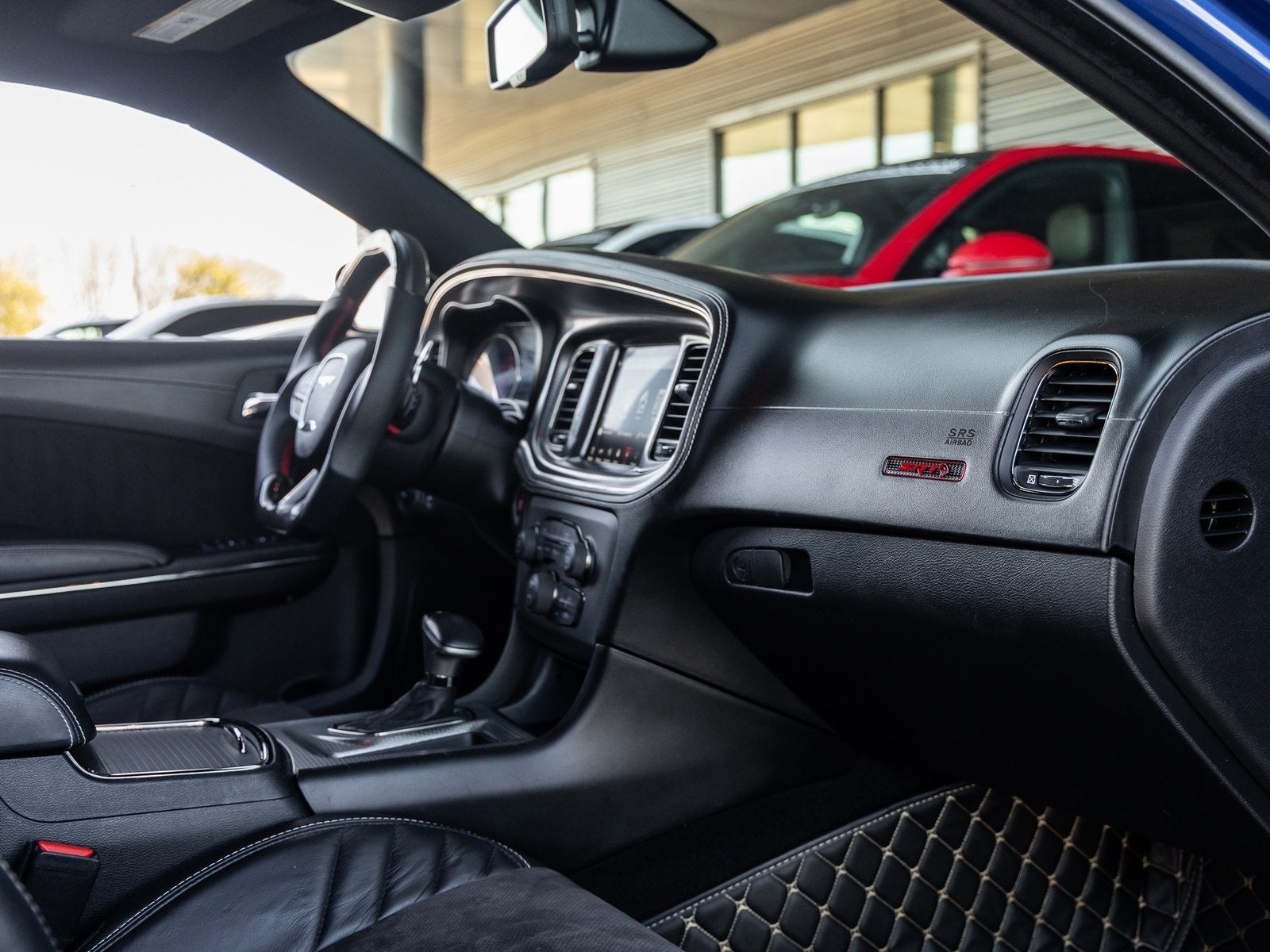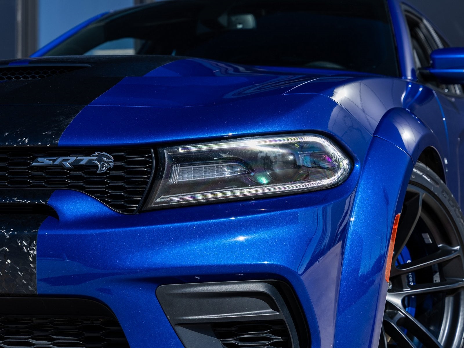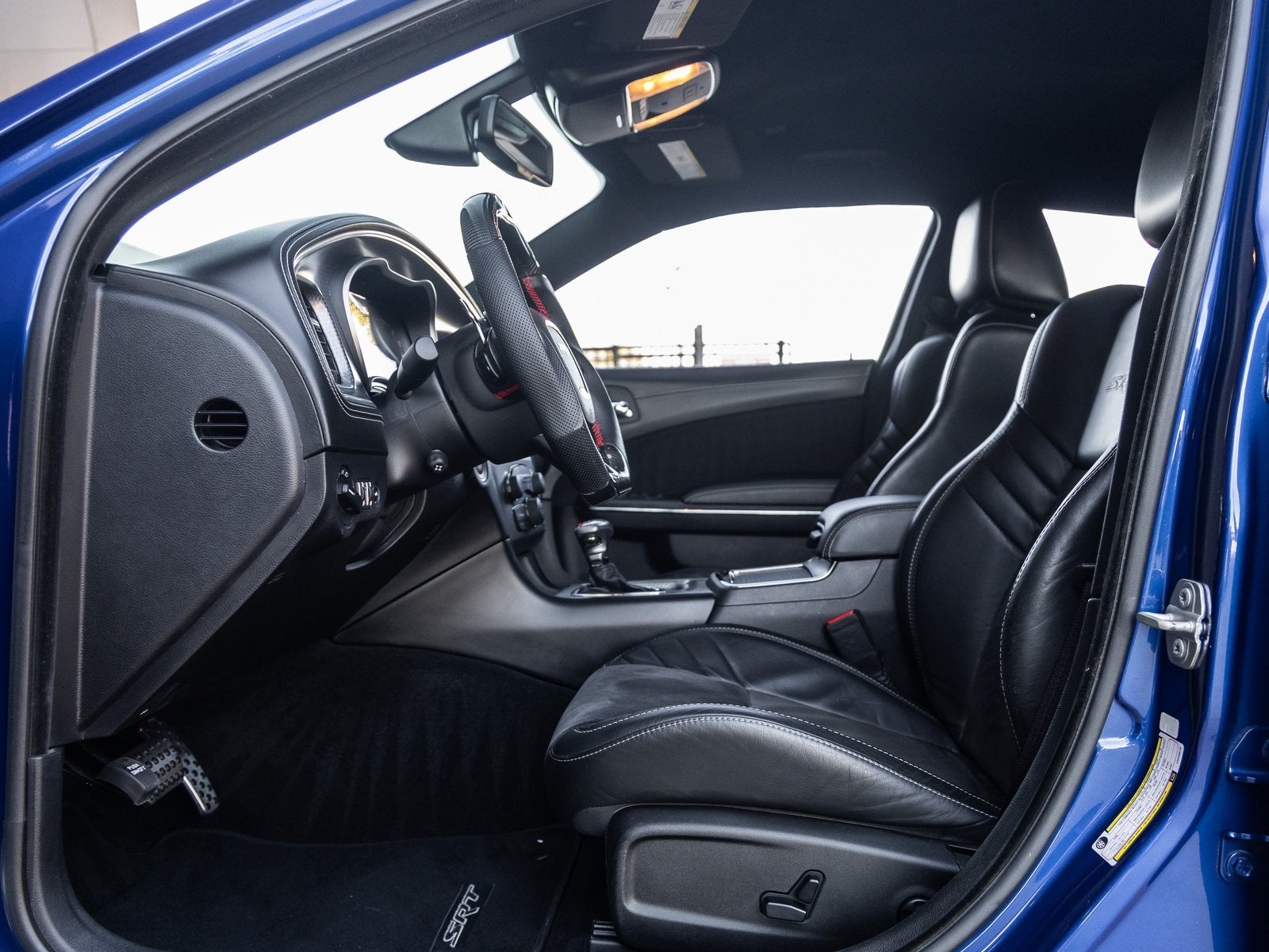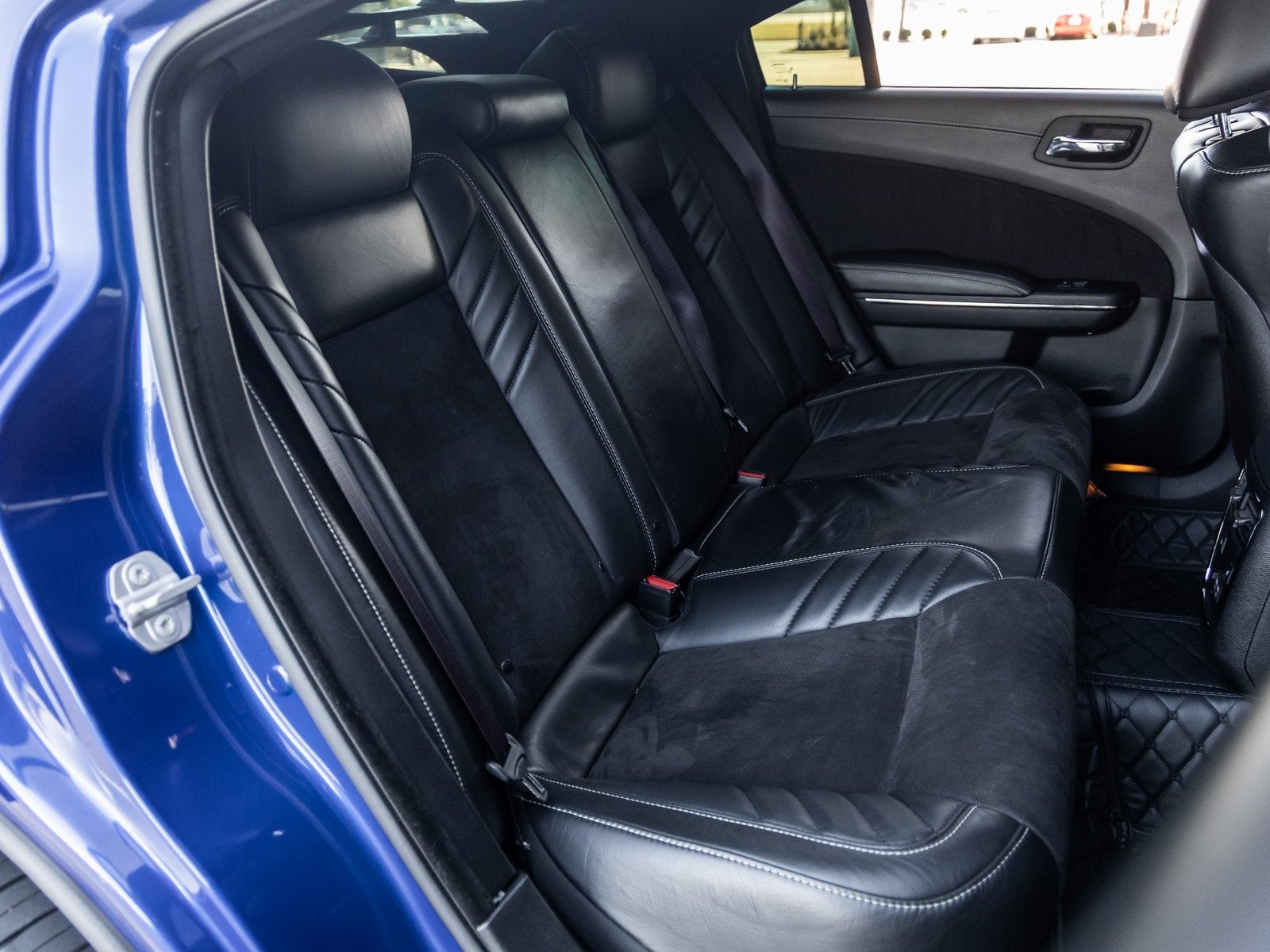 The Charger SRT Hellcat Widebody commands attention with its aggressive stance and unmistakable presence. The Indigo Blue exterior is complemented by the factory Widebody Competition Suspension, 20-inch x 11.0-inch Carbon Black Aluminum Wheels, and SRT Performance Spoiler, giving this sedan both track-ready capability and street-dominating style. Bi-Function HID Projector Headlamps, LED Daytime Running Lamps, and SRT Hellcat Exterior Badges further emphasize its high-performance pedigree, while the Gloss Black Painted Roof adds a menacing finishing touch.
