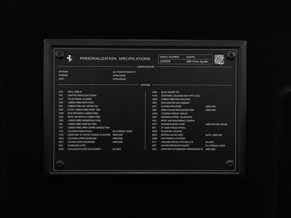 Performance: At the heart of the 488 Pista Spider lies a 3.9-liter twin-turbocharged V8 producing an astonishing 710 horsepower and 568 lb-ft of torque. Paired with Ferraris lightning-fast 7-speed dual-clutch F1 transmission, this open-top supercar rockets from 0-60 mph in approximately 2.8 seconds. Advanced aerodynamics derived directly from Ferraris motorsport expertise, combined with extensive weight-saving carbon fiber components, deliver razor-sharp handling and extraordinary agility. The Pista Spider represents the ultimate expression of Ferraris track-focused engineering in an exhilarating open-air format.