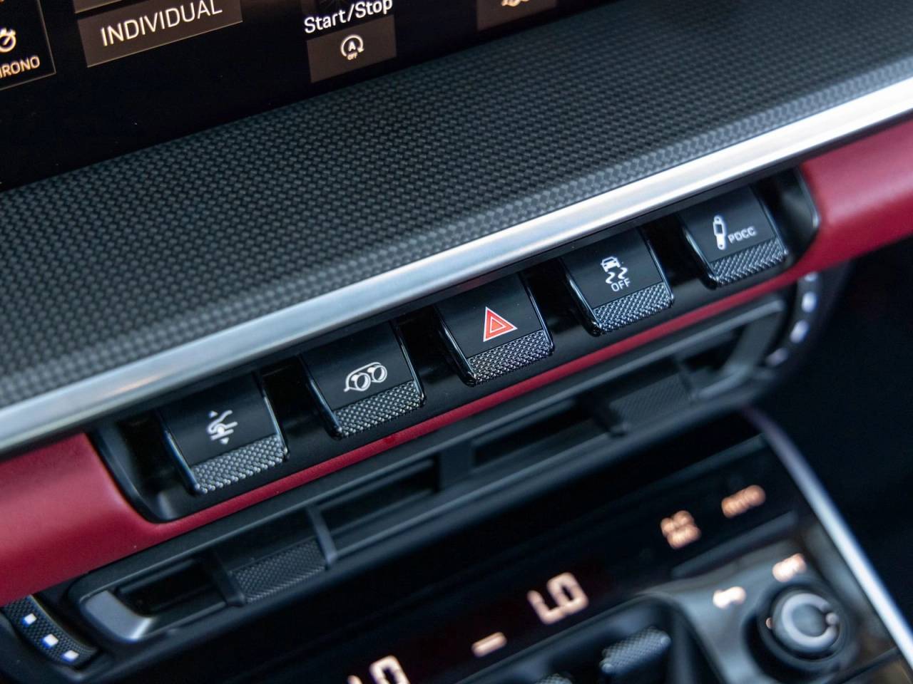 Inside, the cabin reflects a balance of sport and luxury. The Black and Bordeaux Red leather interior is paired with a central tachometer in Guards Red, reinforcing the driver-focused layout. Porsche crests on the headrests add a signature touch, while the deletion of quilting creates a cleaner, more performance-oriented aesthetic. Race-Tex accents on the steering wheel and center console lid, featuring a PORSCHE logo, further emphasize the cars sporting intent.