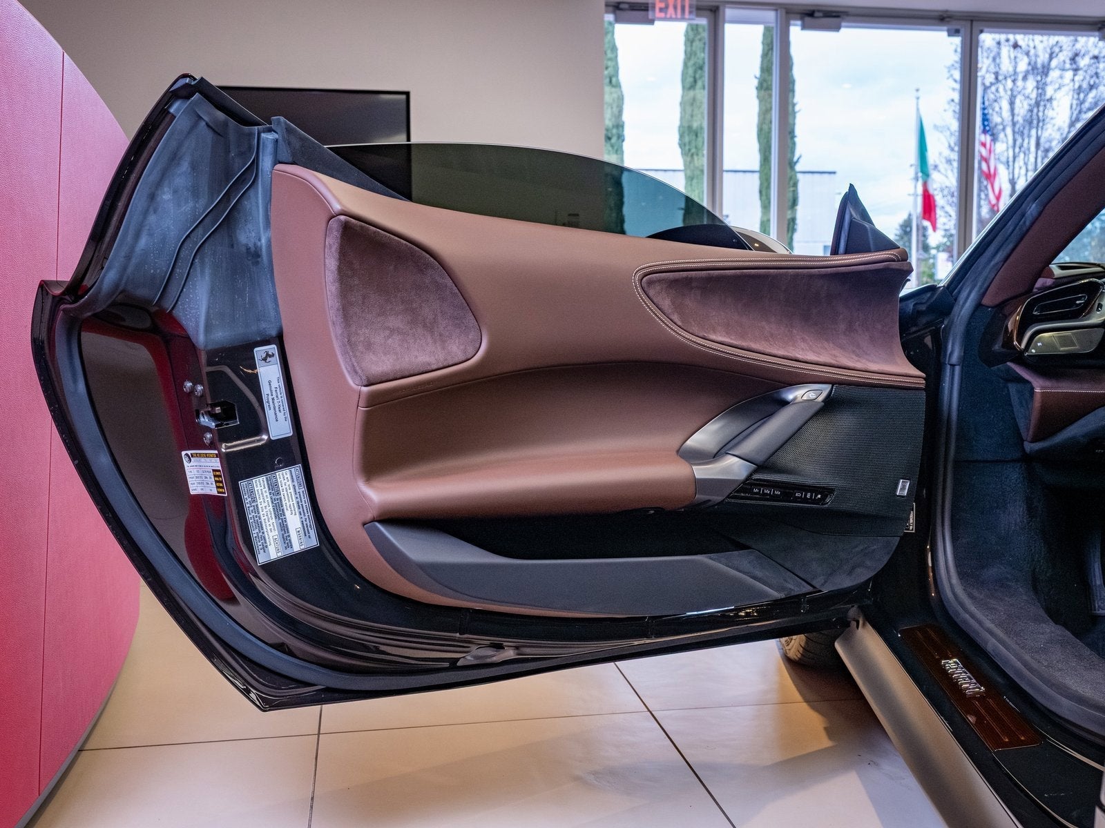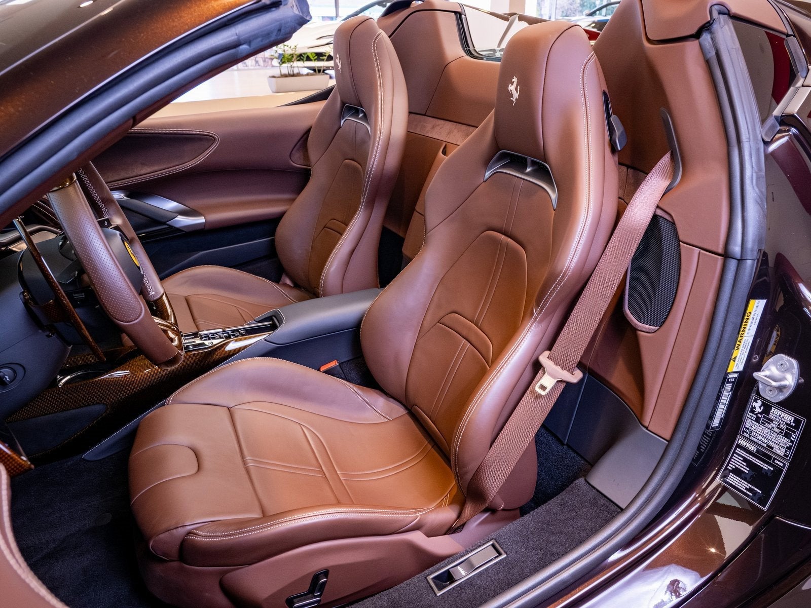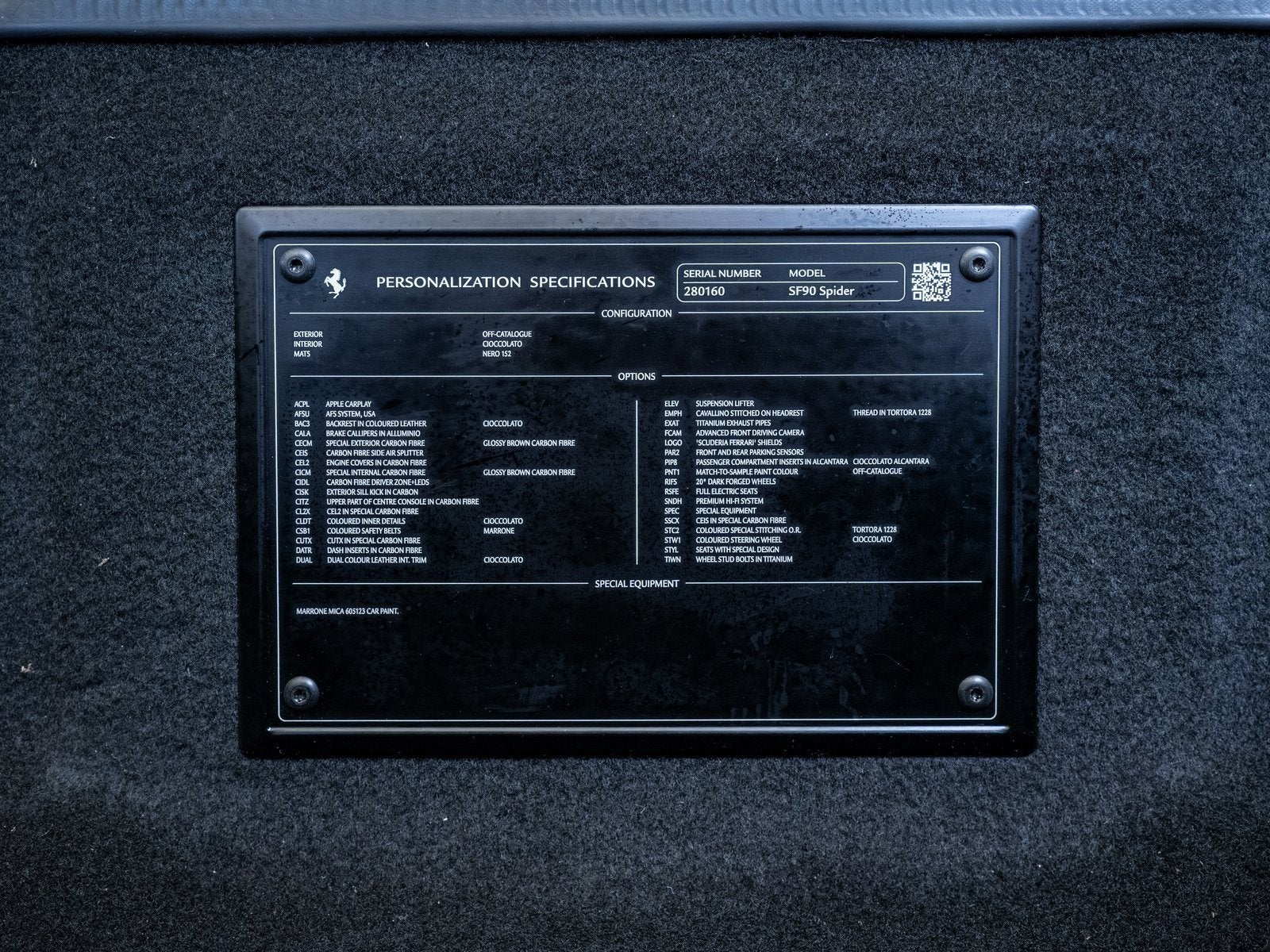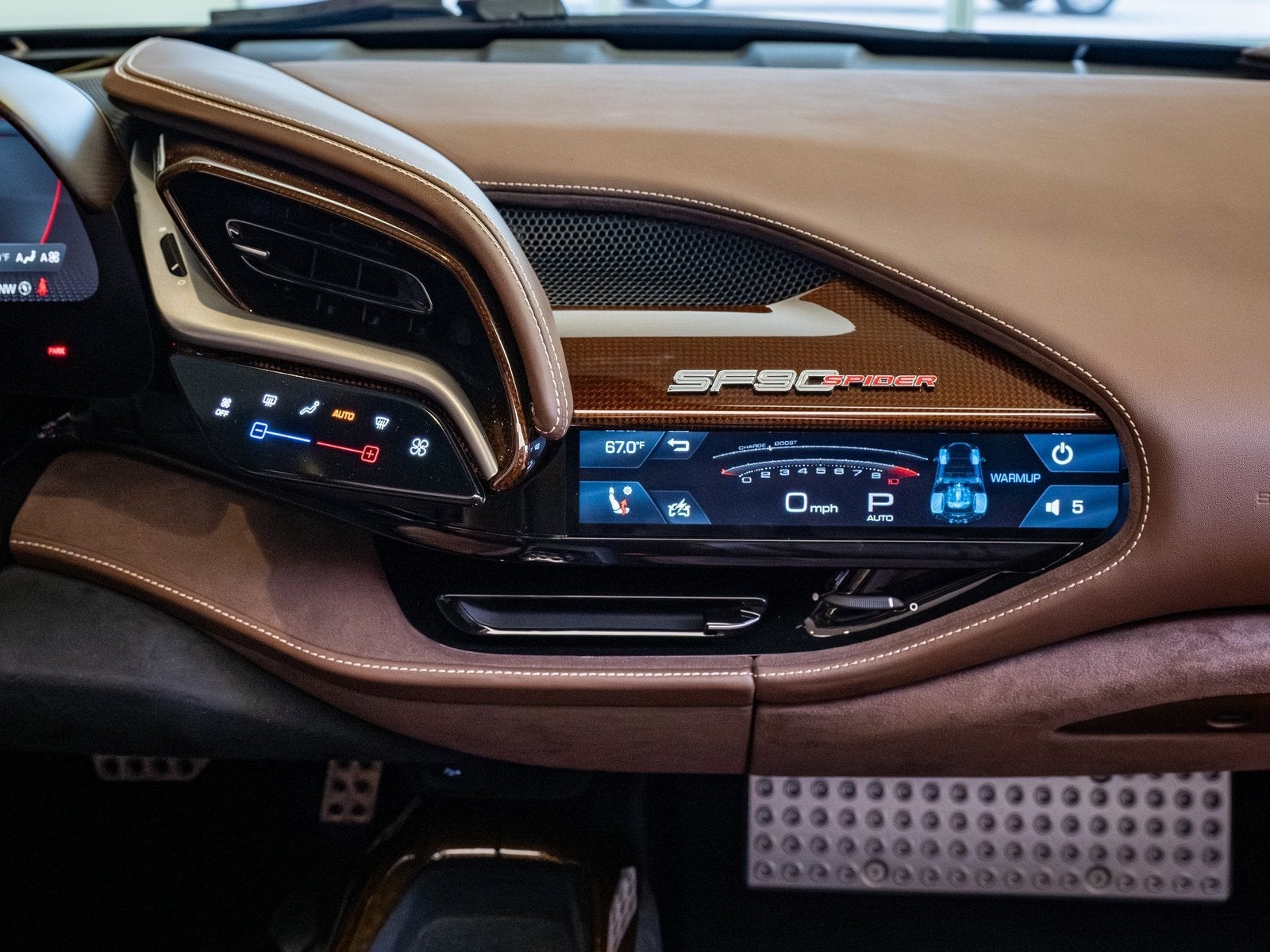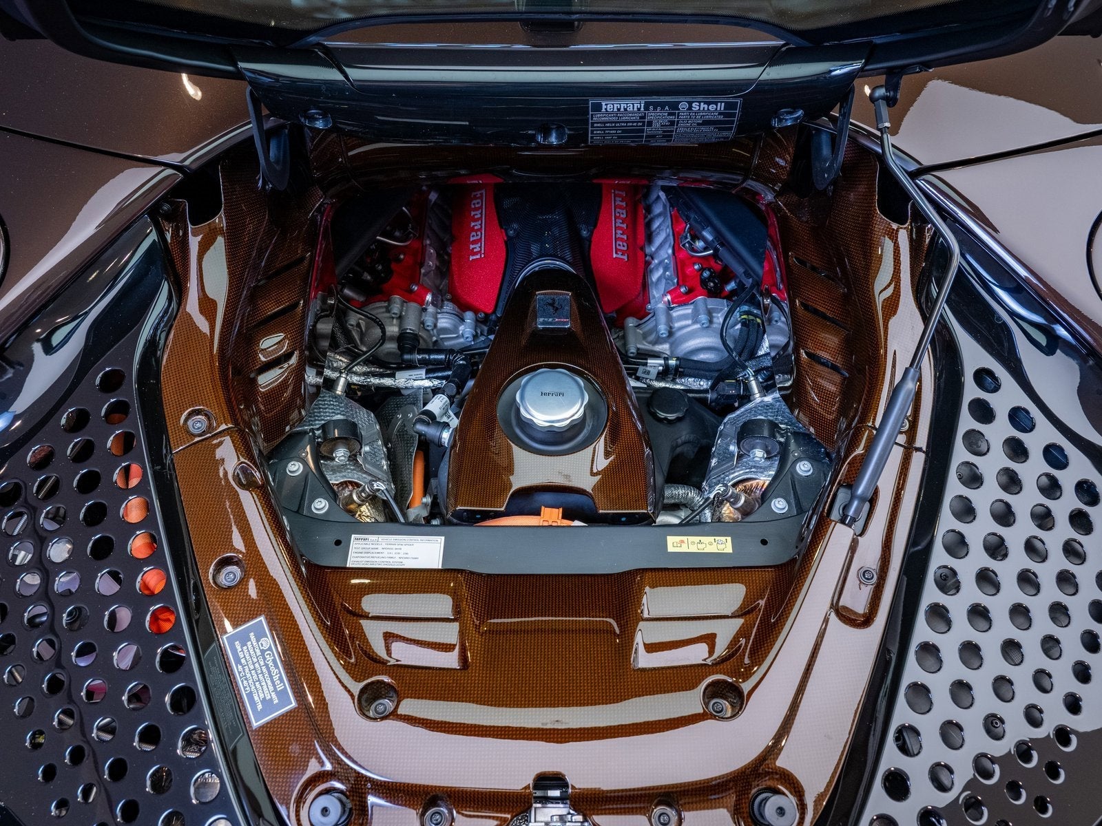 Subtle yet commanding, the exterior is further enhanced by special exterior carbon fiber in Marrone Lucido, seamlessly blending performance aesthetics with elegance. Additional enhancements such as carbon fiber lateral engine air intakes and a carbon fiber engine compartment give this SF90 Spider a refined, motorsport-inspired edge.