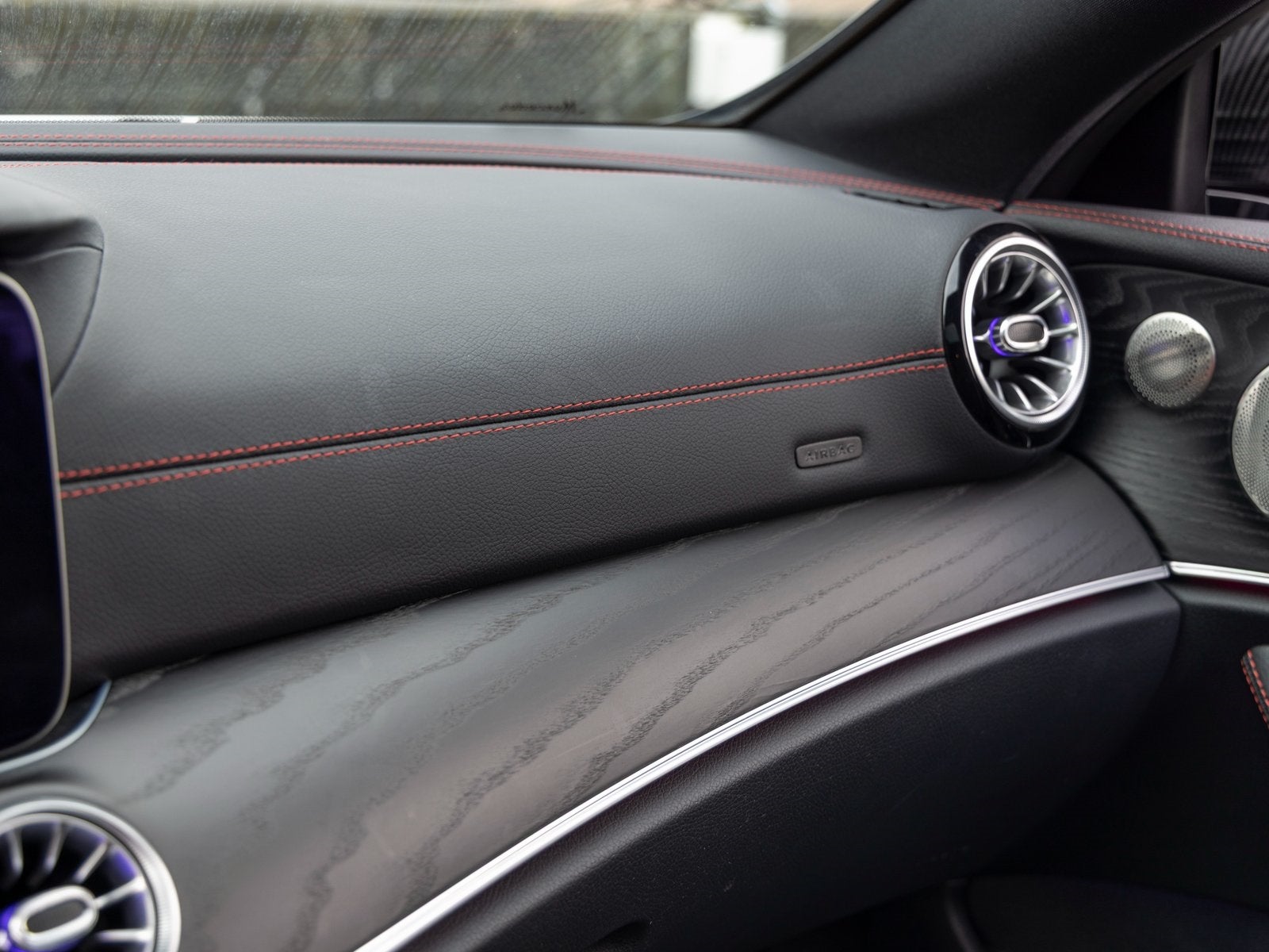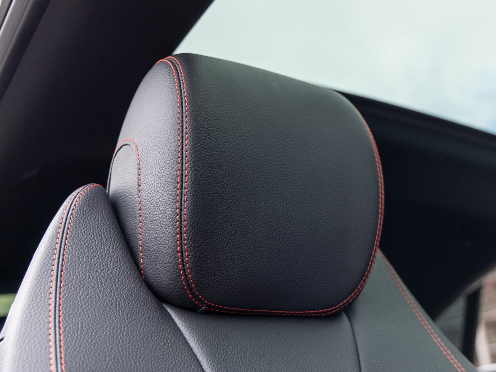 The cabin is appointed in Black MB-Tex and microfiber upholstery with red contrast stitching, creating a sporty yet sophisticated atmosphere. Interior highlights include power-adjustable front seats with lumbar support, dual-zone automatic climate control, ambient lighting, a digital instrument cluster, and a widescreen infotainment system with streaming audio, navigation capability, and premium sound through a multi-speaker audio system. Additional luxury touches such as inductive wireless charging, memory settings, and a power tilt/telescoping steering column enhance everyday comfort.