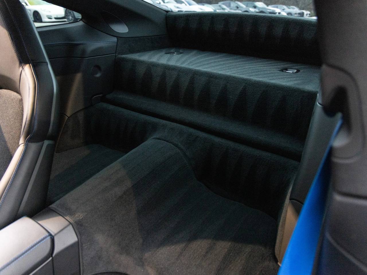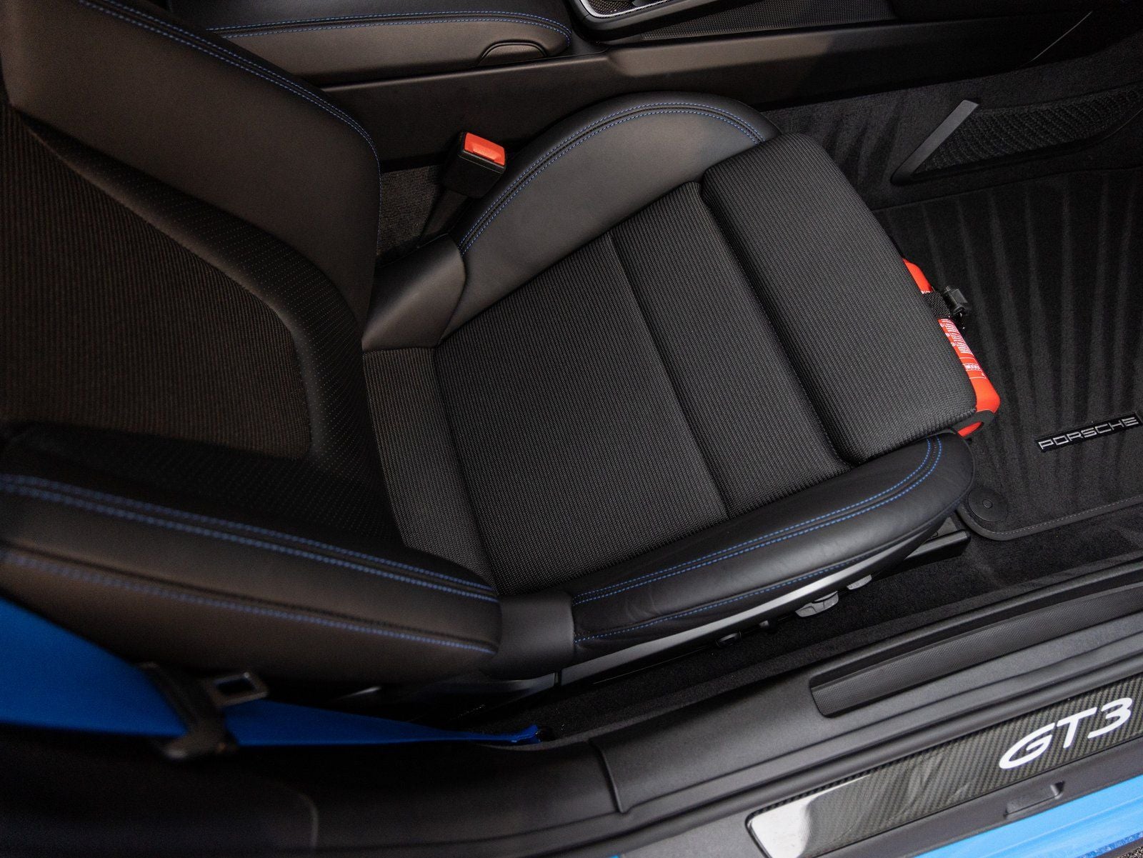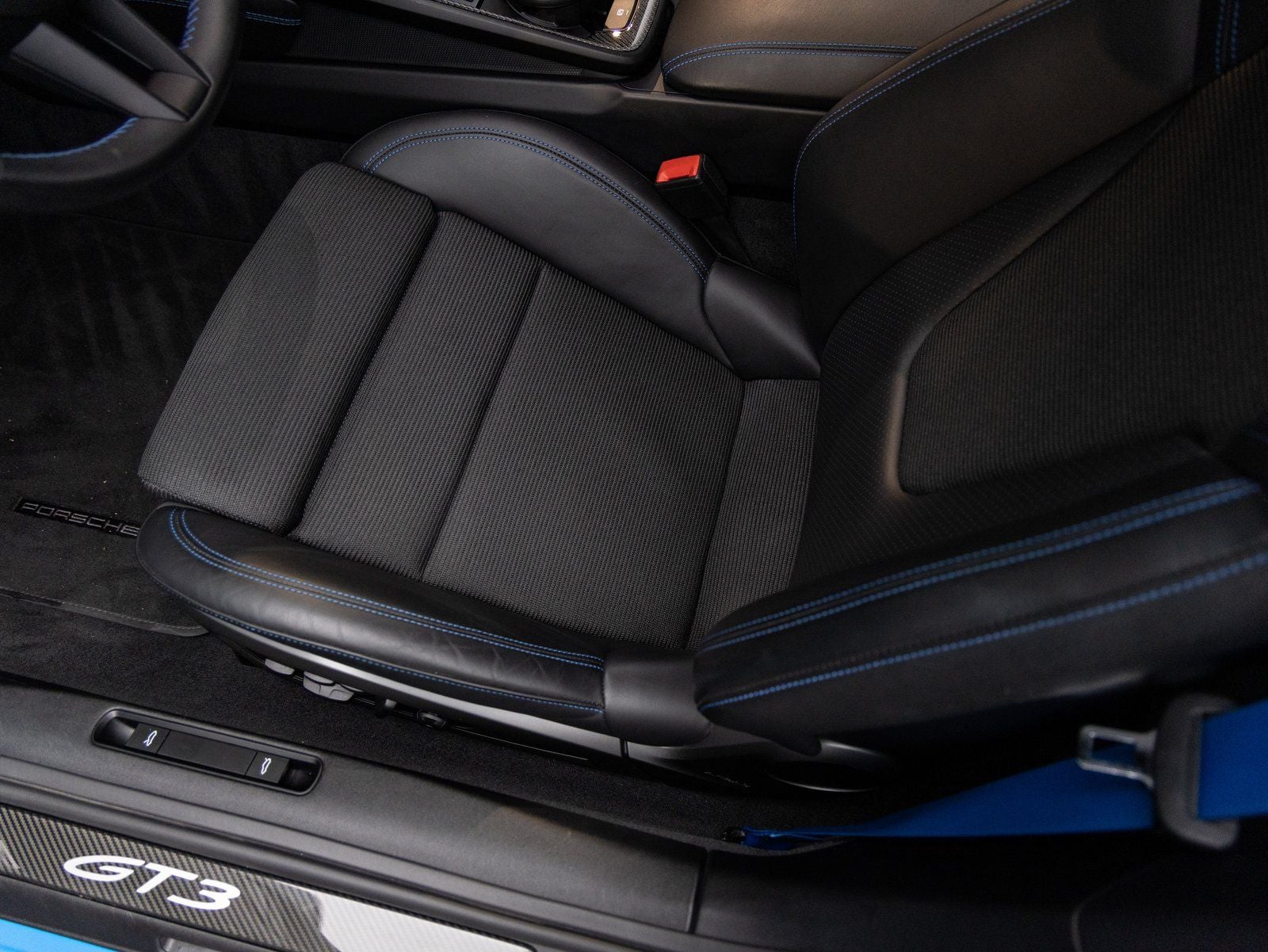 Inside, the cabin blends sport and craftsmanship with Adaptive Sport Seats Plus (18-way), Seat Belts in Shark Blue, and a full Deviated Stitching Interior Package in Speed Blue that extends across the dashboard, door panels, and center console. Additional highlights include Interior Trim Inlays and Door-Sill Guards in High Gloss Carbon Fiber, a Storage Package, and a Fire Extinguisher. Technology features include the BOSE Surround Sound System, LED Headlights in Black with Porsche Dynamic Light System, Auto-Dimming Mirrors with Integrated Rain Sensor, and ParkAssist (Rear).