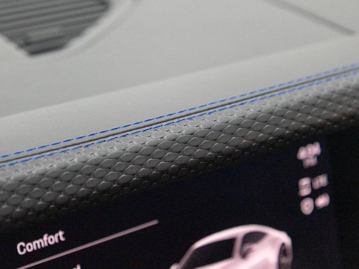 • Center Console Lid with Deviated Stitching - Speed Blue: A luxurious detail that reinforces the cabins exclusivity.