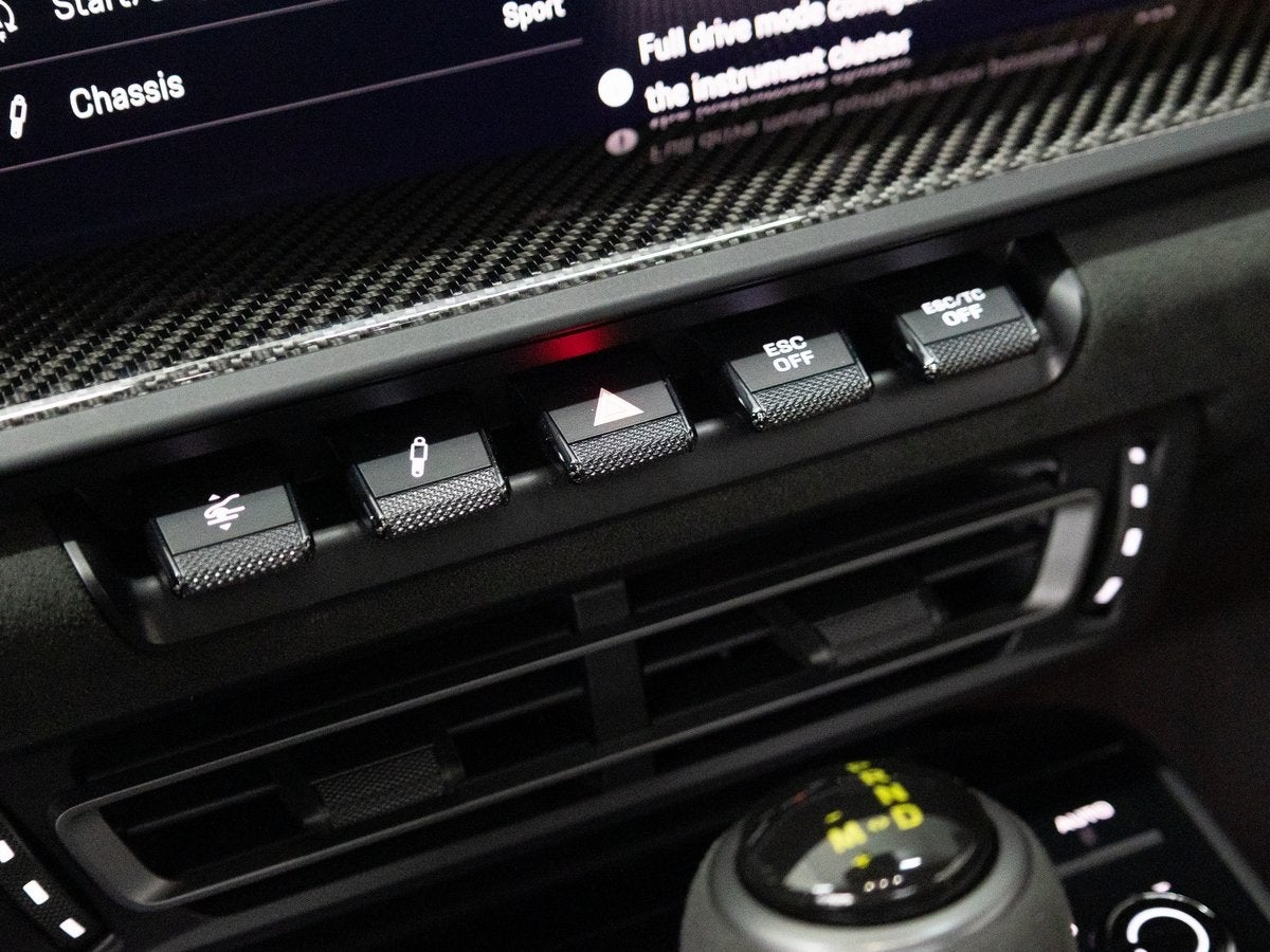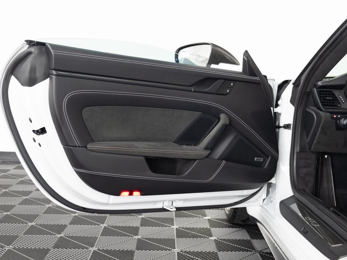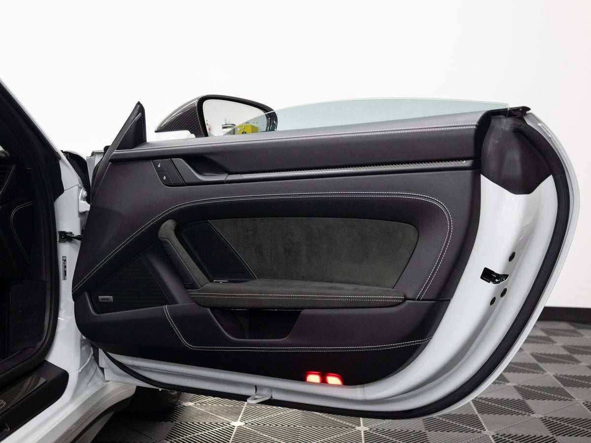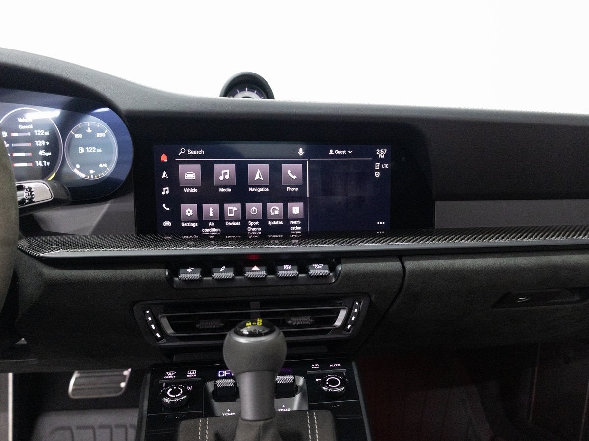 Step inside and the Leather/Race-Tex Interior in Black with Stitching in GT Silver greets you, exuding an air of luxury that only Porsche can deliver. The Full Bucket Seats and Seat Belts in Racing Yellow punctuate the interior with a sporty flair. The Extended Leather Package in GT Silver, Steering Column Casing in Leather, and Personalized Floor Mats with Leather Edging speak to a bespoke level of craftsmanship. The Center Console Lid in Race-Tex with Porsche Crest and Interior Trim Inlays and Door-Sill Guards in High Gloss Carbon Fiber further elevate the experience.