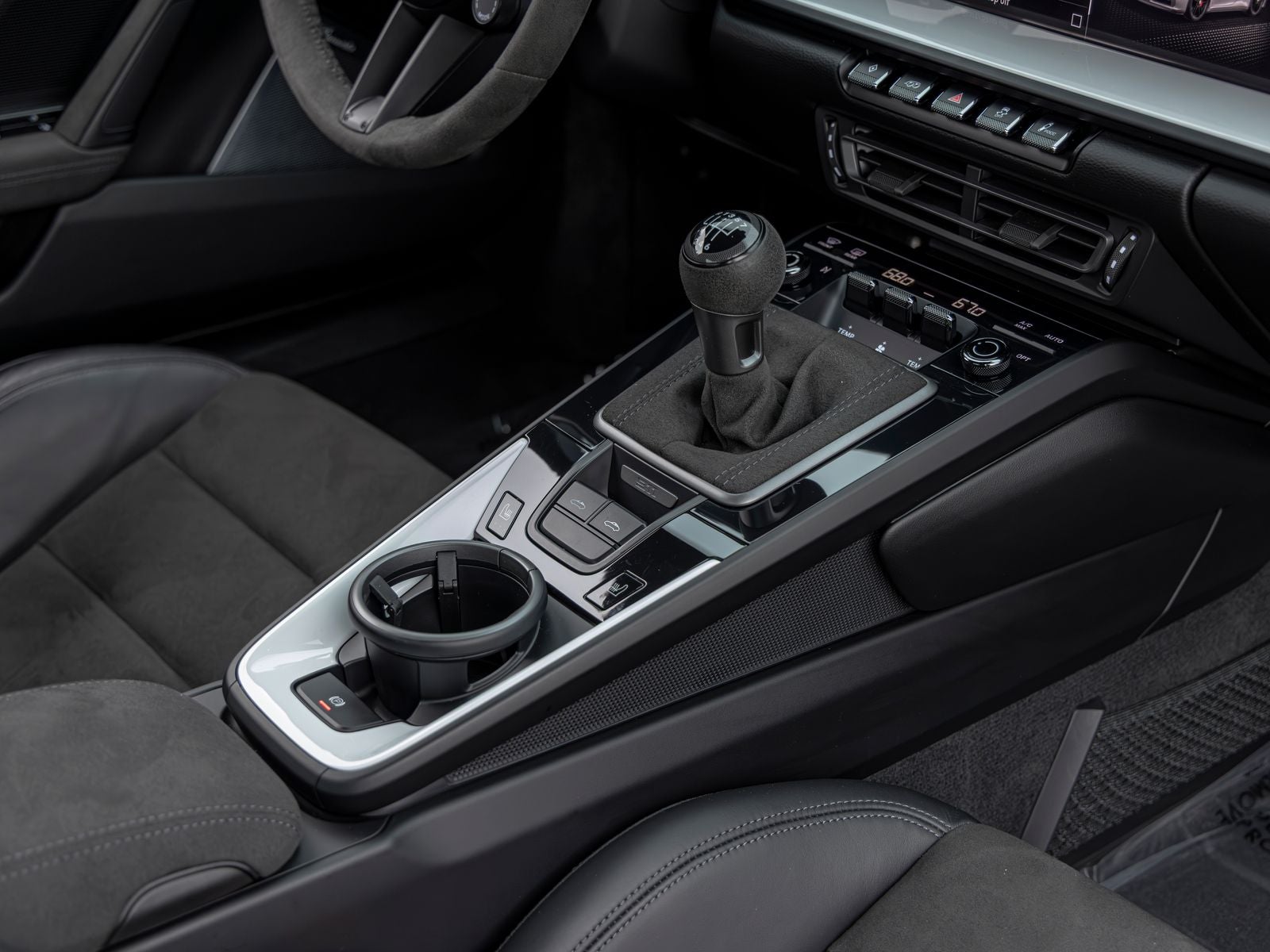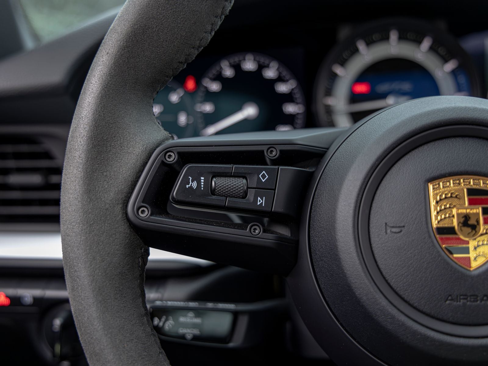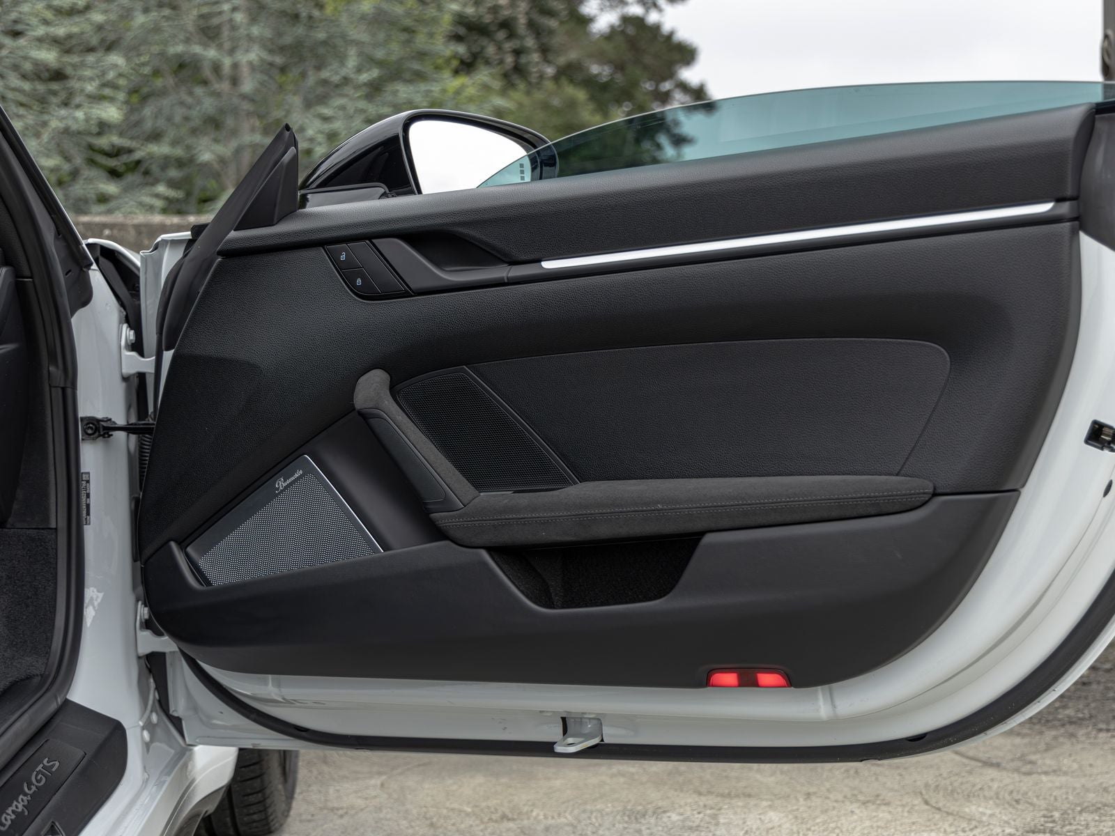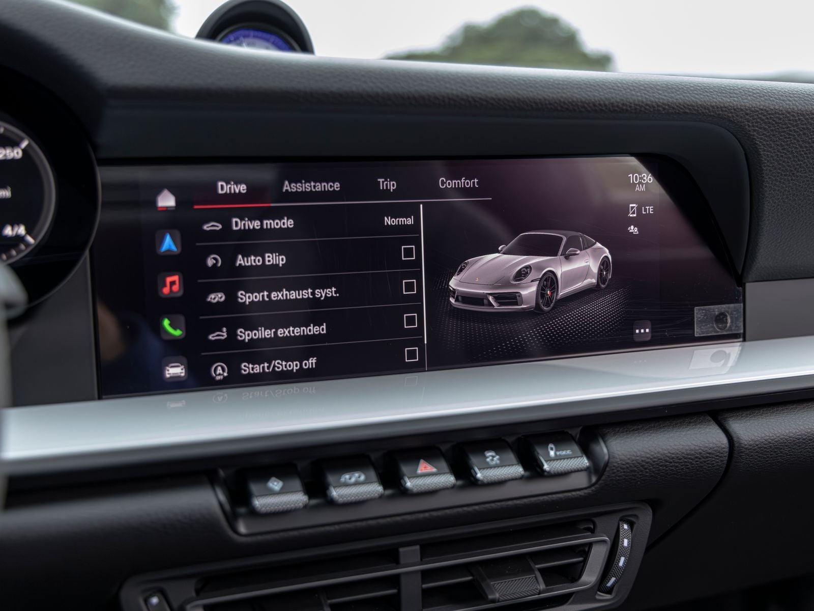 Inside, the cabin is both sporty and refined, featuring Race-Tex upholstery, interior trim inlays painted in the exterior color, and carefully selected white instrumentation including the central tachometer and Sport Chrono stopwatch dial. Ambient lighting and the ionizer contribute to a comfortable and modern interior environment.