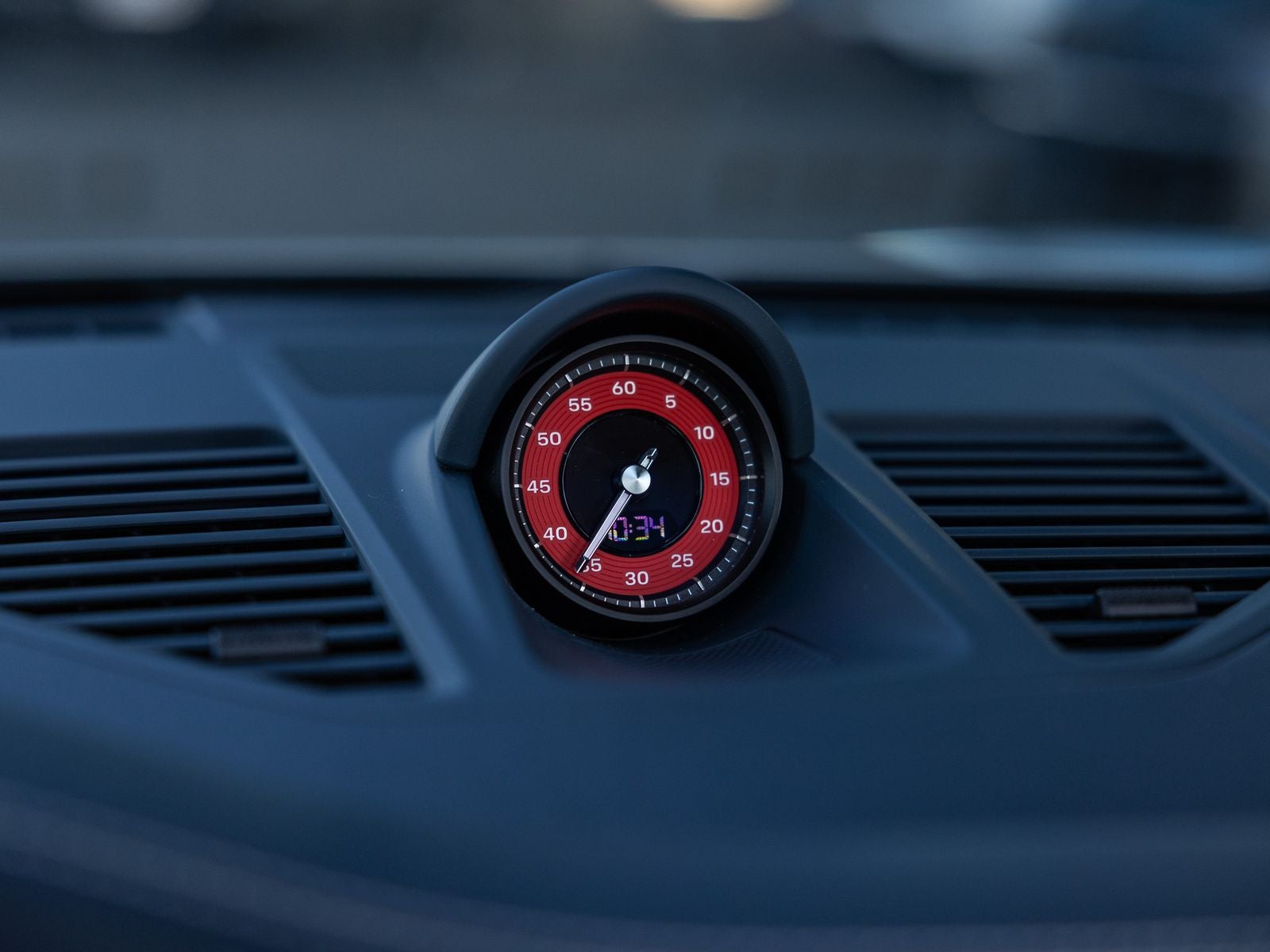 Tailored details: Targa Bar in Black, Porsche crests on front headrests, Seat belts in Chalk, Stopwatch dial in Guards Red