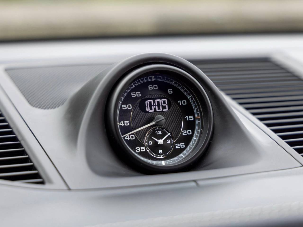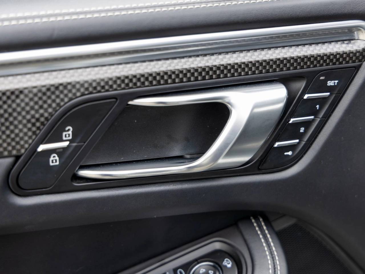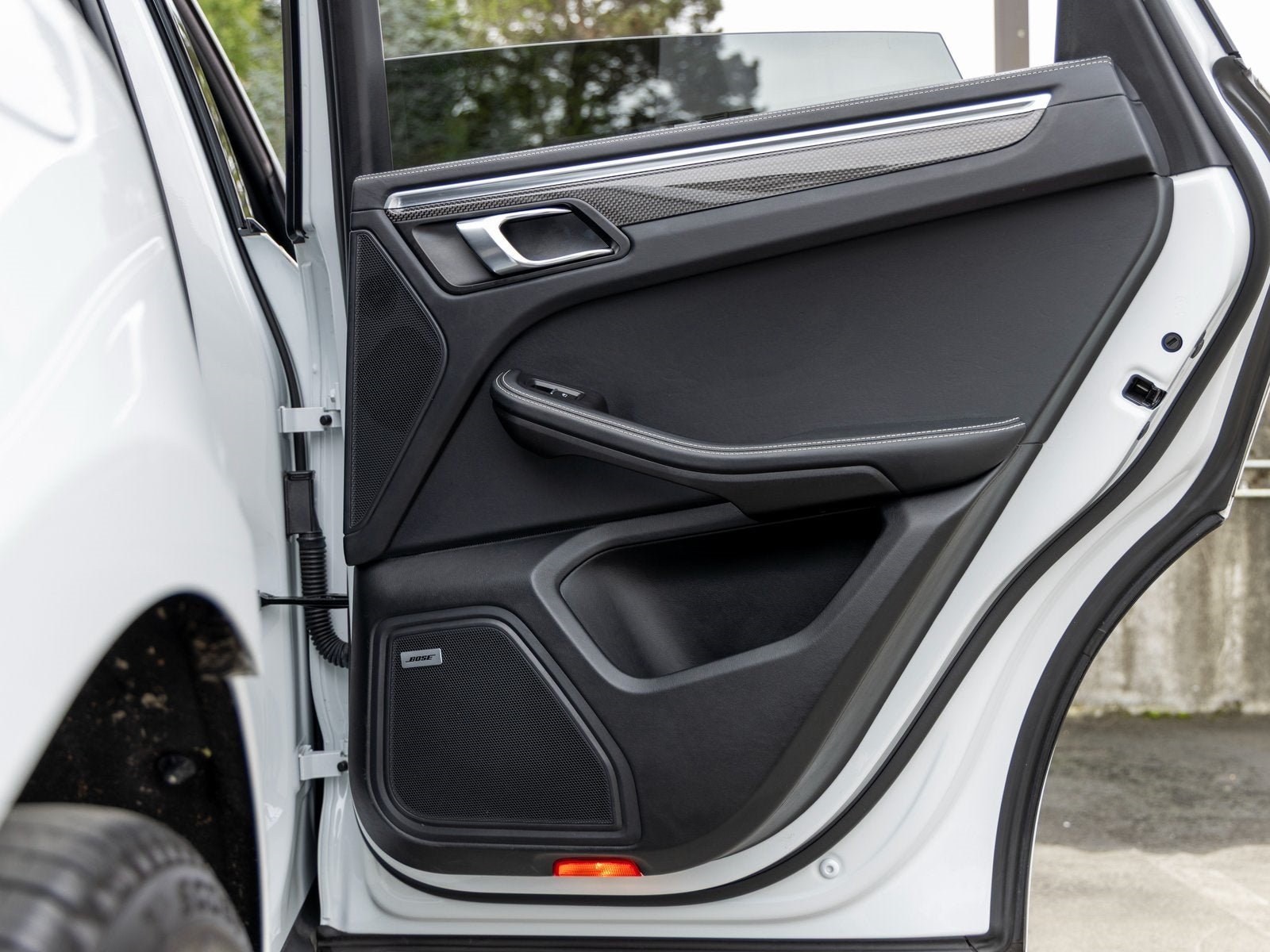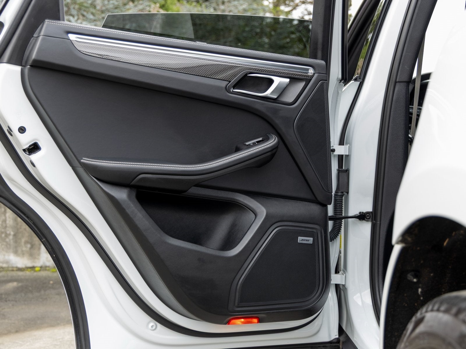 Interior details showcase Porsches attention to craftsmanship, featuring carbon fiber interior trim, Porsche crests embossed on the front and rear headrests, and distinctive Chalk deviated stitching that adds a tailored, high-end feel throughout the cabin. Rear side window sunblinds further enhance passenger comfort.