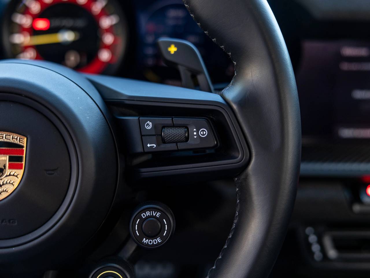 Purposeful options such as the Front Axle Lift System and Extended Range Fuel Tank add usability, while distinctive details including Satin Pyro Red wheels, Pyro Red accent package logos, carbon fiber door-sill guards, and a Guards Red central tachometer and chronograph stopwatch dial highlight the car’s motorsport DNA. Additional equipment includes LED-Matrix Design Headlights in Black with PDLS+, Exclusive Design taillights, BOSE® Surround Sound System, fire extinguisher, and carbon fiber floor mats with leather edging.