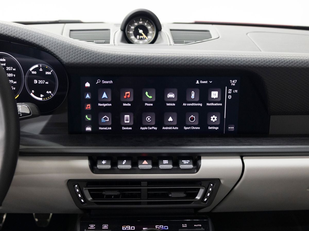 - Radio: Porsche Communication Management (PCM) -inc: online navigation module, Connect Plus (wireless Apple CarPlay and wireless Android Auto, LTE communication module, wireless internet access and numerous Porsche Connect Services), SiriusXM w/3-month Platinum Plan trial subscription, integration of Apple Music, Apple Podcasts and Spotify, Track Precision app, voice pilot w/natural language understanding and activation via Hey Porsche, navigation plus w/real time traffic Information and online map update and sound package plus (analog sound system, 8 loudspeakers, 150-watt total output w/integral amplifier and digital signal processing)