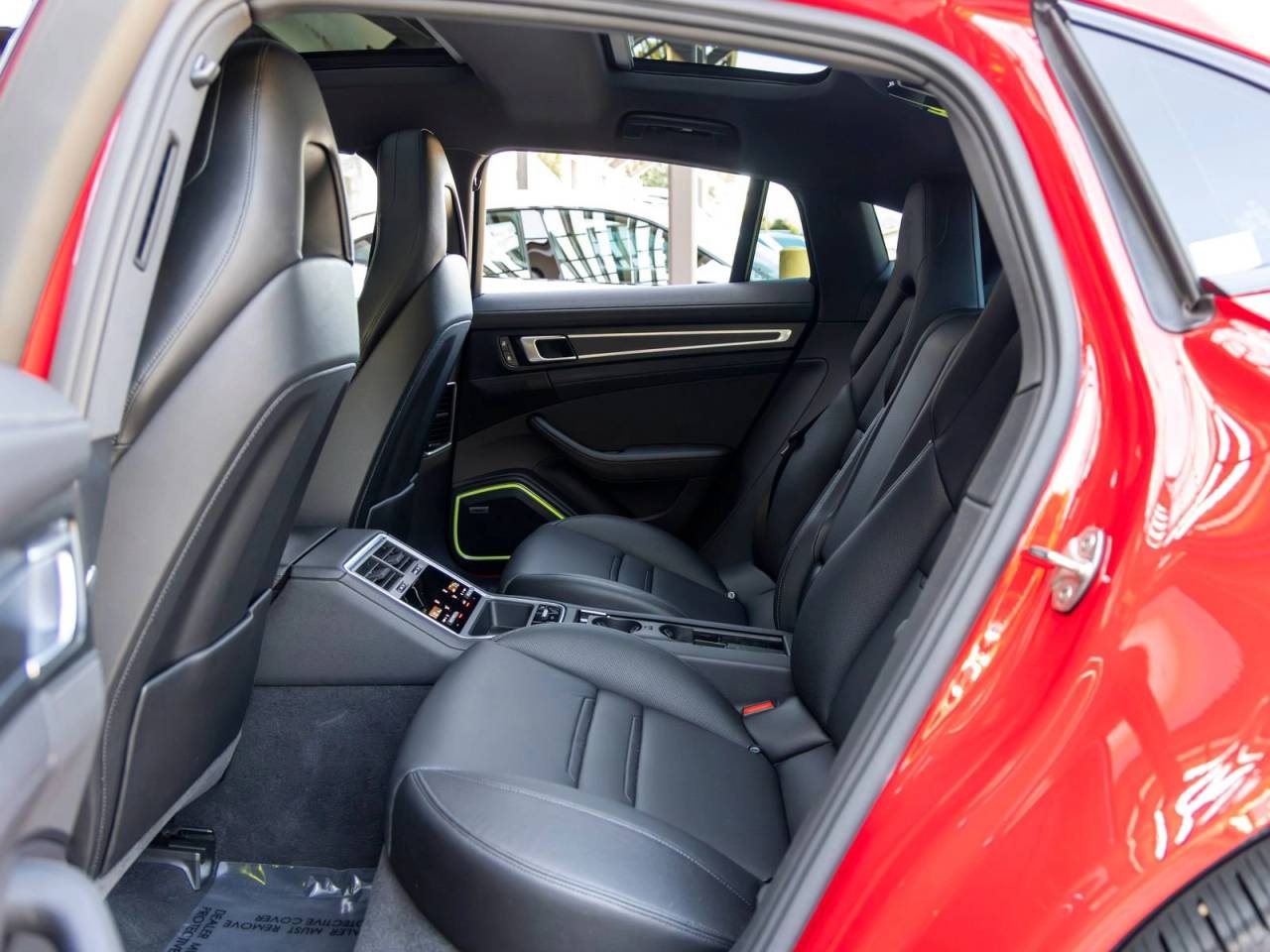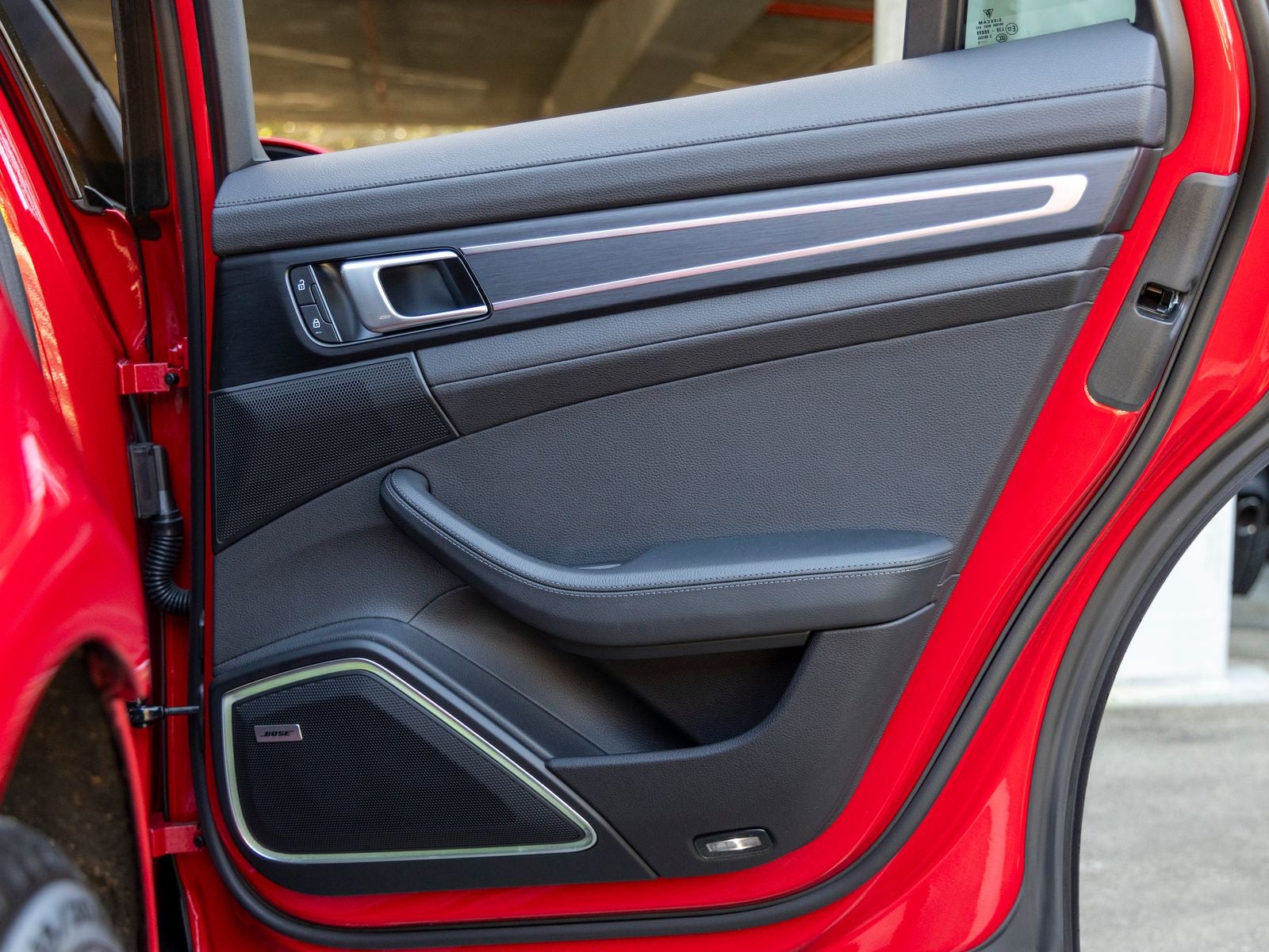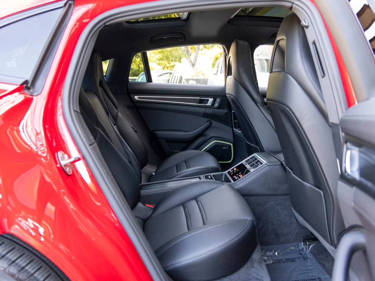 The exterior stands out in Carmine Red, complemented by 21 Exclusive Design wheels in High Gloss Black and painted air outlet grilles, adding a refined yet sporty character. Its sleek silhouette reflects Porsches signature design language while maintaining the practicality of a four-door platform.