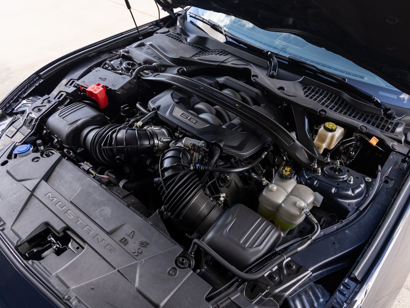 Dark Horse Appearance Package: Includes black painted roof, blue brake calipers, and gloss black hood stripe for a sinister, race-ready look.