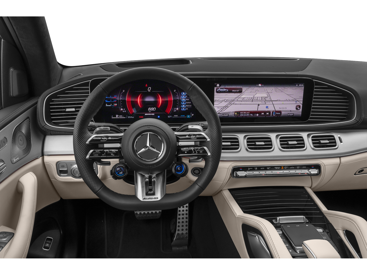 Step inside and the AMG Macchiato Beige / Black Exclusive Nappa Leather interior surrounds you in handcrafted luxury. Highlights include Multicontour Front Seats with Massage, Heated & Ventilated Front Seats, Heated Steering Wheel, Panorama Sunroof, Burmester Surround Sound System, Head-Up Display with AMG Content, and striking MANUFAKTUR Black Piano Lacquer Flowing Lines Wood Trim.
