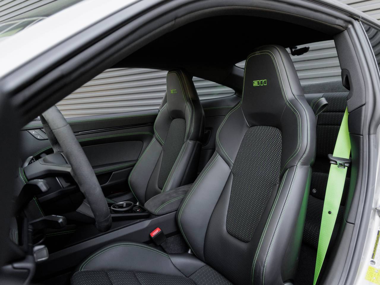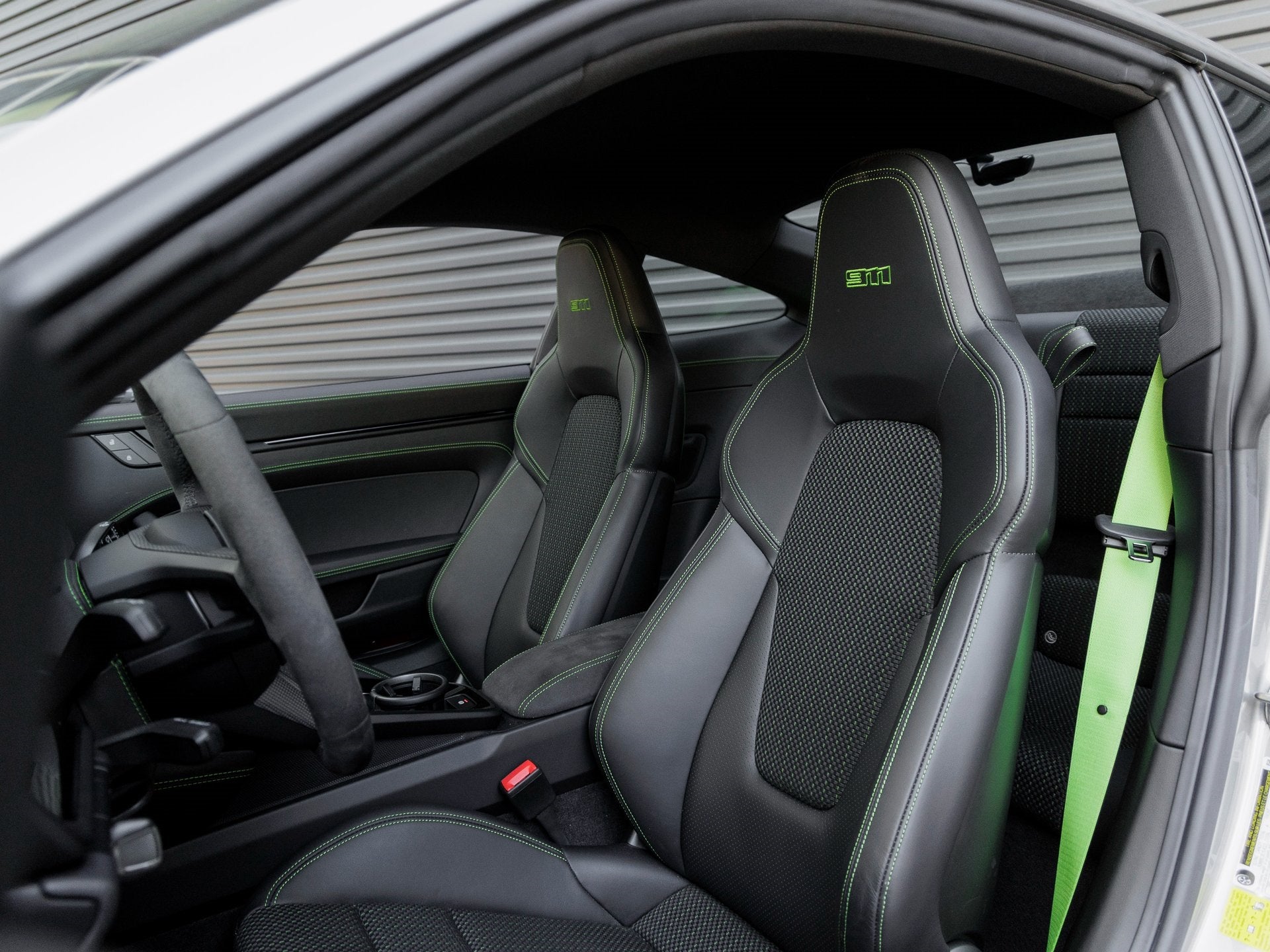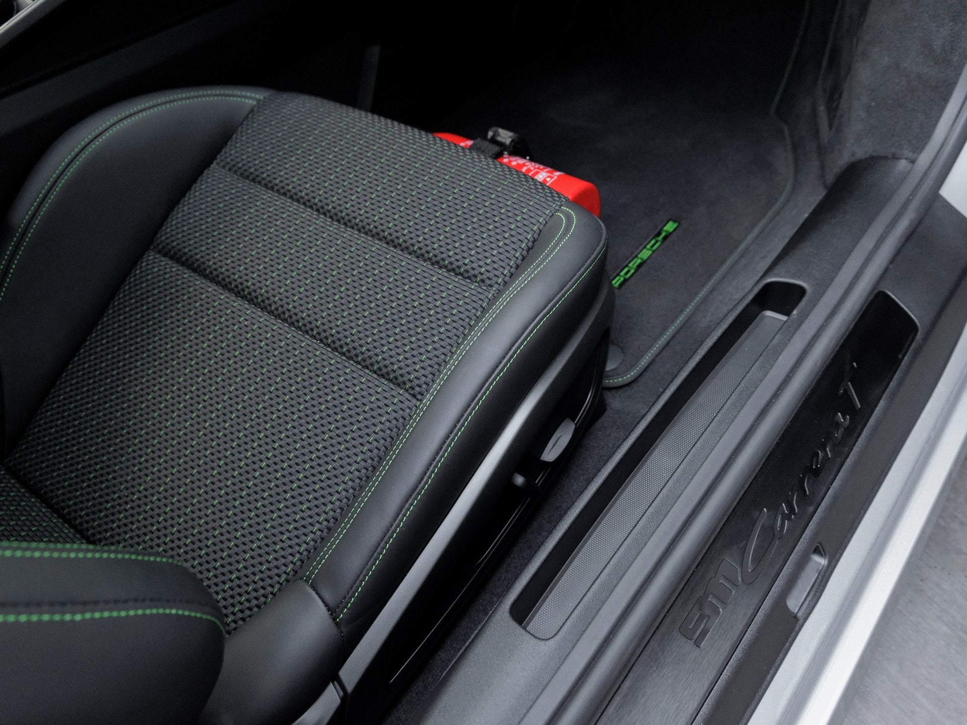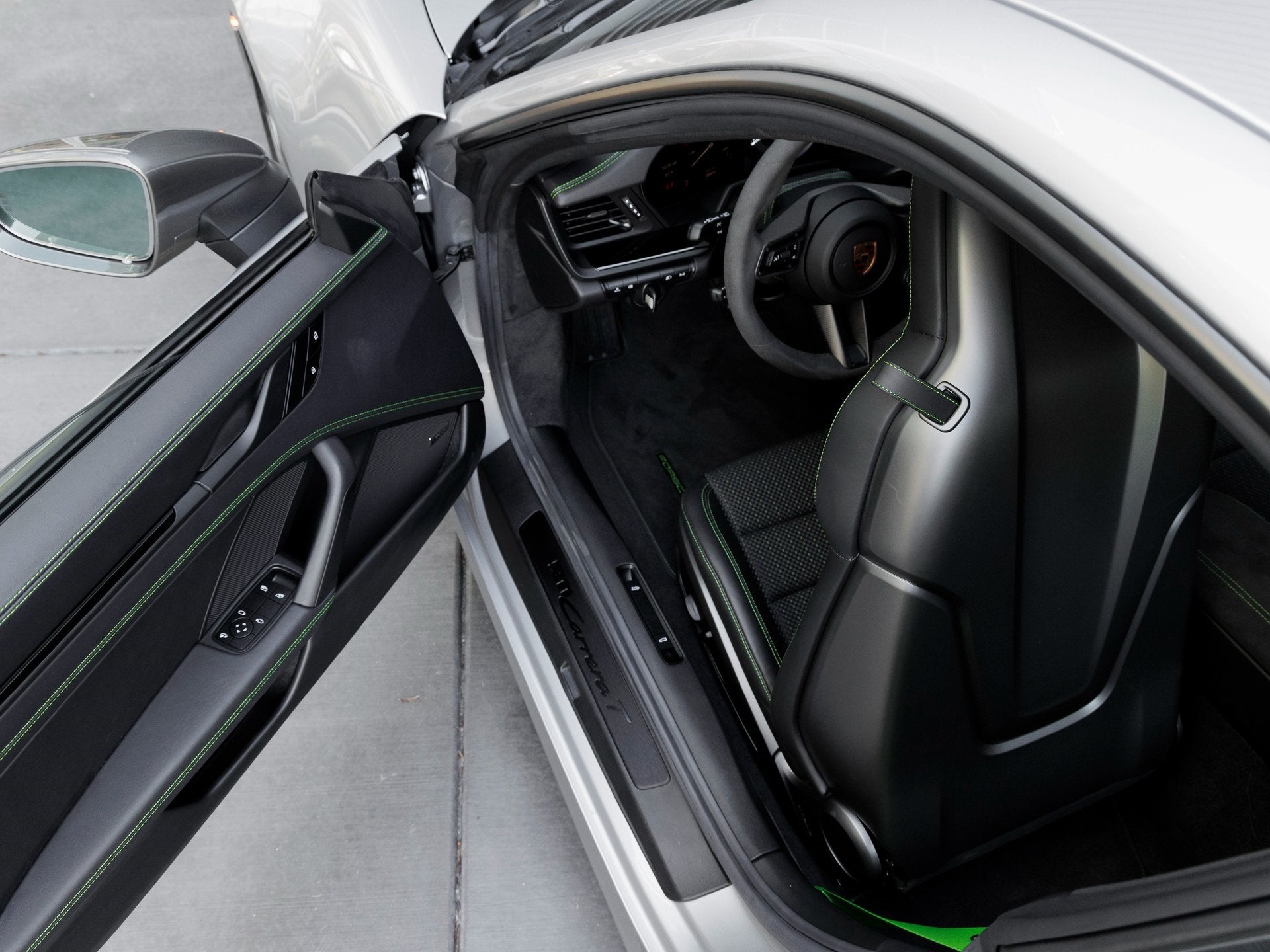 Step inside and you are greeted by a cabin designed around the driver. The Black interior with Lizard Green Deviated Stitching delivers a bold contrast, emphasizing the Carrera Ts bespoke character. The Heated GT Sport Steering Wheel in Race-Tex with Trim in Matte Carbon Fiber offers exceptional grip and comfort, while the Steering Column Casing in Leather and Center Console Lid in Race-Tex with PORSCHE Logo elevate the tactile experience. Practicality is enhanced with the Storage Package and Rear Seats, while safety and preparedness are underscored by the inclusion of a Fire Extinguisher. Premium audio is delivered through the BOSE Surround Sound System, and modern technology is rounded out with Ambient Lighting, Preparation for Porsche Dashcam (Front and Rear), and advanced lighting via Porsche Dynamic Light System Plus (PDLS+).