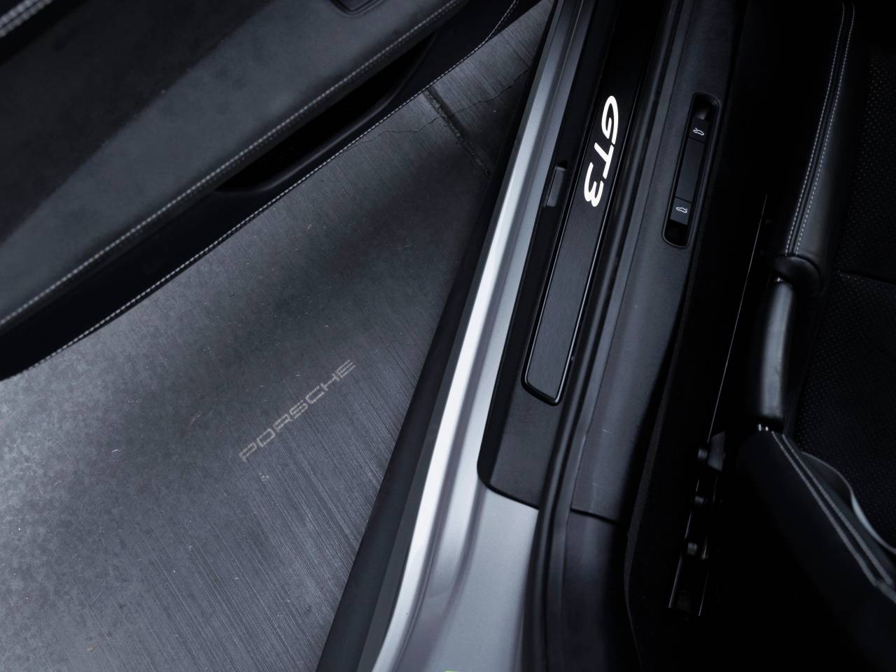 The 911 GT3 stands as a beacon of design and performance, its GT Silver Metallic exterior not just a color, but a badge of honor that reflects Porsche's illustrious racing heritage. Equipped with a Carbon Fiber Roof, LED-Matrix Design Headlights in Black including Porsche Dynamic Light System Plus (PDLS+), and Wheels painted in Satin Black, it presents a striking and purposeful appearance. Additional exterior details such as Carbon Fiber Mirror Upper Trims and Window Triangle Trims, the Exclusive Design Fuel Cap, and Under Door Puddle Light Projectors contribute to its bespoke character.
