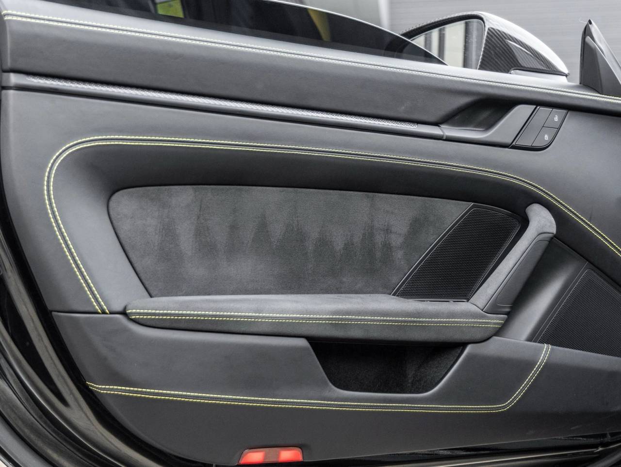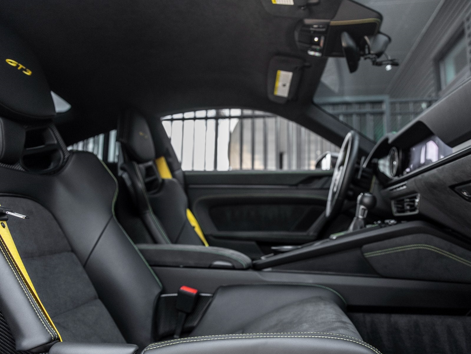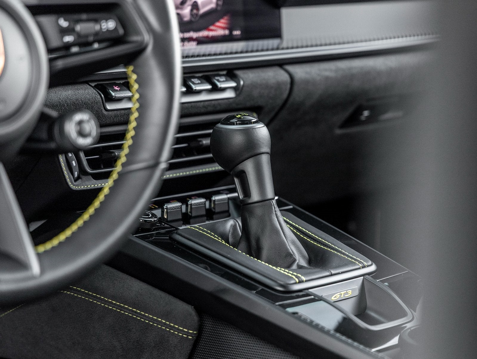 Inside, the Leather/Race-Tex Interior in Black with GT Silver Stitching delivers both comfort and motorsport influence. Highlights include Full Bucket Seats, Carbon Fiber trim, Racing Yellow deviated stitching, and BOSE Surround Sound. Touches like Air Vent Surrounds in Leather with Painted Slats, Race-Tex Sun Visors, Center Console Lid with Porsche Crest, and Personalized Floor Mats with Leather Edging reinforce the GT3s bespoke appeal.