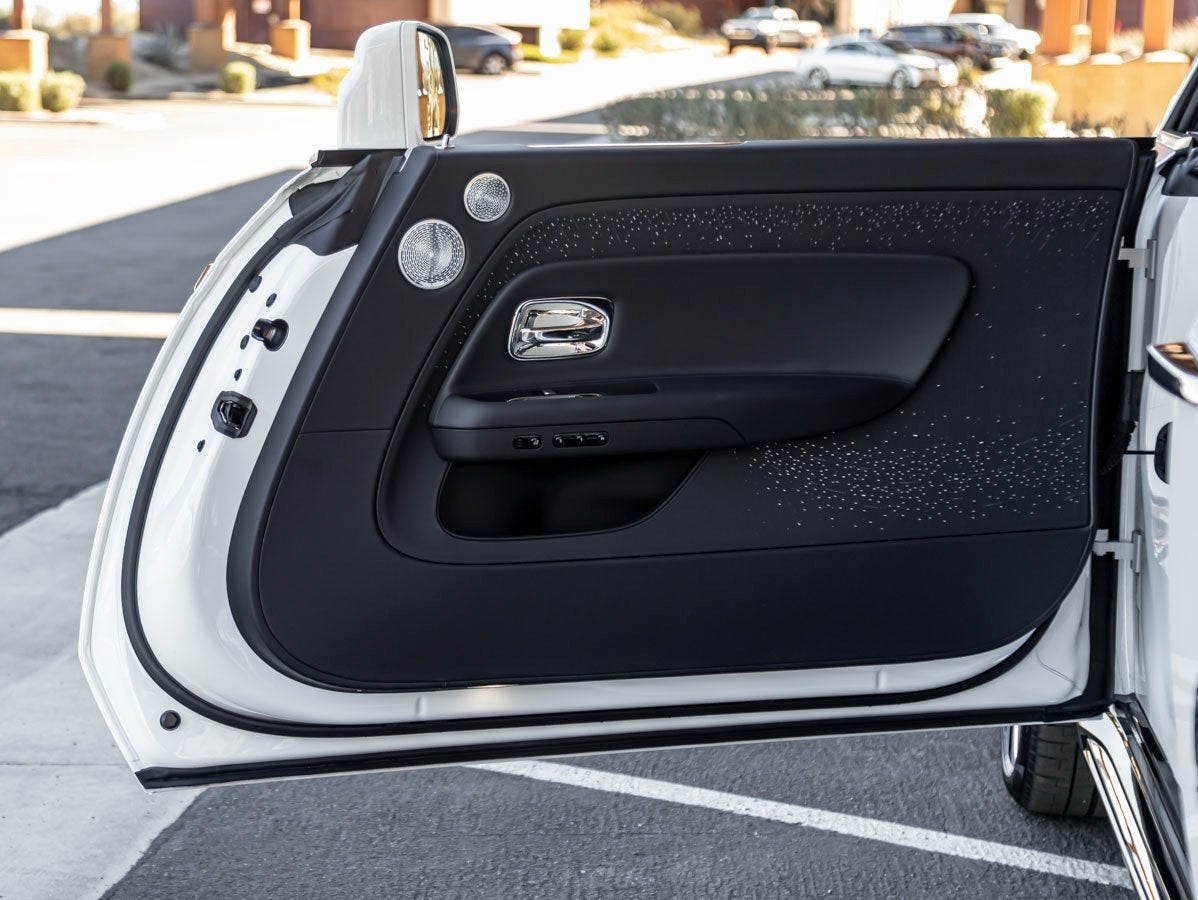 Inside, the Spectre reveals a serene sanctuary crafted to the highest bespoke standards. The cabin is appointed in rich Black leather, accented by Grace White contrast stitching, seat piping, and inner stitch for a subtle yet luxurious contrast. The Mono Interior Environment, Open Pore Obsidian Ayous, and Veneered Steering Wheel Spokes elevate the interior with warmth and texture, while Lambswool Footmats add an indulgent finishing touch. Iconic Starlight Doors and the Illuminated Fascia transform every drive into an immersive experience of light, craftsmanship, and calm.